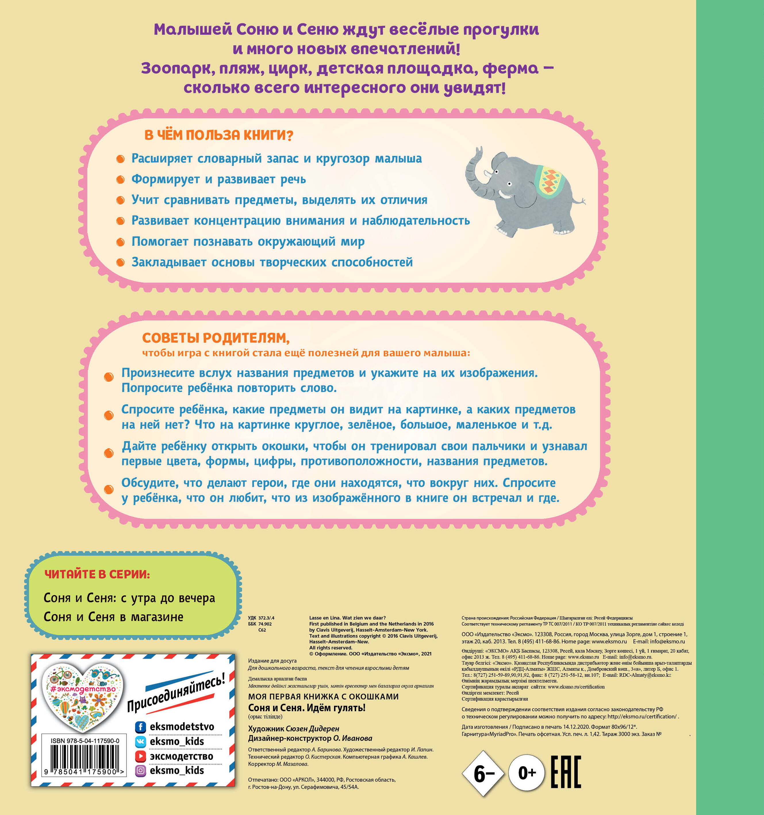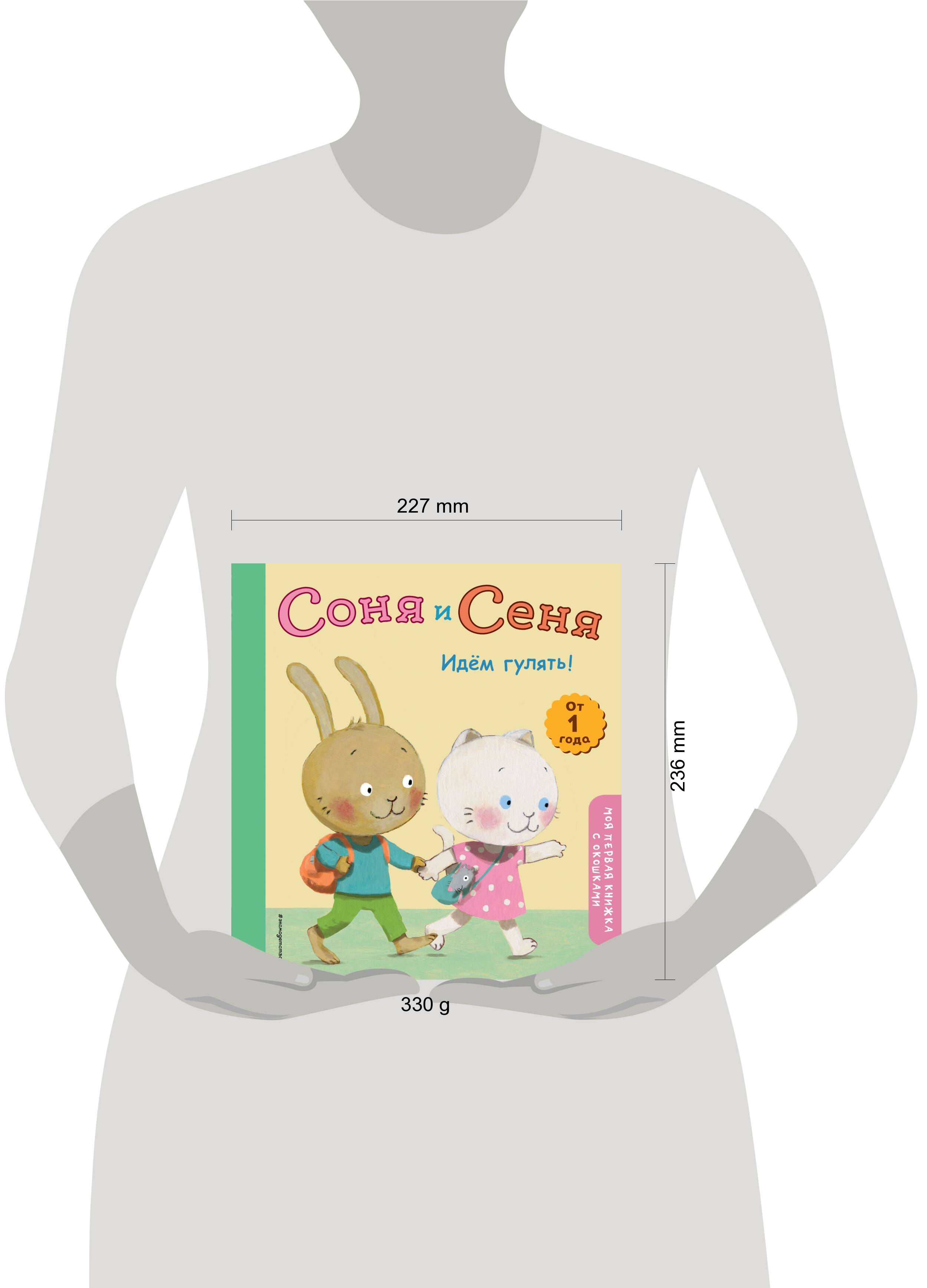 У кошечки Сони и зайчика Сени столько идей, куда можно сходить погулять! На их примере маленький читатель получит первое представление об окружающем его мире: об игровой площадке, о зоопарке, о пляже... Книга обязательно понравится всем малышам благодаря очаровательным иллюстрациям, а их родители непременно оценят познавательную составляющую книги. Наблюдая за занятиями героев, ребенок сможет сформировать первые речевые навыки, узнает простые названия цветов, форм и противоположностей, научится сравнивать разные предметы и понимать разницу между ними. А открывающиеся окошки и клапаны на каждом развороте книги позволят малышу тренировать пальчики, зрительное восприятие и память. Книга также дает полезные советы родителям, как сделать совместное чтение книги еще более полезным и увлекательным.| Издательство | ООО "Издательство "Эксмо" |