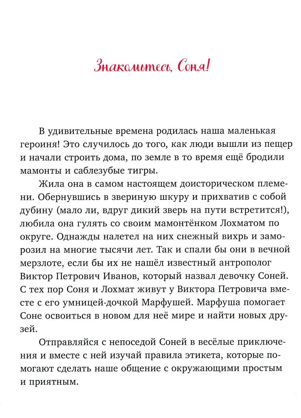 Маленькая Соня попала в наш мир из доисторических времён, когда люди прятались от диких зверей в пещерах и с трудом добывали себе пропитание. Конечно, им было не до этикета! Но за десятки тысяч лет многое изменилось. Сможет ли Соня приспособиться к новому времени?| Издательство | Клевер-Медиа-Групп |