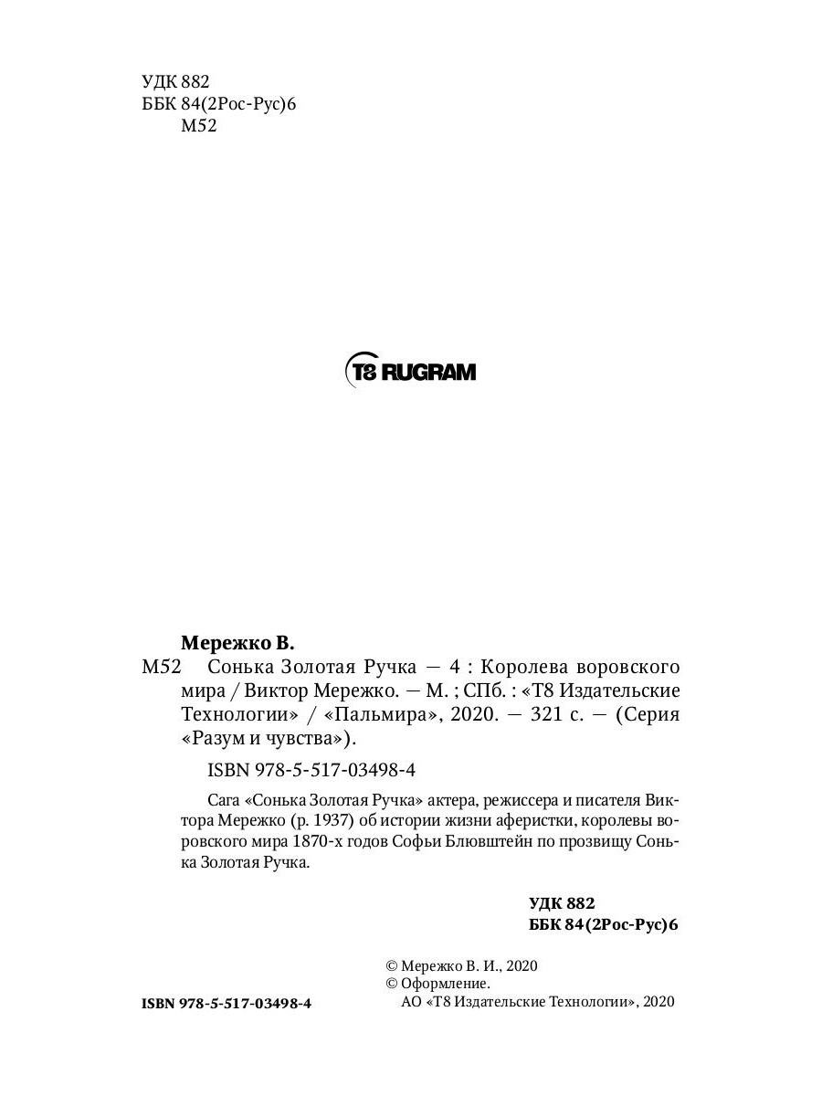 Сага «Сонька Золотая Ручка» актера, режиссера и писателя Виктора Мережко (р. 1937) об истории жизни аферистки, королевы воровского мира 1870-х годов Софьи Блювштейн по прозвищу Сонька Золотая Ручка.| Издательство | Т8 RUGRAM |