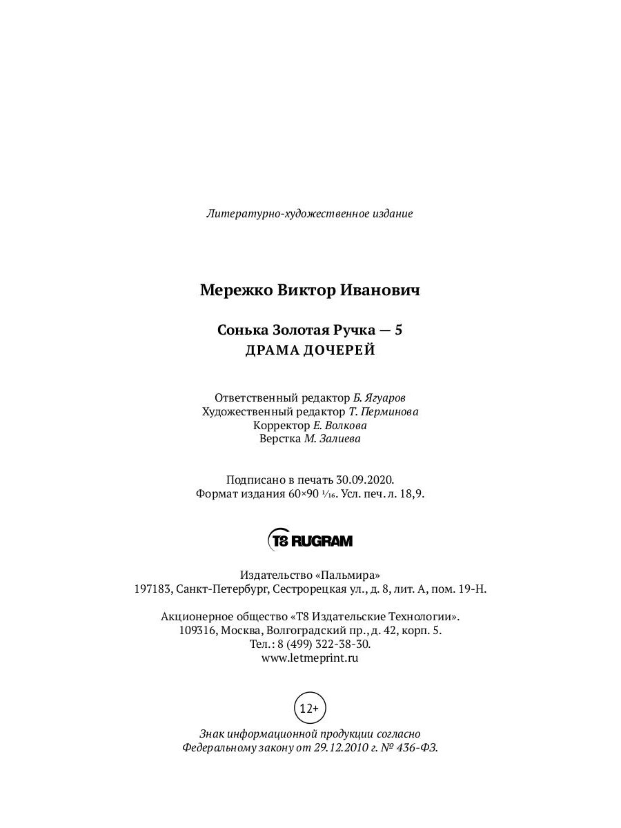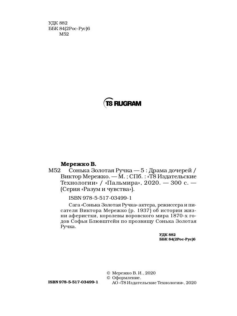 Сага «Сонька Золотая Ручка» актера, режиссера и писателя Виктора Мережко (р. 1937) об истории жизни аферистки, королевы воровского мира 1870-х годов Софьи Блювштейн по прозвищу Сонька Золотая Ручка.| Издательство | Т8 RUGRAM |