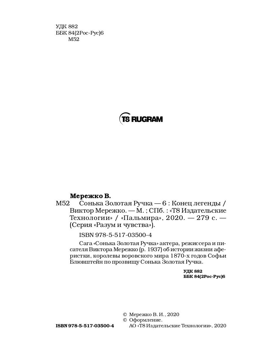 Сага «Сонька Золотая Ручка» актера, режиссера и писателя Виктора Мережко (р. 1937) об истории жизни аферистки, королевы воровского мира 1870-х годов Софьи Блювштейн по прозвищу Сонька Золотая Ручка.| Издательство | Т8 RUGRAM |