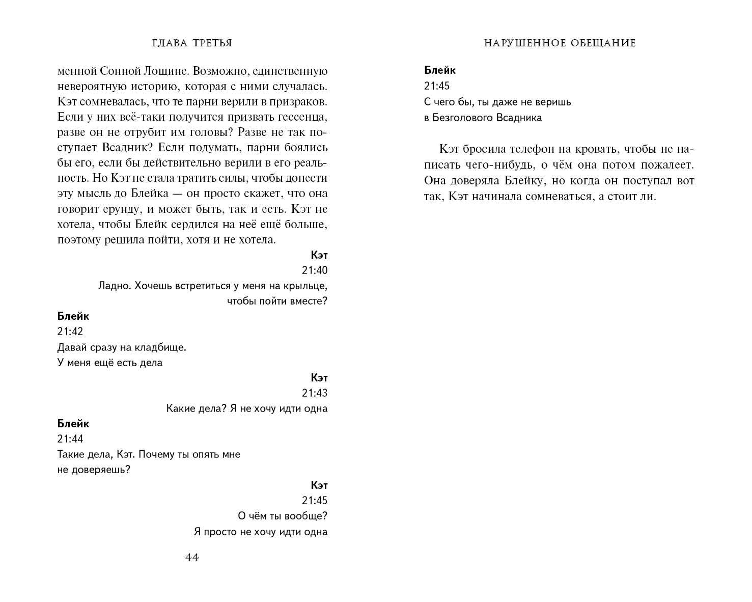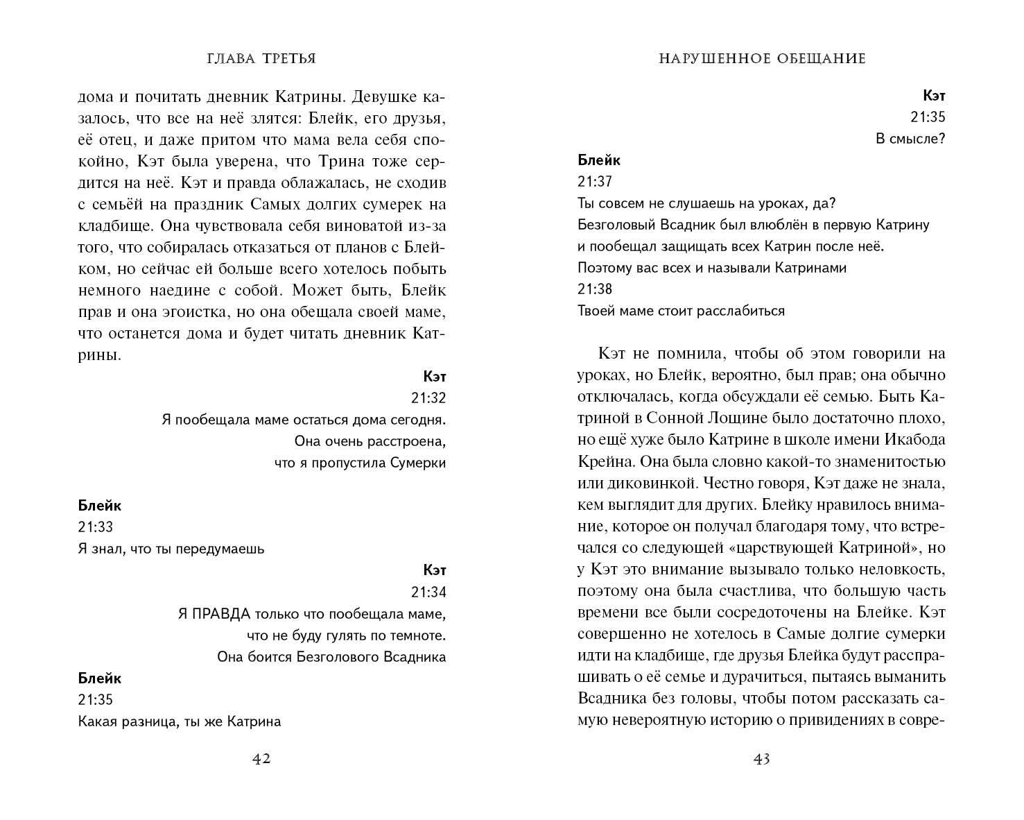 Вас ждёт целых две сюжетные линии, связанные тайной! Много лет назад Катарина ван Тассел описала в своём дневнике легенду о Всаднике без головы и Икабоде Крейне. Спустя 200 лет её внучка Кэт читает дневник и обнаруживает, что её жизнь как две капли воды похожа на жизнь предшественницы. Кэт ждёт встреча с призраками, тайной своей семьи, собственными страхами и… новой любовью.