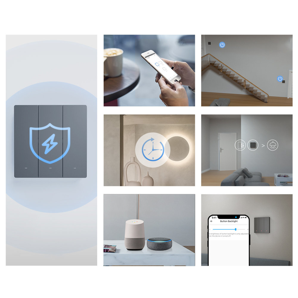 - Много способов управления - Настенный выключатель от Sonoff предлагает возможность управления 3 способами - классическим (ручным), голосовым и через приложение eWeLink.