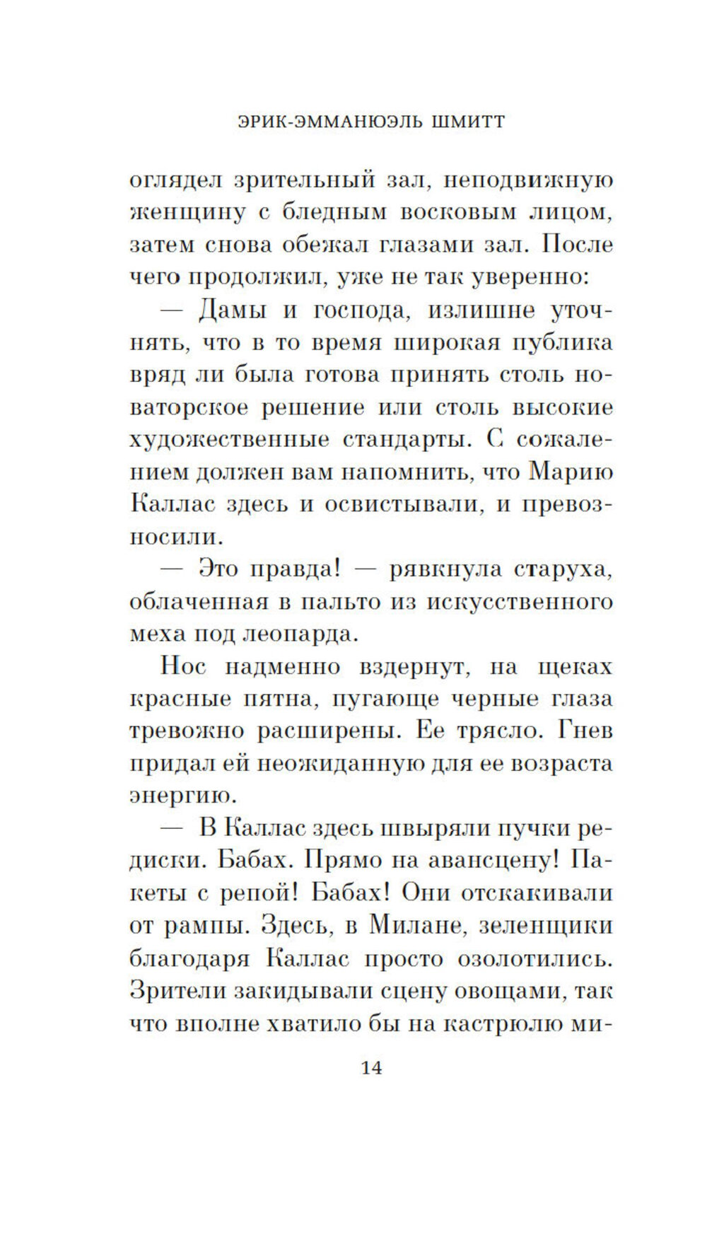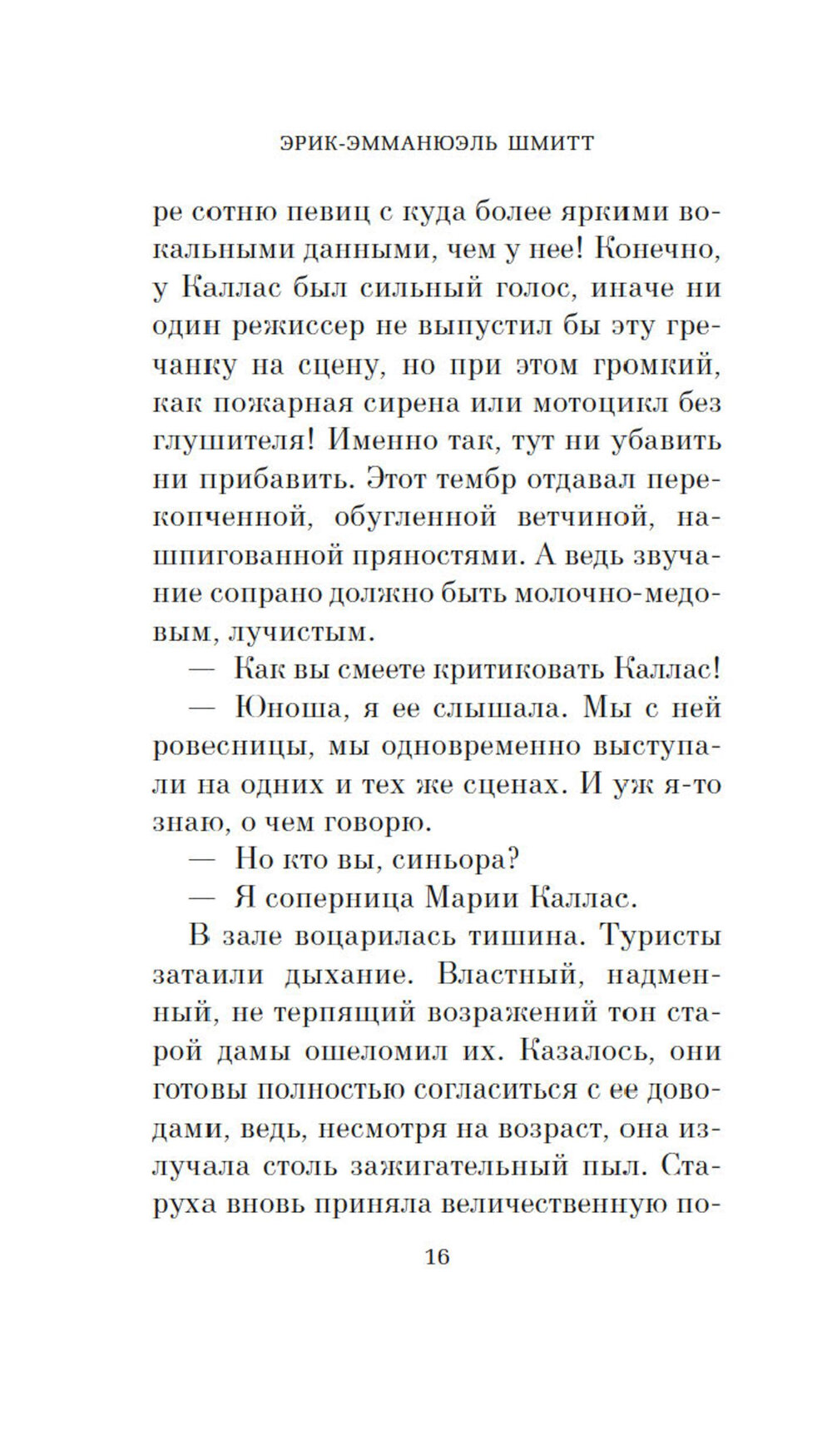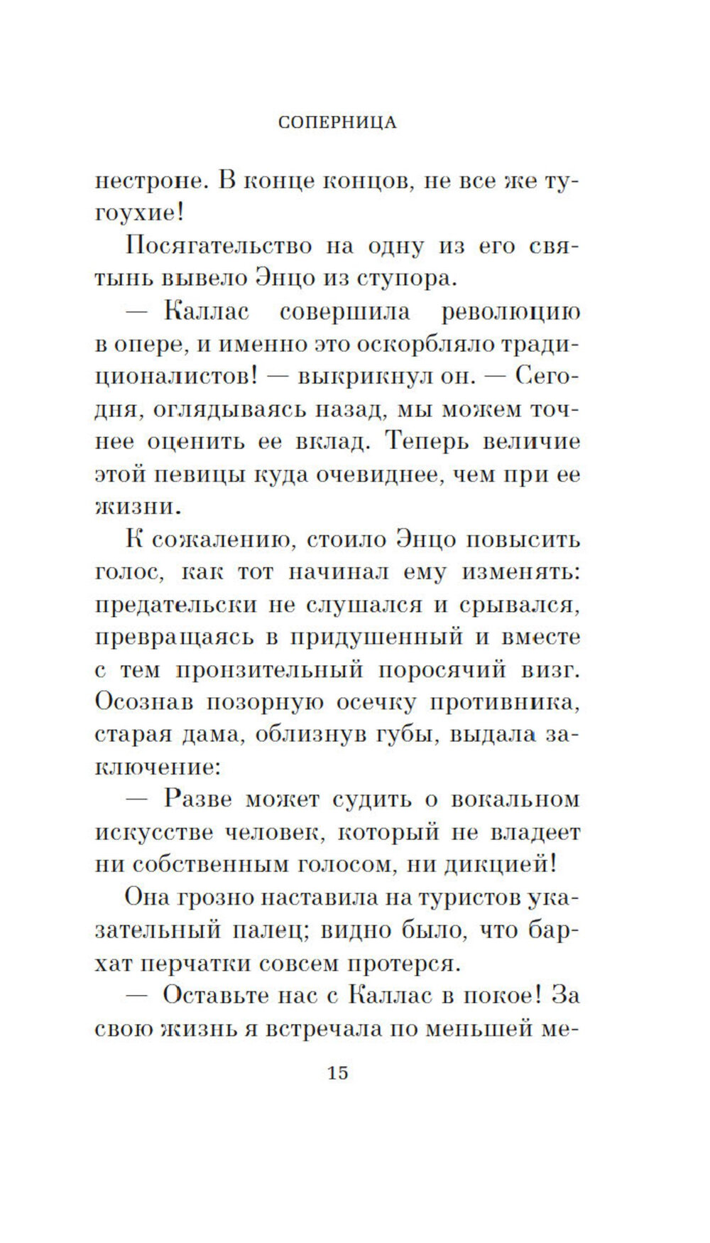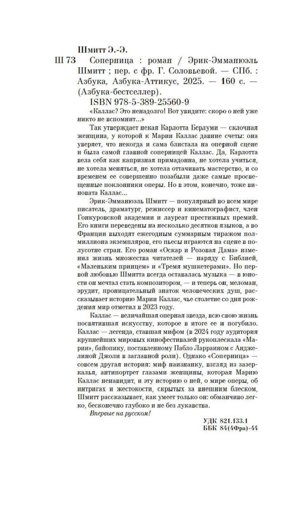«Каллас? Это ненадолго! Вот увидите: скоро о ней уже никто не вспомнит...» Так утверждает некая Карлотта Берлуми - склочная женщина, у которой к Марии Каллас давние счеты: она уверяет, что некогда и сама блистала на оперной сцене и была самой главной соперницей Каллас. Да, Карлотта вела себя как капризная примадонна, не хотела учиться, не хотела меняться, не хотела оттачивать мастерство, и со временем ее совершенно позабыли даже самые просвещенные поклонники оперы. Но в этом, конечно, тоже виновата Каллас... Эрик-Эмманюэль Шмитт - популярный во всем мире писатель, драматург, режиссер и кинематографист, член Гонкуровской академии и лауреат престижных премий. Его книги переведены на несколько десятков языков, а во Франции выходят ежегодным суммарным тиражом полмиллиона экземпляров, его пьесы играются на сцене в полусотне стран. Его роман «Оскар и Розовая Дама» изменил жизнь множества читателей - наряду с Библией, «Маленьким принцем» и «Тремя мушкетерами». Но первой любовью Шмитта всегда оставалась музыка - в юности он мечтал стать композитором, - и теперь он, меломан, эрудит, проницательный знаток человеческих душ, рассказывает историю Марии Каллас, чье столетие со дня рождения мир отметил в 2023 году. Каллас - величайшая оперная звезда, всю свою жизнь посвятившая искусству, которое в итоге ее и погубило. Каллас - легенда, ставшая мифом (в 2024 году аудитория крупнейших мировых кинофестивалей рукоплескала «Марии», байопику, поставленному Пабло Ларраином с Анджелиной Джоли в заглавной роли). Однако «Соперница» - совсем другая история: миф наизнанку, взгляд из зазеркалья, антипортрет глазами женщины, которая Марию Каллас ненавидит, и эту историю о ней, о мире оперы, об интригах и жестокости, скрытых за внешним блеском, Шмитт рассказывает, как умеет только он: обманчиво легко, бесконечно глубоко и не без лукавства.