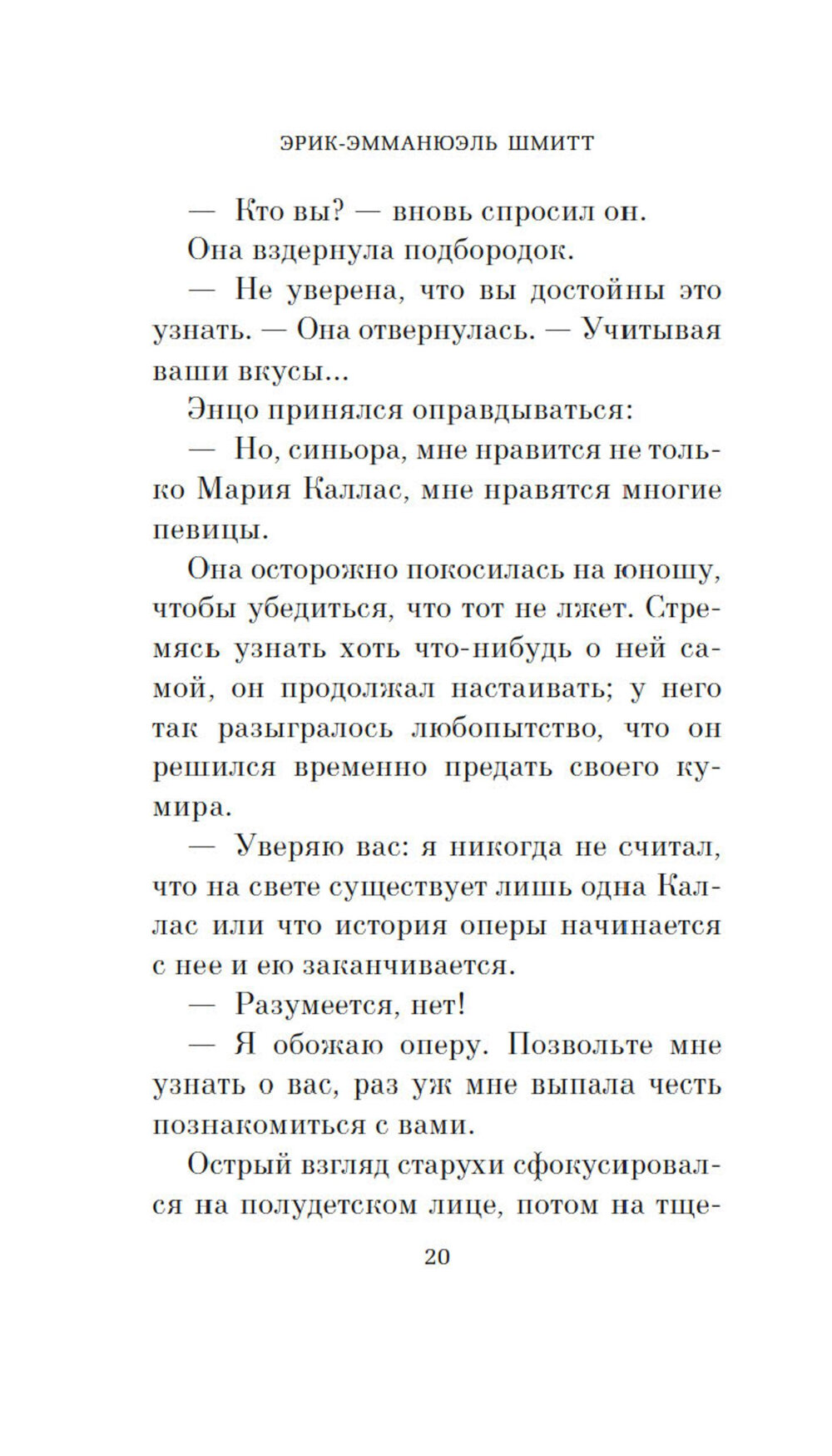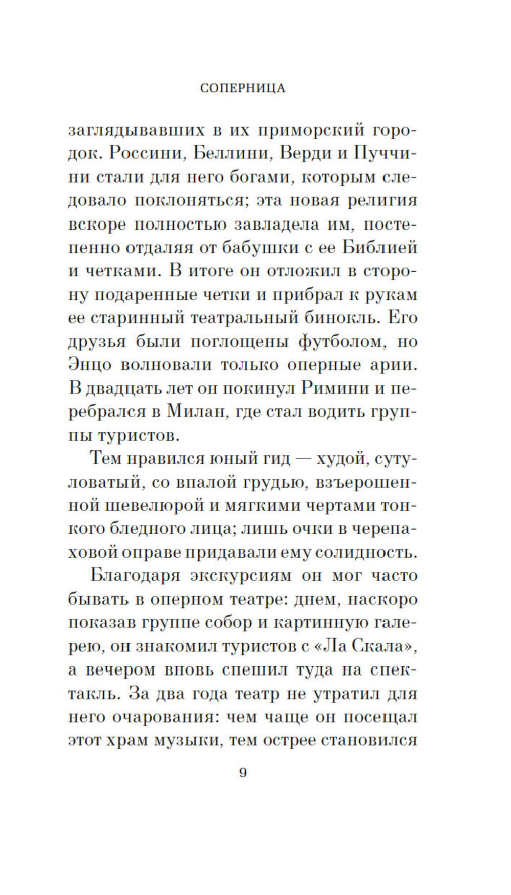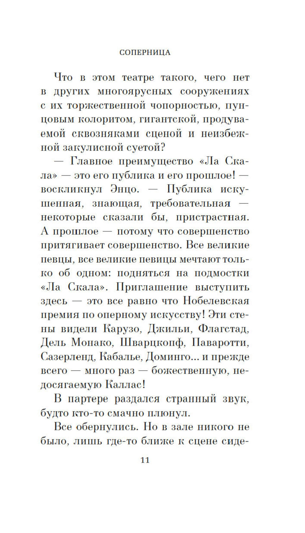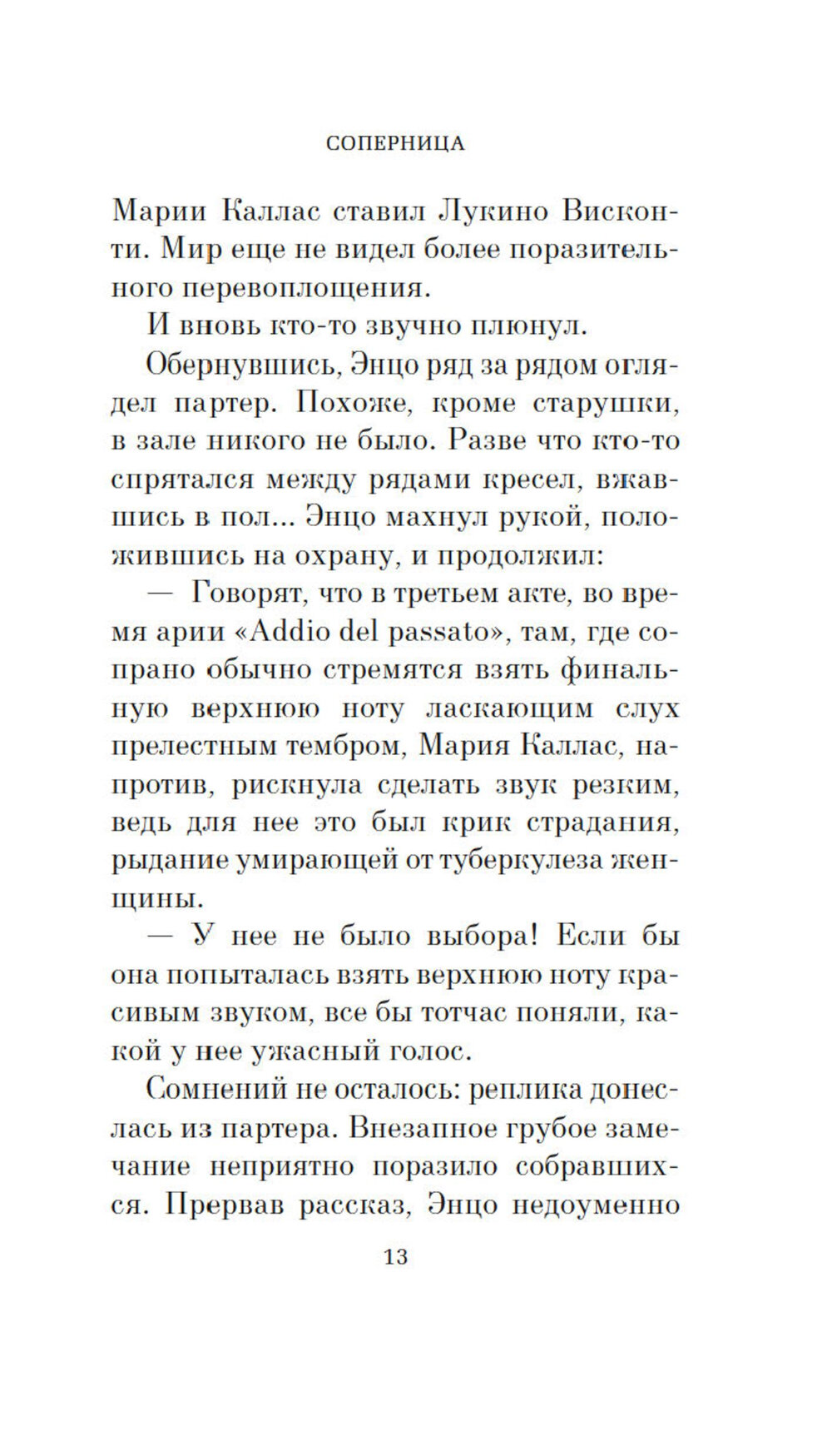 «Каллас? Это ненадолго! Вот увидите: скоро о ней уже никто не вспомнит...» Так утверждает некая Карлотта Берлуми - склочная женщина, у которой к Марии Каллас давние счеты: она уверяет, что некогда и сама блистала на оперной сцене и была самой главной соперницей Каллас. Да, Карлотта вела себя как капризная примадонна, не хотела учиться, не хотела меняться, не хотела оттачивать мастерство, и со временем ее совершенно позабыли даже самые просвещенные поклонники оперы. Но в этом, конечно, тоже виновата Каллас... Эрик-Эмманюэль Шмитт - популярный во всем мире писатель, драматург, режиссер и кинематографист, член Гонкуровской академии и лауреат престижных премий. Его книги переведены на несколько десятков языков, а во Франции выходят ежегодным суммарным тиражом полмиллиона экземпляров, его пьесы играются на сцене в полусотне стран. Его роман «Оскар и Розовая Дама» изменил жизнь множества читателей - наряду с Библией, «Маленьким принцем» и «Тремя мушкетерами». Но первой любовью Шмитта всегда оставалась музыка - в юности он мечтал стать композитором, - и теперь он, меломан, эрудит, проницательный знаток человеческих душ, рассказывает историю Марии Каллас, чье столетие со дня рождения мир отметил в 2023 году. Каллас - величайшая оперная звезда, всю свою жизнь посвятившая искусству, которое в итоге ее и погубило. Каллас - легенда, ставшая мифом (в 2024 году аудитория крупнейших мировых кинофестивалей рукоплескала «Марии», байопику, поставленному Пабло Ларраином с Анджелиной Джоли в заглавной роли). Однако «Соперница» - совсем другая история: миф наизнанку, взгляд из зазеркалья, антипортрет глазами женщины, которая Марию Каллас ненавидит, и эту историю о ней, о мире оперы, об интригах и жестокости, скрытых за внешним блеском, Шмитт рассказывает, как умеет только он: обманчиво легко, бесконечно глубоко и не без лукавства.