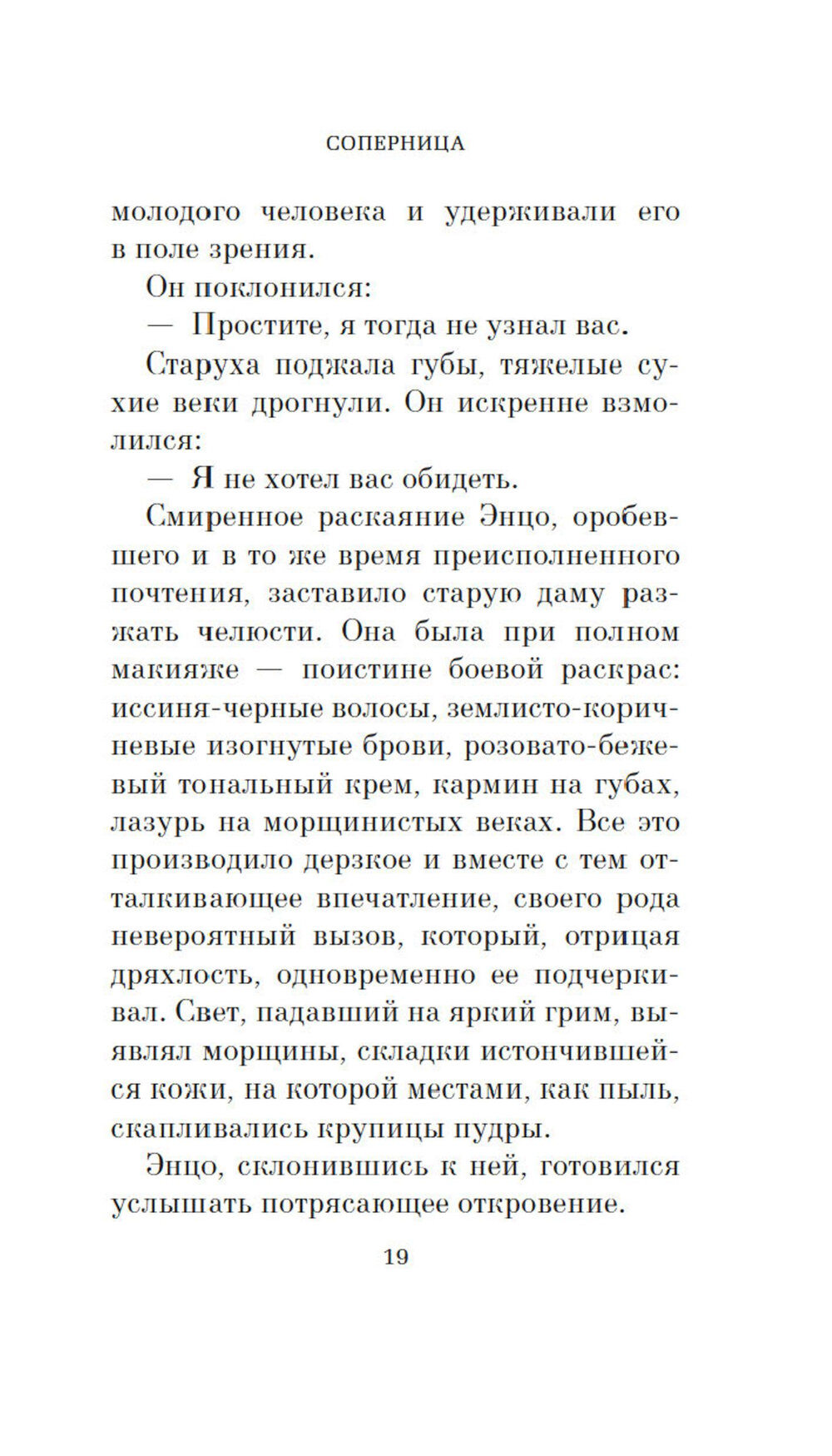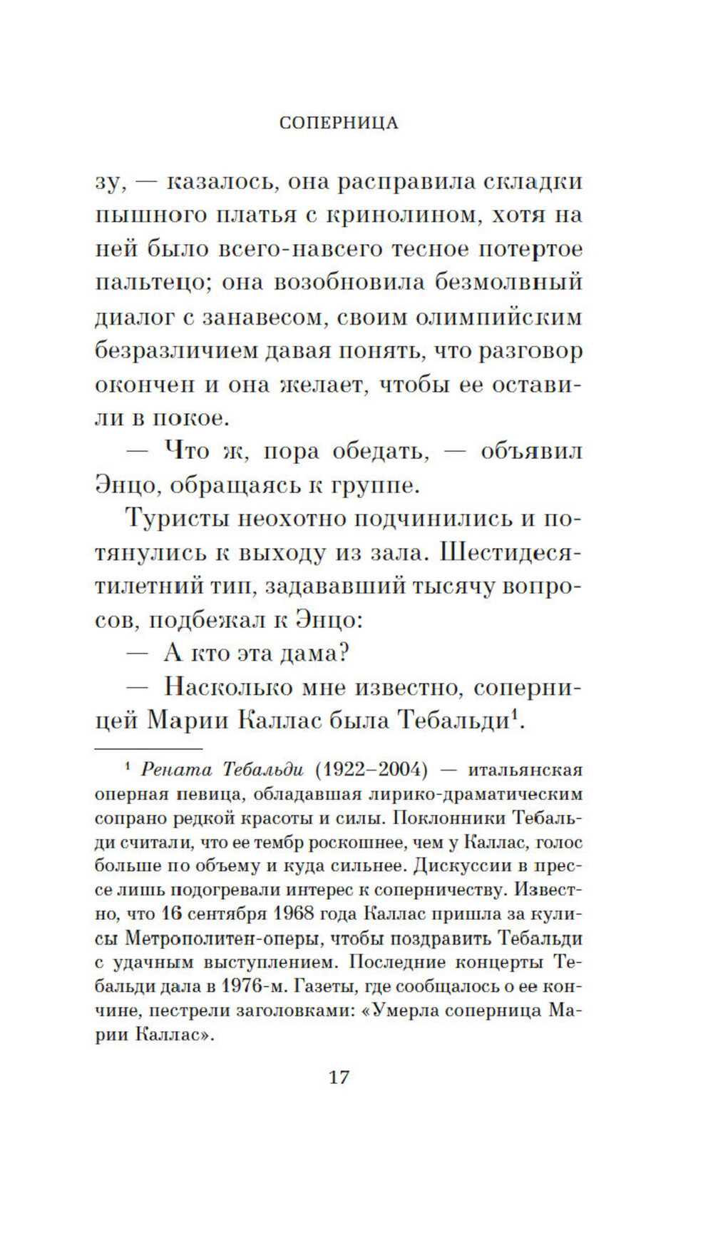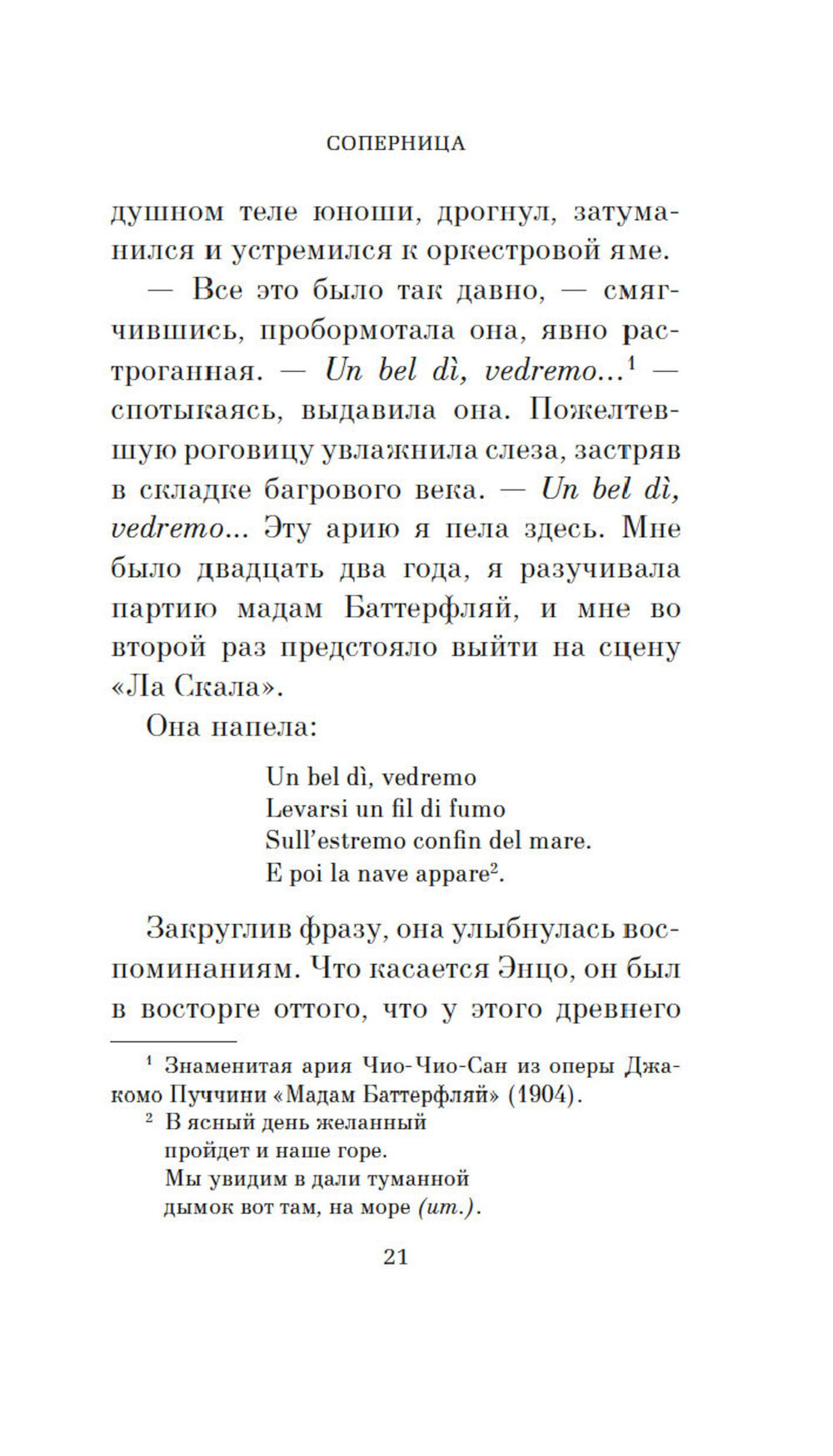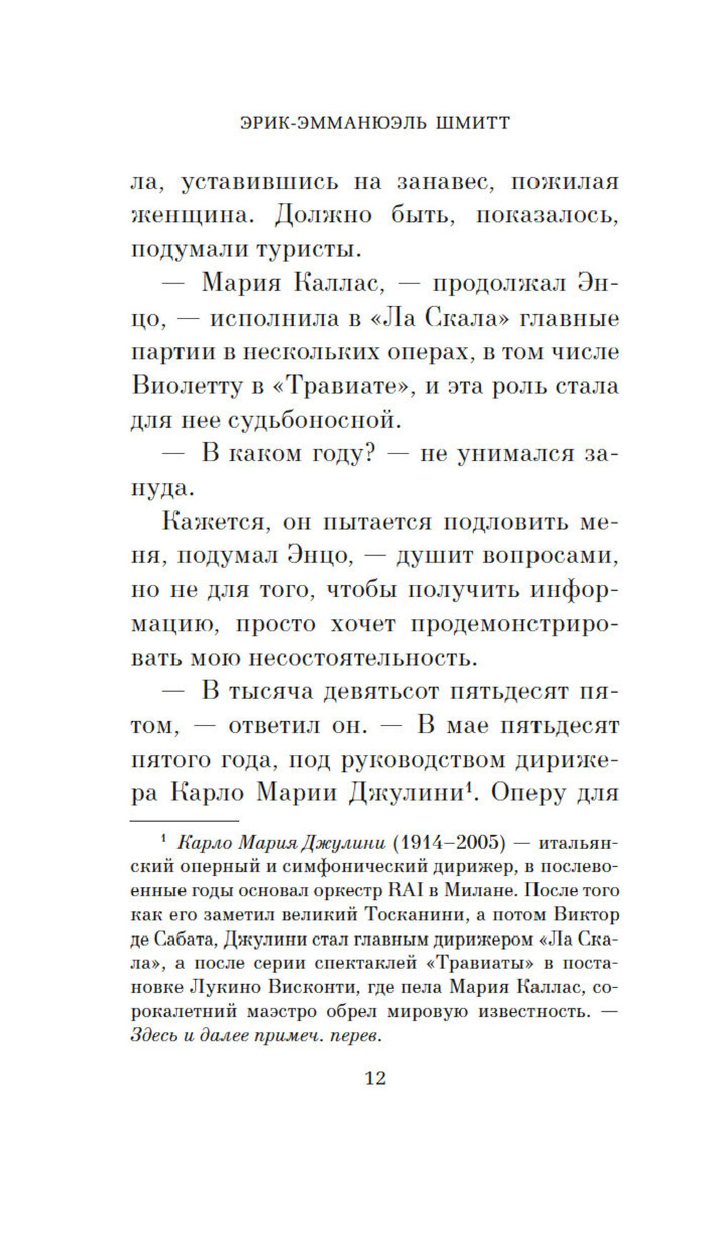 «Каллас? Это ненадолго! Вот увидите: скоро о ней уже никто не вспомнит...» Так утверждает некая Карлотта Берлуми - склочная женщина, у которой к Марии Каллас давние счеты: она уверяет, что некогда и сама блистала на оперной сцене и была самой главной соперницей Каллас. Да, Карлотта вела себя как капризная примадонна, не хотела учиться, не хотела меняться, не хотела оттачивать мастерство, и со временем ее совершенно позабыли даже самые просвещенные поклонники оперы. Но в этом, конечно, тоже виновата Каллас... Эрик-Эмманюэль Шмитт - популярный во всем мире писатель, драматург, режиссер и кинематографист, член Гонкуровской академии и лауреат престижных премий. Его книги переведены на несколько десятков языков, а во Франции выходят ежегодным суммарным тиражом полмиллиона экземпляров, его пьесы играются на сцене в полусотне стран. Его роман «Оскар и Розовая Дама» изменил жизнь множества читателей - наряду с Библией, «Маленьким принцем» и «Тремя мушкетерами». Но первой любовью Шмитта всегда оставалась музыка - в юности он мечтал стать композитором, - и теперь он, меломан, эрудит, проницательный знаток человеческих душ, рассказывает историю Марии Каллас, чье столетие со дня рождения мир отметил в 2023 году. Каллас - величайшая оперная звезда, всю свою жизнь посвятившая искусству, которое в итоге ее и погубило. Каллас - легенда, ставшая мифом (в 2024 году аудитория крупнейших мировых кинофестивалей рукоплескала «Марии», байопику, поставленному Пабло Ларраином с Анджелиной Джоли в заглавной роли). Однако «Соперница» - совсем другая история: миф наизнанку, взгляд из зазеркалья, антипортрет глазами женщины, которая Марию Каллас ненавидит, и эту историю о ней, о мире оперы, об интригах и жестокости, скрытых за внешним блеском, Шмитт рассказывает, как умеет только он: обманчиво легко, бесконечно глубоко и не без лукавства.