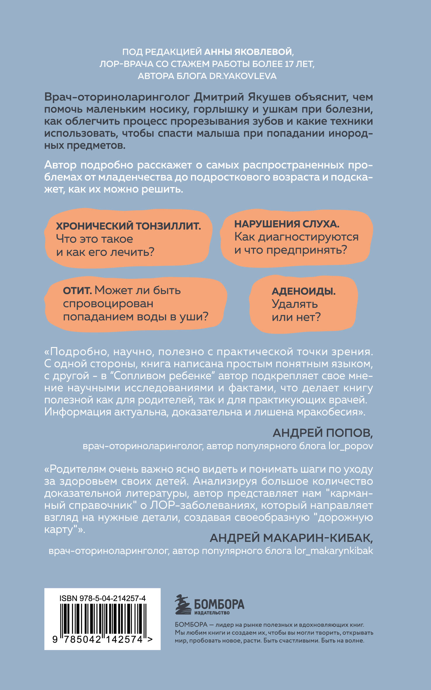 - Когда больное горло лечат холодным? - Есть ли связь между употреблением молока и обилием соплей у ребенка? - Чем полезна техника «материнского поцелуя»? - О чём говорит цвет соплей? На эти и многие другие вопросы ответит опытный врач-отоларинголог Дмитрий Якушев, создатель сообщества ЛОРов, где делятся своим опытом более 400 врачей, а также автор блога ent_speech с аудиторией более 18 000 подписчиков.| Издательство | ООО "Издательство "Эксмо" |