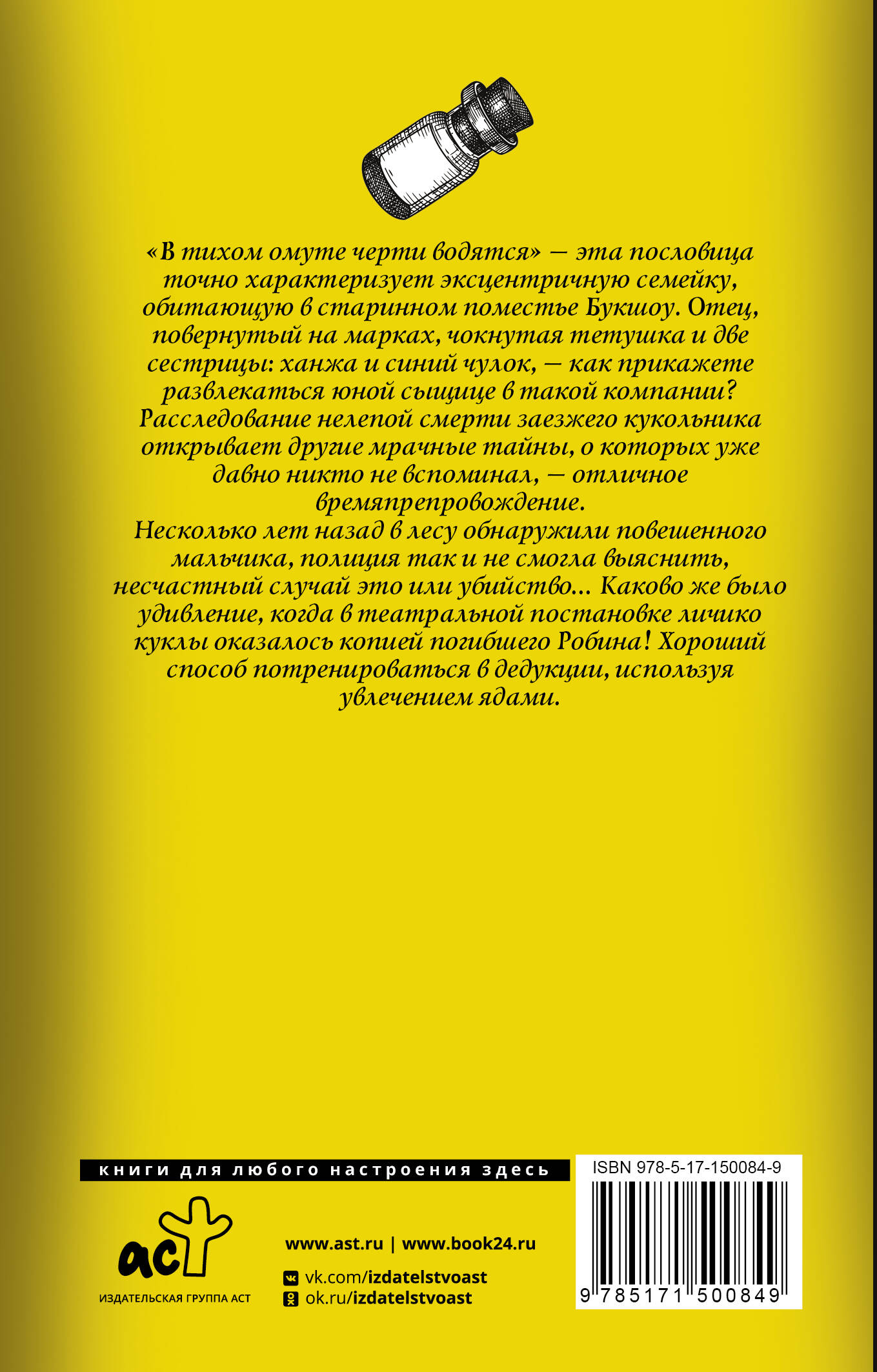 - Вторая книга в цикле про остроумную девочку-детектива Флавию де Люс! - Захватывающее расследование, потрясающий литературный стиль, английский юмор и настроение классических детективов в духе Агаты Кристи. - Алан Брэдли - обладатель литературных наград Crime Writers' Association Debut Dagger Award, Barry Award, Agatha Award, Macavity Award, Dilys Award, и Arthur Ellis Award. - Книги цикла «Флавия де Люс ведет расследование» были переведены на 36 языков и изданы в 39 странах! Эксцентричная семья де Люс продолжает вести размеренную жизнь в поместье Букшоу. Отец собирает марки, тётушка хлопочет по хозяйству, а вот Флавия продолжает изучать яды. Не затем ли, чтобы отравить вредных сестёр? Девочке-вундеркинду снова пригождаются навыки сыщика, когда из прошлого возвращается призрак погибшего мальчика. Полиция так и не разгадала тайну смерти Робина, а вот Флавия смогла соединить обрывочные улики и напасть на след. И хотя взрослые не воспринимают девочку всерьёз, она успешно расследует дело. Флавия использует дедукцию и знания из химии, чтобы вывести на чистую воду преступника.| Издательство | АСТ |