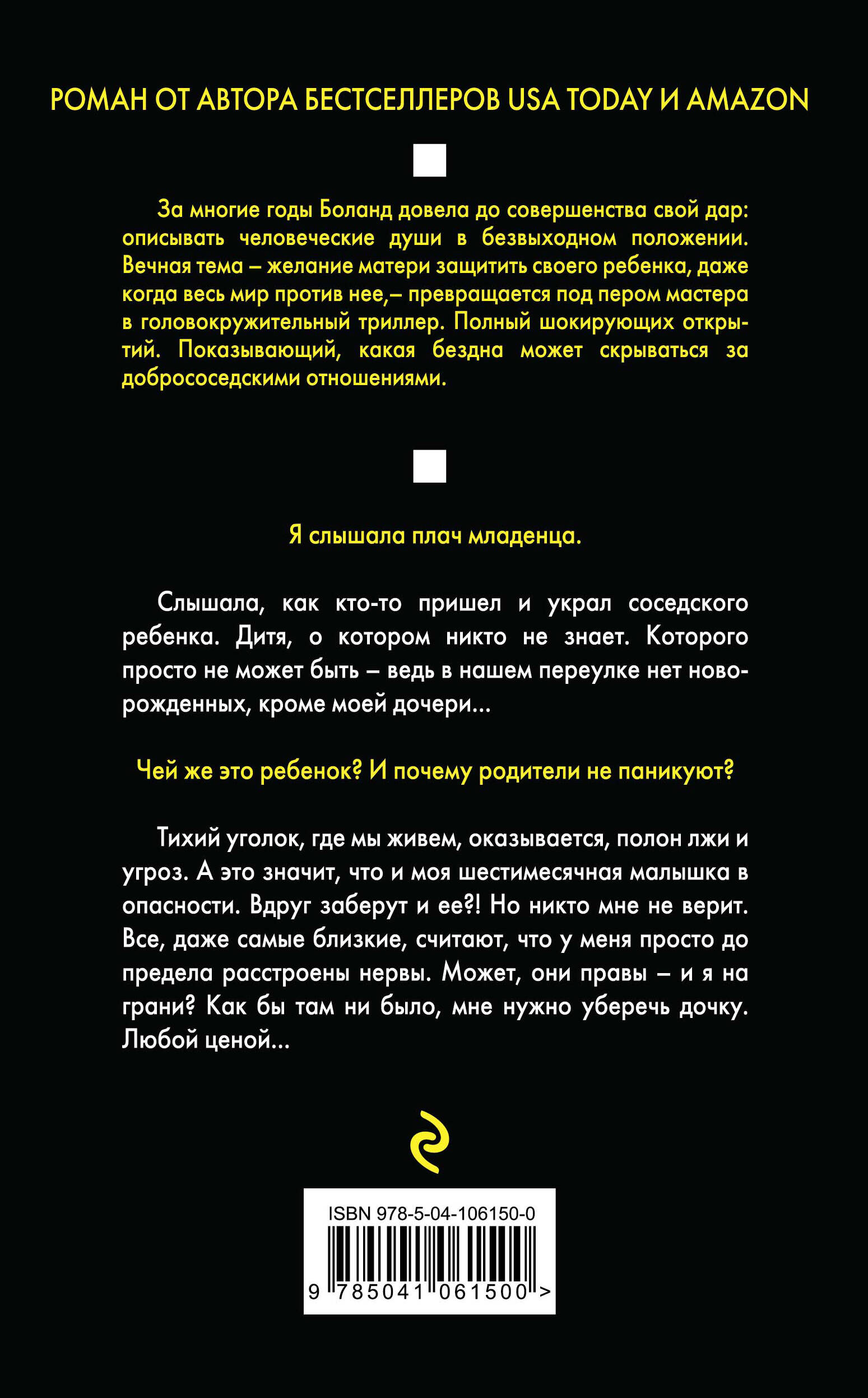 РОМАН ОТ АВТОРА БЕСТСЕЛЛЕРОВ USA TODAY И AMAZON. За многие годы Боланд довела до совершенства свой дар: описывать человеческие души в безвыходном положении. Вечная тема - желание матери защитить своего ребенка, даже когда весь мир против нее - превращается под пером мастера в головокружительный триллер. Полный шокирующих открытий. Показывающий, какая бездна может скрываться за добрососедскими отношениями. Самые тихие уголки скрывают самые мрачные тайны…| Издательство | ООО "Издательство "Эксмо" |