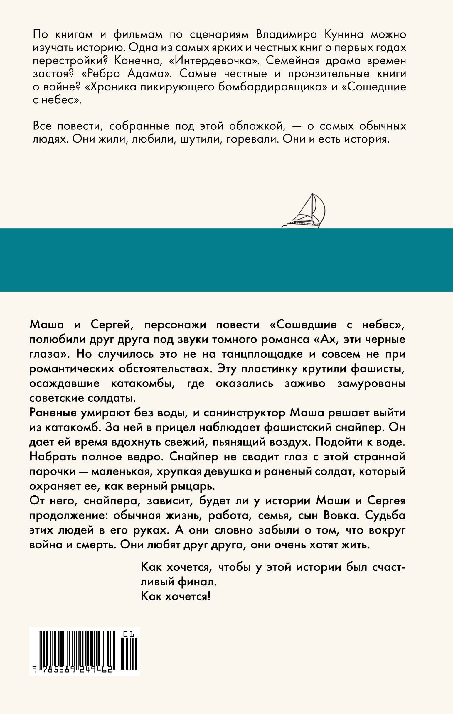 По книгам и фильмам по сценариям Владимира Кунина можно изучать историю. Одна из самых ярких и честных книг о первых годах перестройки? Конечно, "Интердевочка". Семейная драма времен застоя? "Ребро Адама!. Самые честные и пронзительные книги о войне - "Хроника пикирующего бомбардировщика" и "Сошедшие с небес". Все повести, собранные под этой обложкой, - о самых обычных людях. Они жили, любили, шутили, горевали. Они и есть история. Маша и Сергей, персонажи повести "Сошедшие с небес", полюбили друг друга под звуки томного романса "Ах эти черные глаза". Но случилось это не на танцплощадке и совсем не при романтических обстоятельствах. Эту пластинку крутили фашисты, осаждавшие катакомбы, где оказались заживо замурованы советские солдаты. Раненые умирают без воды, и санинструктор Маша решает выйти из катакомб. За ней в прицел наблюдает фашистский снайпер. Он дает ей время вдохнуть свежий пьянящий воздух. Подойти к воде. Набрать полное ведро. Снайпер не сводит глаз с этой странной парочки - маленькая, хрупкая девушка и раненый солдат, который охраняет ее, как верный рыцарь. От него, снайпера, зависит, будет ли у истории Маши и Сергея продолжение: обычная жизнь, работа, семья, сын Вовка. Судьба этих людей в его руках. А они словно забыли о том, что вокруг война и смерть. Они любят друг друга, они очень хотят жить. Как хочется, чтобы у этой истории был счастливый финал. Как хочется!