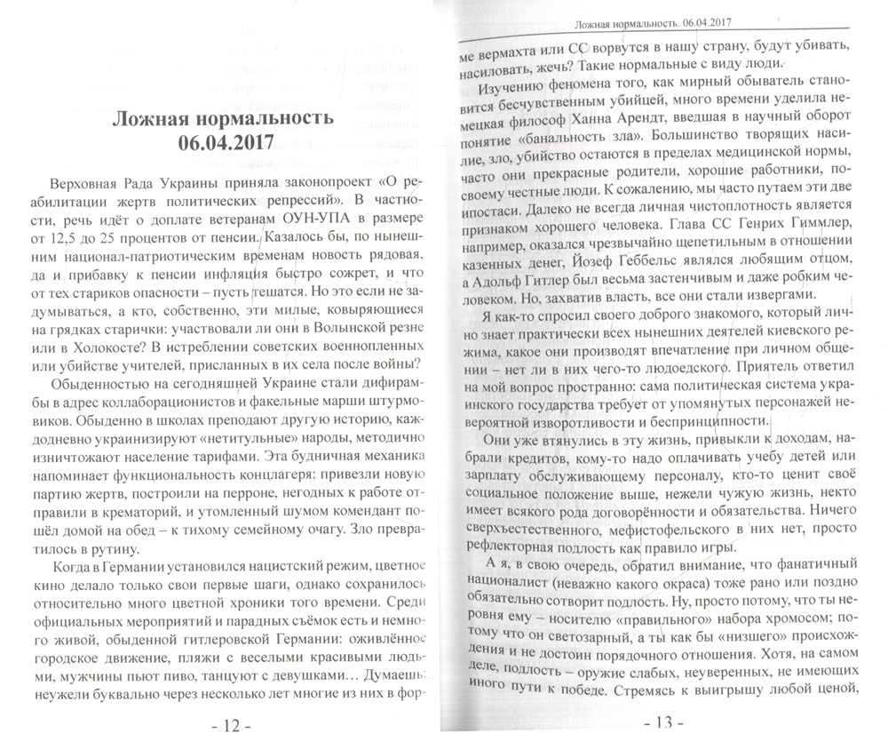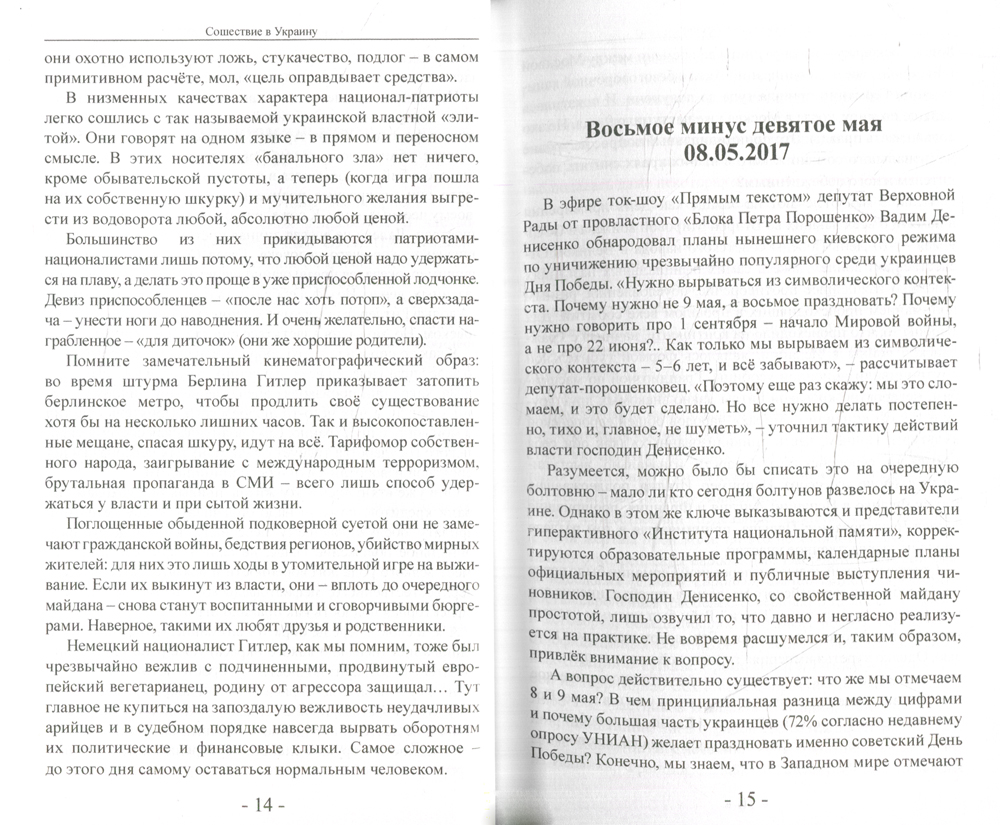 В новых хрониках талантливого публициста Константина Кеворкяна во всей полноте, день за днем, предстает картина постмайданной Украины со всеми ее уродствами и вывихами, примитивной философией расчеловечивания и ненависти ко всему русскому, с чествованием ветеранов ОУН-УПА и нацистскими факельными шествиями. И даже в названии книги - «Сошествие в Украину» - присутствует нечто тревожно-мрачное, как у Данте: сошествие в Ад... Это сегодняшняя Украина и мы понимаем: она больна. Больна, потому что за видимостью «демократического государства», под разглагольствования так называемой «национал-элиты» страна превратилась в территорию, где хозяйничают сборища неадекватных людей, неонацистов и заурядных садистов. Благодаря им Украина давно превратилась в источающую зло «анти-Россию». Ликвидация майданного режима - необходимое условие денацифика-ции Украины и возвращения ее к нормам цивилизованного сосуществования. Вот главная задача Спецоперации МО России, начавшейся 24 февраля 2022 года. А всё, что предшествовало ей, читатели найдут в этой книге - откровенно, талантливо и подробно написанном дневнике. Данное издание открывает книжную серию «Библиотека Украина.ру» где будут представлены труды известных журналистов, политиков, мыслителей, ученых.| Издательство | Книжный мир |