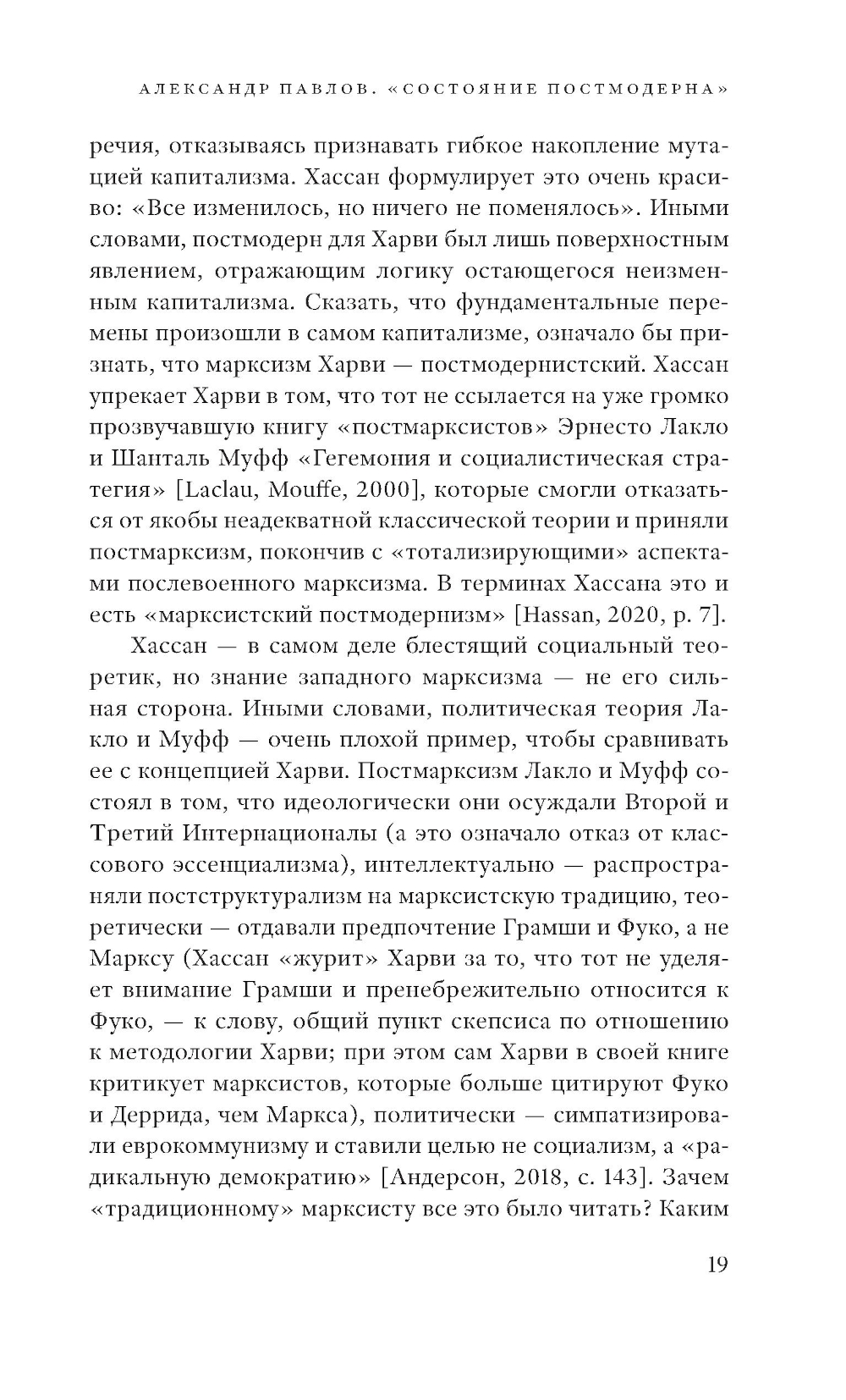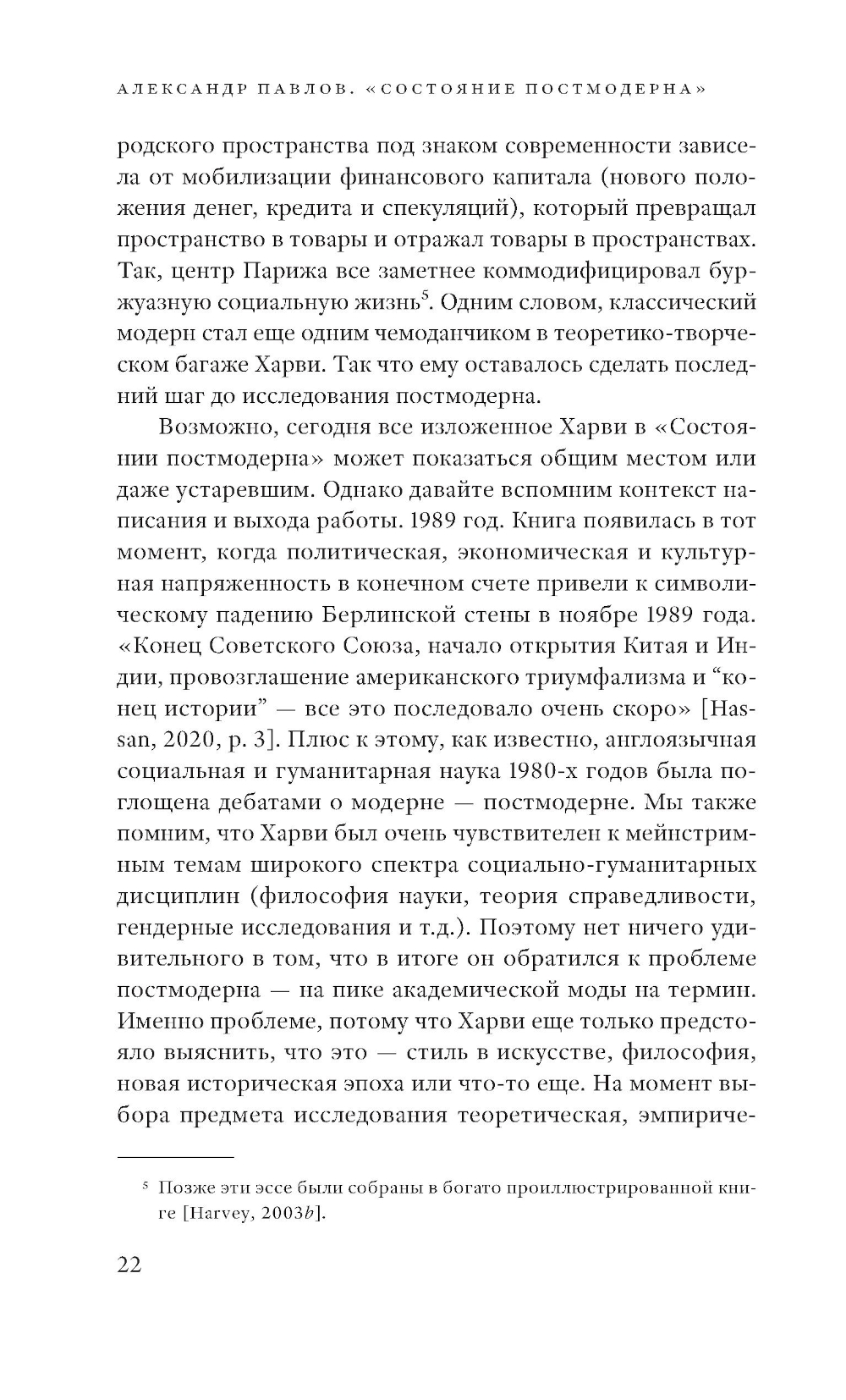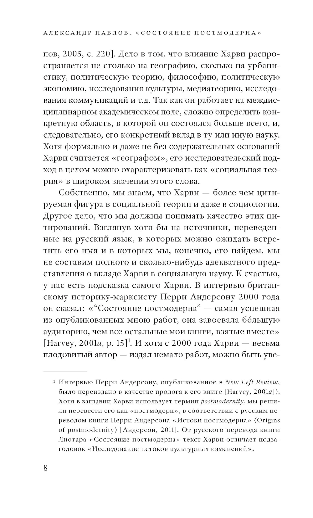 Термин «постмодерн» - один из самых сложных и противоречивых в социальной и гуманитарной науках. На протяжении нескольких десятилетий разные мыслители и ученые предлагали собственное толкование этого понятия. Самый известный на сегодняшний день социальный географ Дэвид Харви - один из них. В своей главной книге Харви объясняет, какой смысл подразумевает термин «постмодерн» как состояние актуальной культуры, и показывает, что за ощутимыми и динамичными переменами в культурной жизни стоит логика капитала. Ученый утверждает, что истоки культурных изменений лежат «в конечном счете» именно в экономике. В ходе своего исследования он прослеживает социально-экономическую и концептуальную историю модерна (от Просвещения до наших дней) и то, как был осуществлен переход от модерна к постмодерну в искусстве, урбанистике, литературе, архитектуре, кинематографе. Харви доказывает, что пространственно-временное сжатие происходило на протяжении нескольких веков и к 1970-м годам стало решением кризиса перенакопления капитала. Так, от модернистского фордизма произошел переход к постмодернистскому постфордизму, определяемому как «гибкое накопление». Хотя Харви написал эту книгу еще в 1989 году, он не отказался от своих идей, а события, произошедшие с тех пор, доказали его правоту. Книга считается одним из важнейших источников по социально-гуманитарным наукам и будет интересна широкому кругу читателей.| Издательство | ИД Высшей школы экономики |