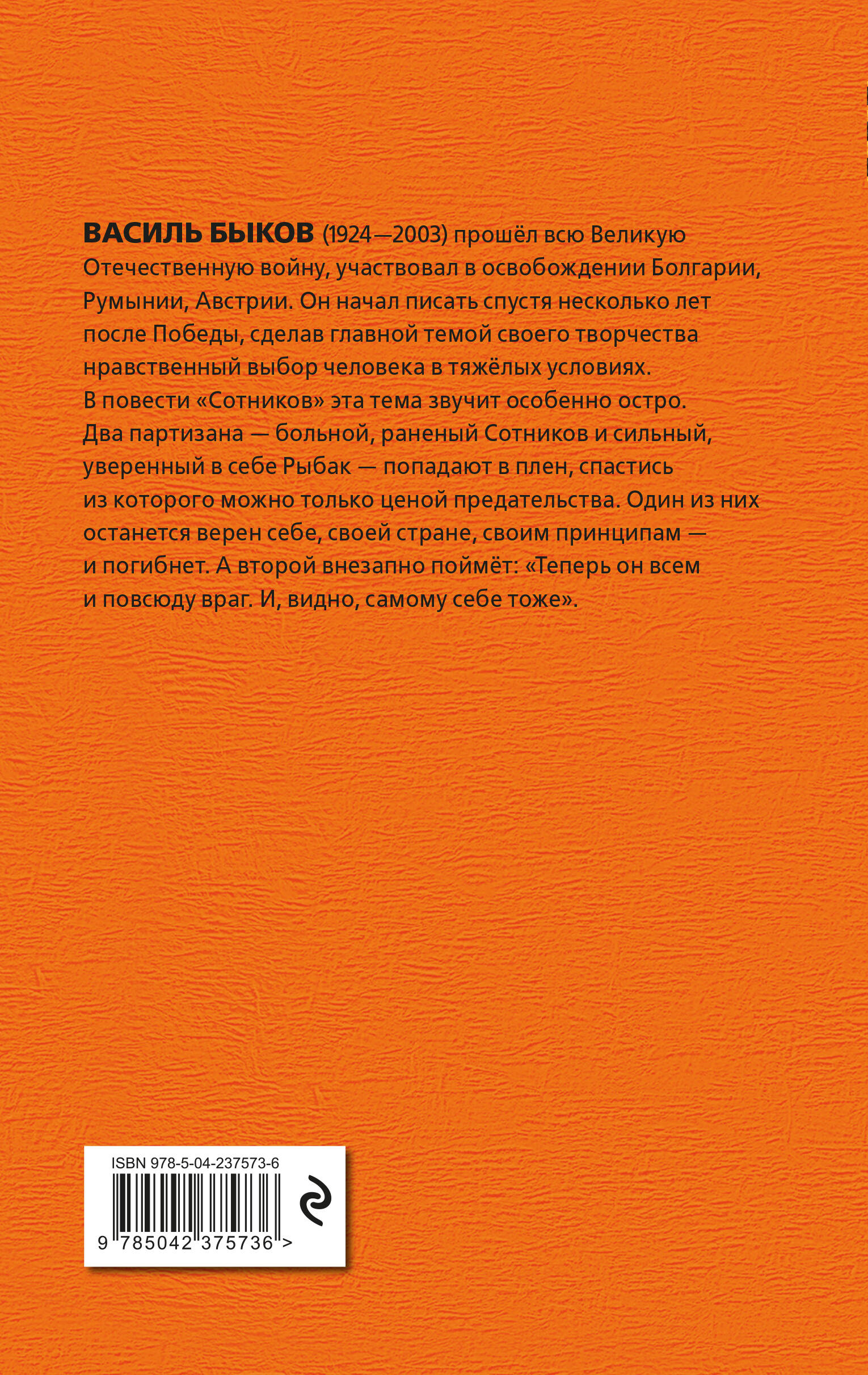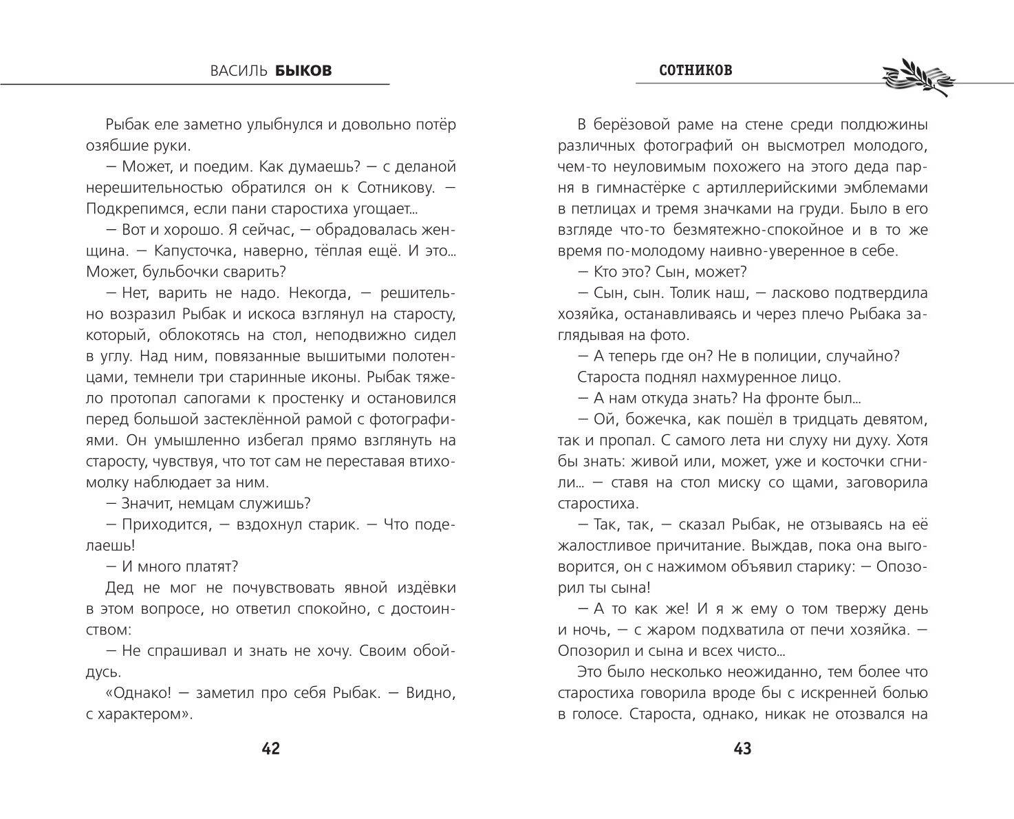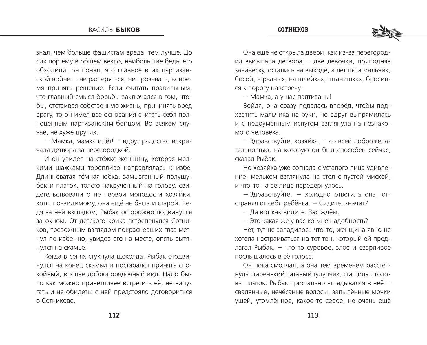 К ЮБИЛЕЮ ВЕЛИКОЙ ПОБЕДЫ! Книга в твёрдом переплёте с частичным лаком. В оформлении серии использованы архивные фотографии военных корреспондентов 1941-1945 гг. Белая бумага. Чёткий, удобный для чтения шрифт. Повесть Василя Быкова «Сотников», по словам автора, написана на основе реальных событий, чтобы показать, на что способен человек в безвыходной ситуации. В фашистском плену оказываются два партизана: сильный, уверенный в себе Рыбак и тяжелобольной раненый Сотников. Им предлагают сохранить жизнь ценой предательства, и каждый из них делает свой выбор. Режиссёр Лариса Шепитько сняла по книге полнометражный кинофильм «Восхождение», кадр из которого помещён на обложку.| Издательство | ООО "Издательство "Эксмо" |