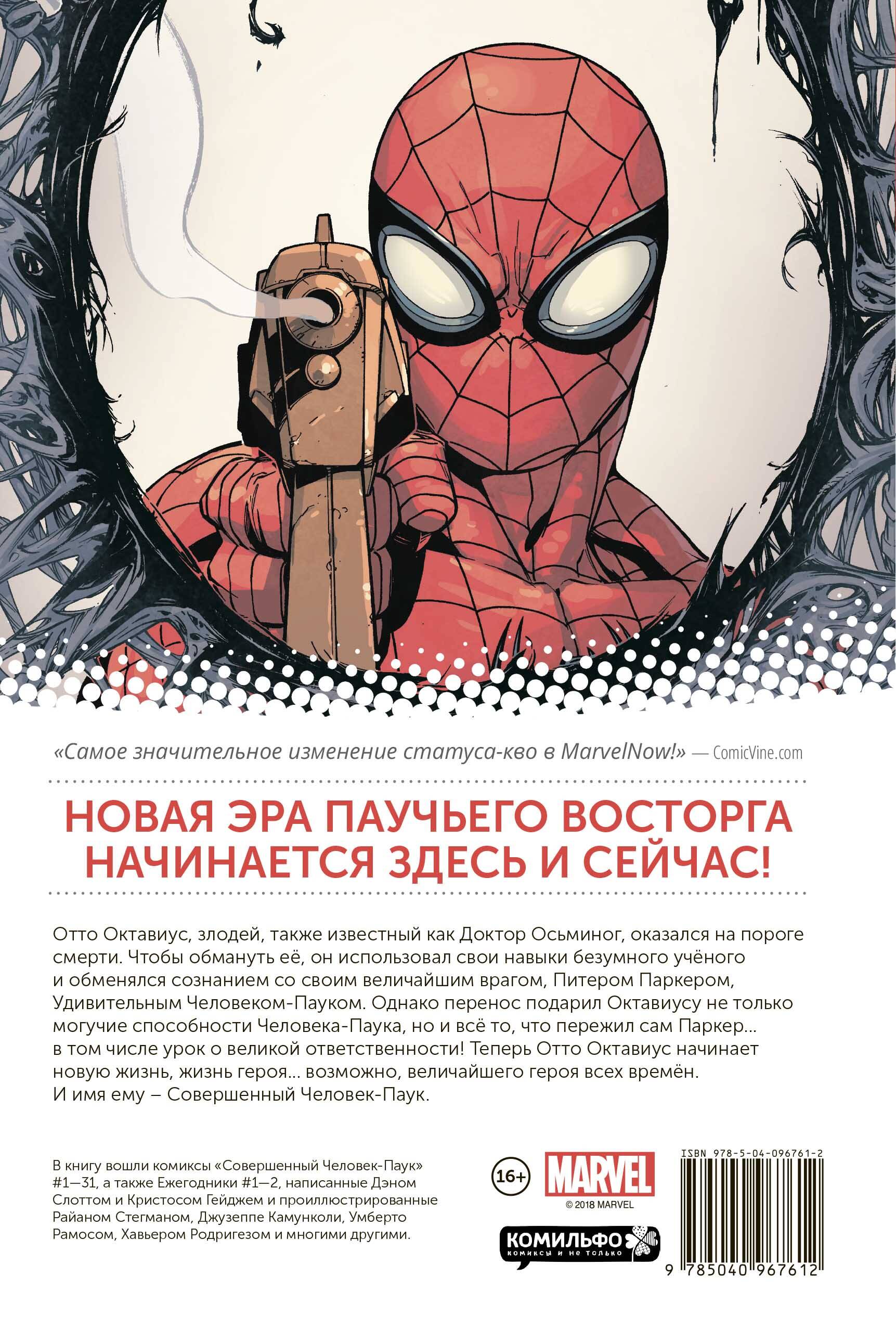 Твердый переплет, 768 страниц, 190х285 Отто Октавиус, злодей, также известный как Доктор Осьминог, оказался на пороге смерти. Чтобы обмануть её, он использовал свои навыки безумного учёного и обменялся сознанием со своим величайшим врагом, Питером Паркером, Удивительным Человеком-Пауком. Однако перенос подарил Октавиусу не только могучие способности Человека-Паука, но и всё то, что пережил сам Паркер... в том числе урок о великой ответственности! Теперь Отто Октавиус начинает новую жизнь, жизнь героя... возможно, величайшего героя всех времён. И имя ему - Совершенный Человек-Паук. В книгу вошли комиксы "Совершенный Человек-Паук" #1-31, а также Ежегодники #1-2, написанные Дэном Слоттом и Кристосом Гейджем и проиллюстрированные Райаном Стегманом, Джузеппе Камунколи, Умберто Рамосом, Хавьером Родригезом и многими другими.| Издательство | ООО "Издательство "Эксмо" |