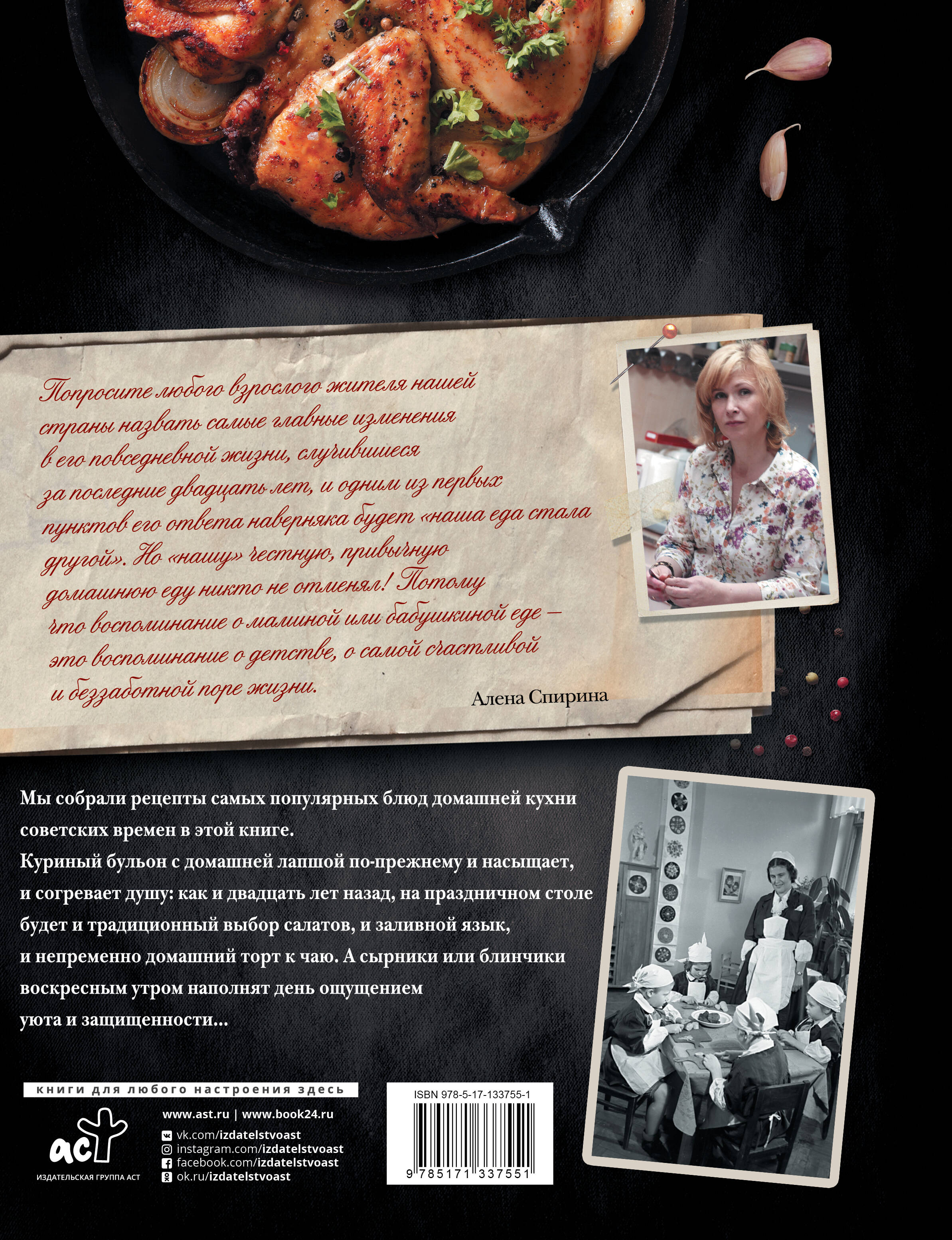 Мы собрали рецепты самых популярных блюд домашней кухни советских времен в этой книге. Куриный бульон с домашней лапшой по-прежнему и насыщает, и согревает душу: как и двадцать лет назад, на праздничном столе будет и традиционный выбор салатов, и заливной язык, и непременно домашний торт к чаю. А сырники или блинчики воскресным утром наполнят день ощущением уюта и защищенности. Попросите любого взрослого жителя нашей страны назвать самые главные изменения в его повседневной жизни, случившиеся за последние двадцать лет, и одним из первых пунктов его ответа наверняка будет "наша еда стала другой". Но "нашу" честную, привычную домашнюю еду никто не отменял! Потому что воспоминание о маминой или бабушкиной еде - это воспоминание о детстве, о самой счастливой и беззаботной поре жизни. Алена Спирина| Издательство | Издательство "АСТ" |