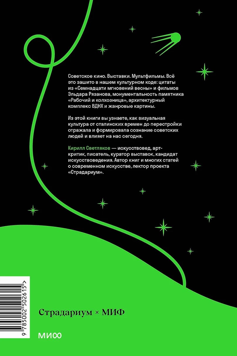 Советское кино. Выставки. Мультфильмы. Всё это зашито в нашем культурном коде: цитаты из «Семнадцати мгновений весны» и фильмов Эльдара Рязанова, монументальность памятника «Рабочий и колхозница», архитектурный комплекс ВДНХ и жанровые картины. Из этой книги вы узнаете, как визуальная культура от сталинских времен до перестройки отражала и формировала сознание советских людей и влияет на нас сегодня. Кирилл Светляков - искусствовед, арт-критик, писатель, куратор выставок, кандидат искусствоведения. Автор книг и многих статей о современном искусстве, лектор проекта «Страдариум».| Издательство | Манн, Иванов и Фербер |