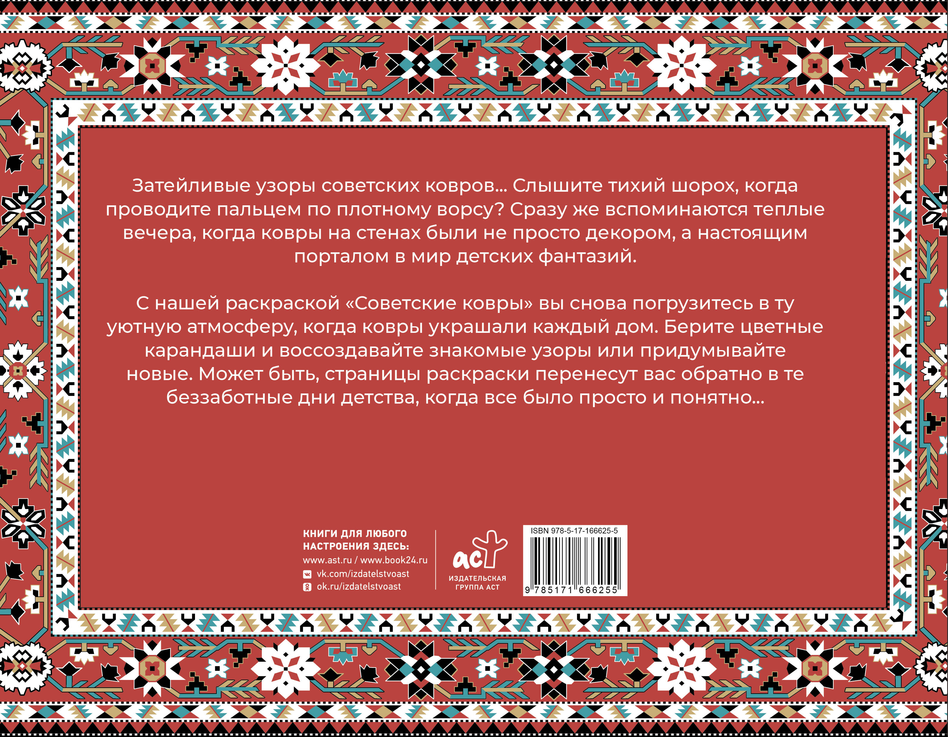 С нашей раскраской «Советские ковры» вы снова погрузитесь в ту уютную атмосферу, когда ковры украшали каждый дом. Берите цветные карандаши и воссоздавайте знакомые узоры или придумывайте новые. Добавьте яркости советским коврам с помощью красок или фломастеров - плотная бумага выдержит все ваши творческие эксперименты.| Издательство | Издательство "АСТ" |
