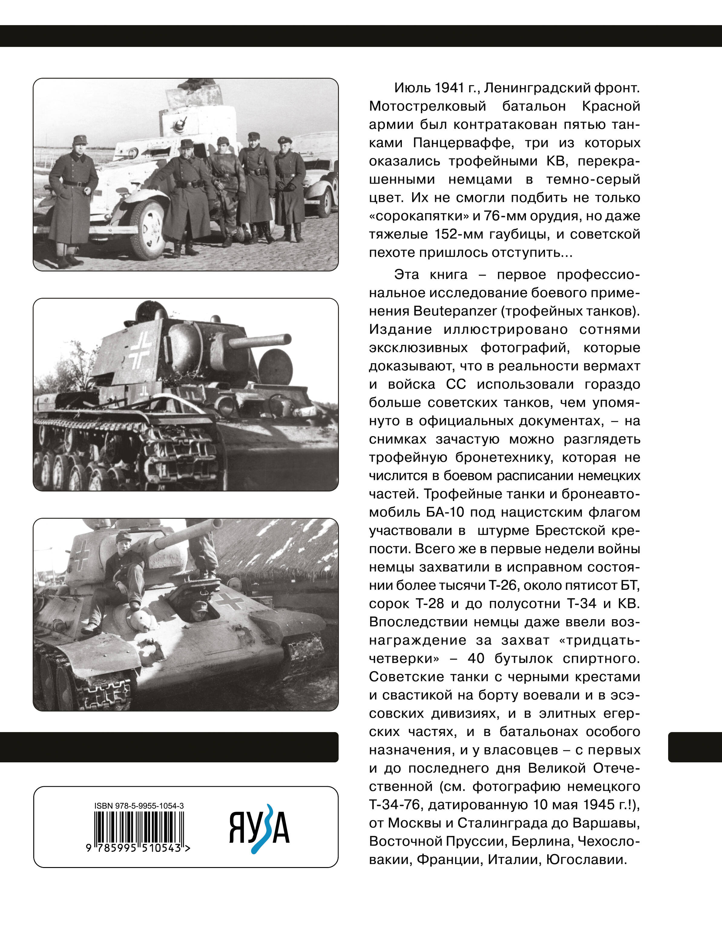Июль 1941 г., Ленинградский фронт. Мотострелковый батальон Красной Армии был контратакован пятью танками Панцерваффе, три из которых оказались трофейными КВ, перекрашенными немцами в темно-серый цвет. Их не смогли подбить не только «сорокопятки» и 76-мм орудия, но даже тяжелые 152-мм гаубицы, и советской пехоте пришлось отступить… Эта книга - первое профессиональное исследование боевого применения Beutepanzer (трофейных танков). Издание иллюстрировано сотнями эксклюзивных фотографий, которые доказывают, что в реальности Вермахт и войска СС использовали гораздо больше советских танков, чем упомянуто в официальных документах, - на снимках зачастую можно разглядеть трофейную бронетехнику, которая не числится в боевом расписании немецких частей. Трофейные танки и бронеавтомобиль БА-10 под нацистским флагом участвовали в штурме Брестской крепости. Всего же в первые недели войны немцы захватили в исправном состоянии более тысячи Т-26, около пятисот БТ, сорок Т-28 и до полусотни Т-34 и КВ. Впоследствии немцы даже ввели вознаграждение за захват «тридцатьчетверки» - 40 бутылок спиртного. Советские танки с черными крестами и свастикой на борту воевали и в эсэсовских дивизиях, и в элитных егерских частях, и в батальонах особого назначения, и у власовцев - с первых и до последнего дня Великой Отечественной (см. фотографию немецкого Т-34-76, датированную 10 мая 1945 г.!), от Москвы и Сталинграда до Варшавы, Восточной Пруссии, Берлина, Чехословакии, Франции, Италии, Югославии.