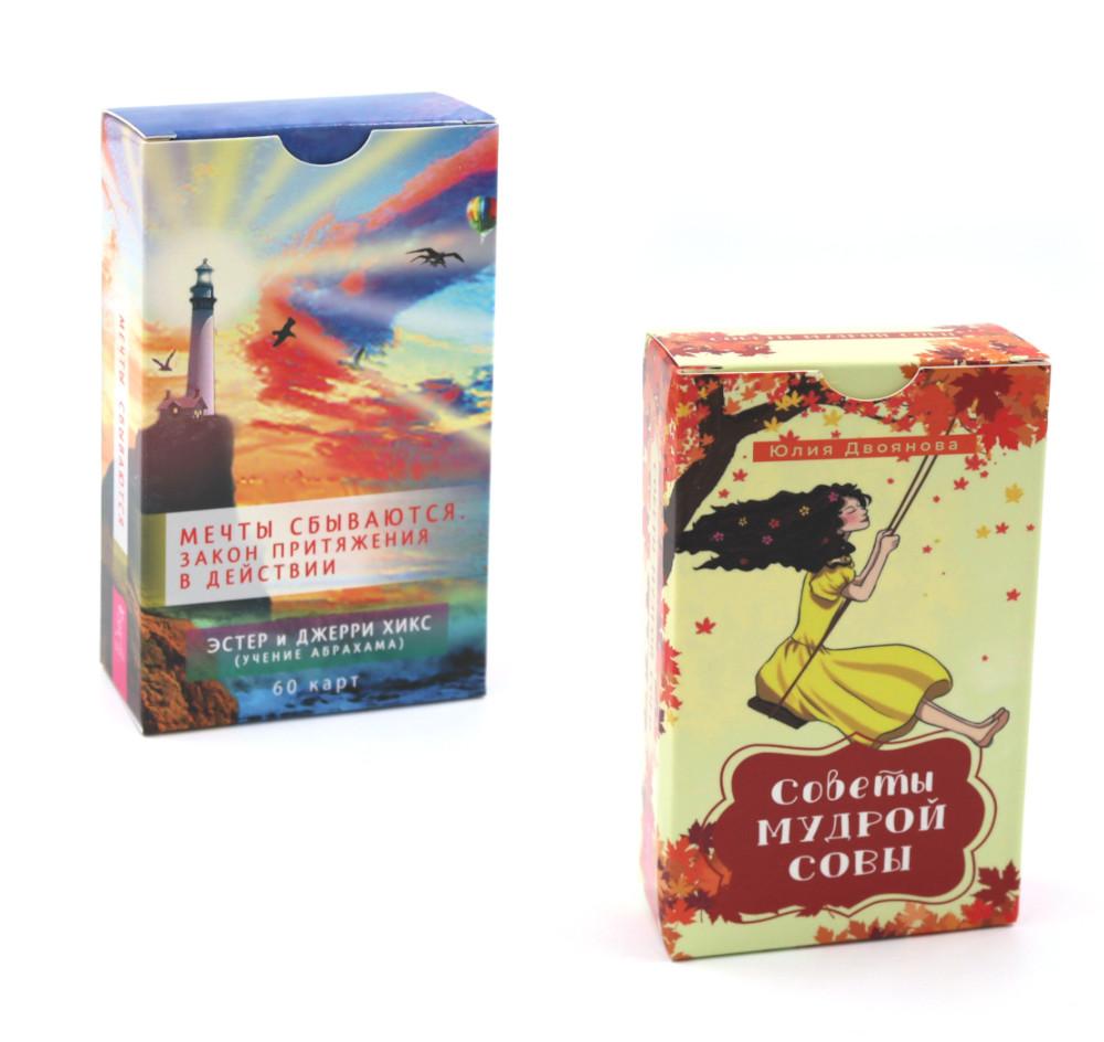 Комплект из 2 наборов карт: «Советы мудрой совы» «Советы мудрой совы» - яркая, глубокая и понятная колода. Она предназначена для профессиональных тарологов и любителей различных мантических систем. В колоде 64 карты с ясными и простыми советами на все случаи жизни (например, «Не бойся рисковать», «Живи здесь и сейчас», «Прояви терпение», «Тебе нужен отдых»). Карта под номером 65 содержит ещё одно важное послание и в то же время служит образцом для заполнения следующих 4 дополнительных карт. В пустые «окошки» карт под номерами 66-69 вы можете вписать советы, близкие именно вам. Благодаря своей структуре оракул универсален в работе и не требует специализированных знаний. Вы сможете получить напутствие на день, лучше раскрыть личность интересующего вас человека, посмотреть итоговый совет в конце расклада, а из брошюры - узнать соответствие каждой карты арканам Таро Уэйта. «Мечты сбываются» В ваших руках - ключ к осуществлению желаний. Возможно, прежде, качаясь на волнах своей мечты, вы испытывали сомнения и страх, из-за которых желанный момент, подобно миражу на горизонте, то появлялся, то исчезал, но постоянно оставался вдалеке. Теперь у вас есть реальный шанс устранить все препятствия. Благодаря колоде карт «Мечты сбываются»(60 карт) вы научитесь управлять энергией своих желаний, использовать мысли и чувства как паруса, которые, наполнившись ветром намерения, быстро донесут вас к берегам Счастья.| Издательство | ИГ Весь |