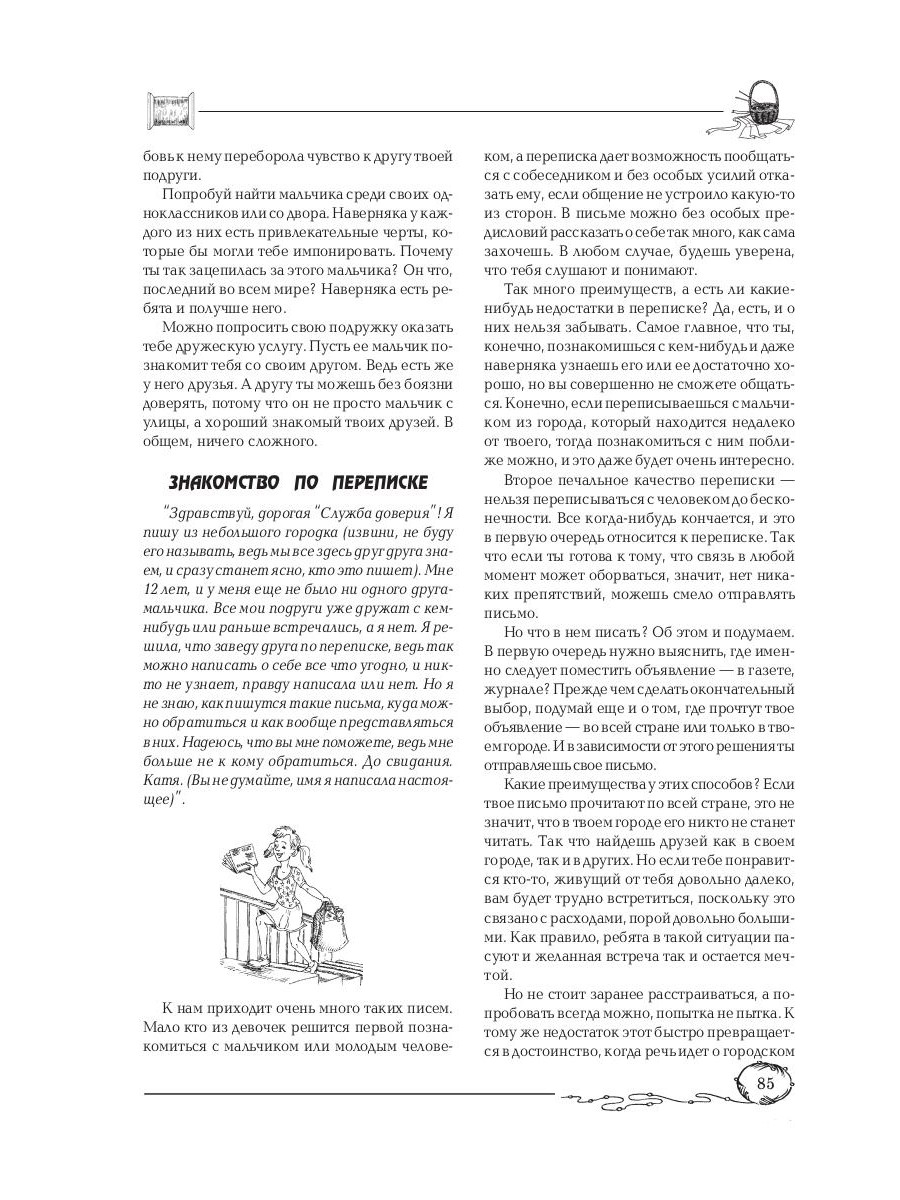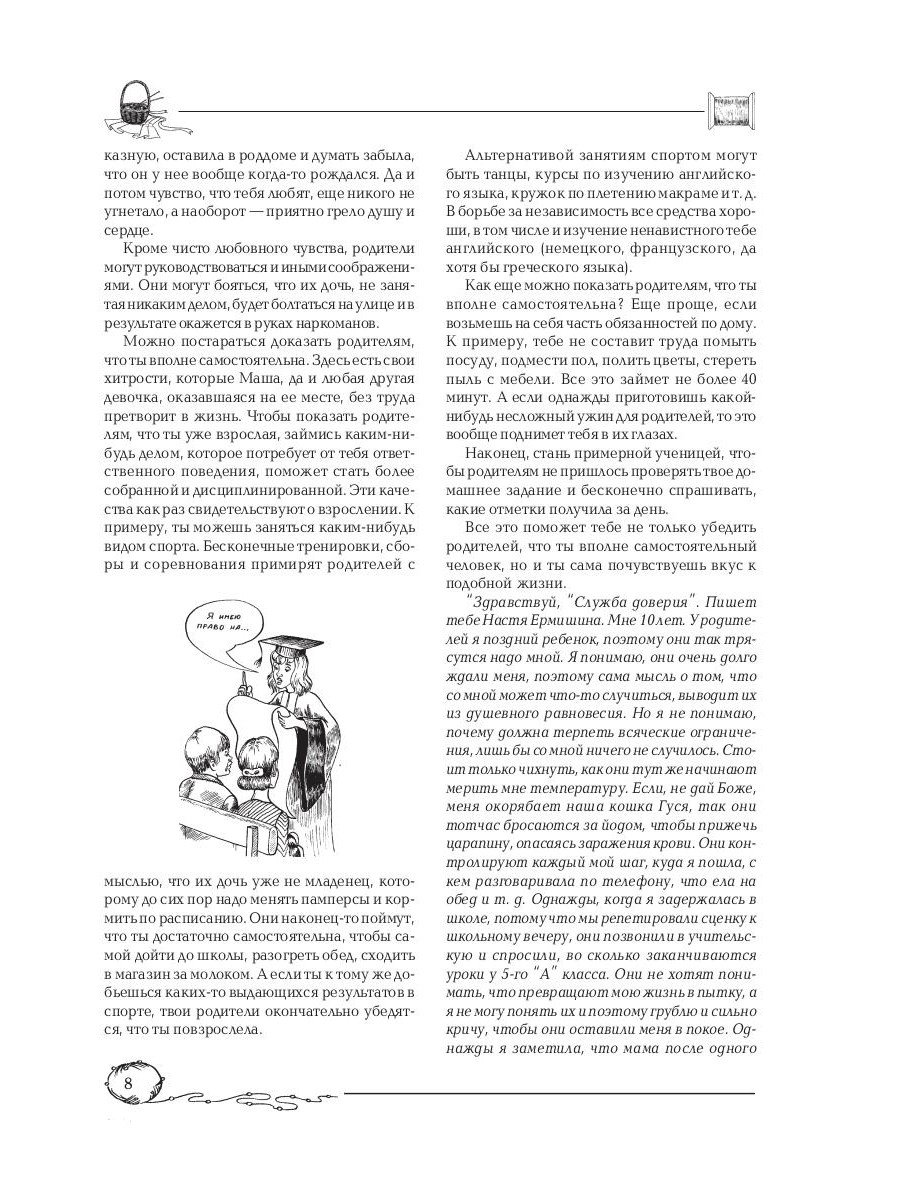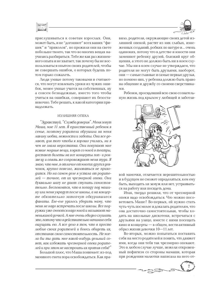 Если ты нуждаешься в помощи, но не знаешь, у кого попросить совета, данная книга тебе поможет. Она посоветует, как быть, если в классе тебя обижают, как разобраться в своих чувствах, как обратить внимание мальчика на себя. Она расскажет, как справиться с чувством ревности при рождении маленькой сестренки, как развеять тоску и плохое настроение, как подружиться и найти общий язык с окружающими. Подобные проблемы волнуют большинство твоих сверстниц. В их письмах ты найдешь созвучные тебе темы, а опытный психолог расскажет, как вести себя в тех или иных ситуациях.| Издательство | Т8 RUGRAM |