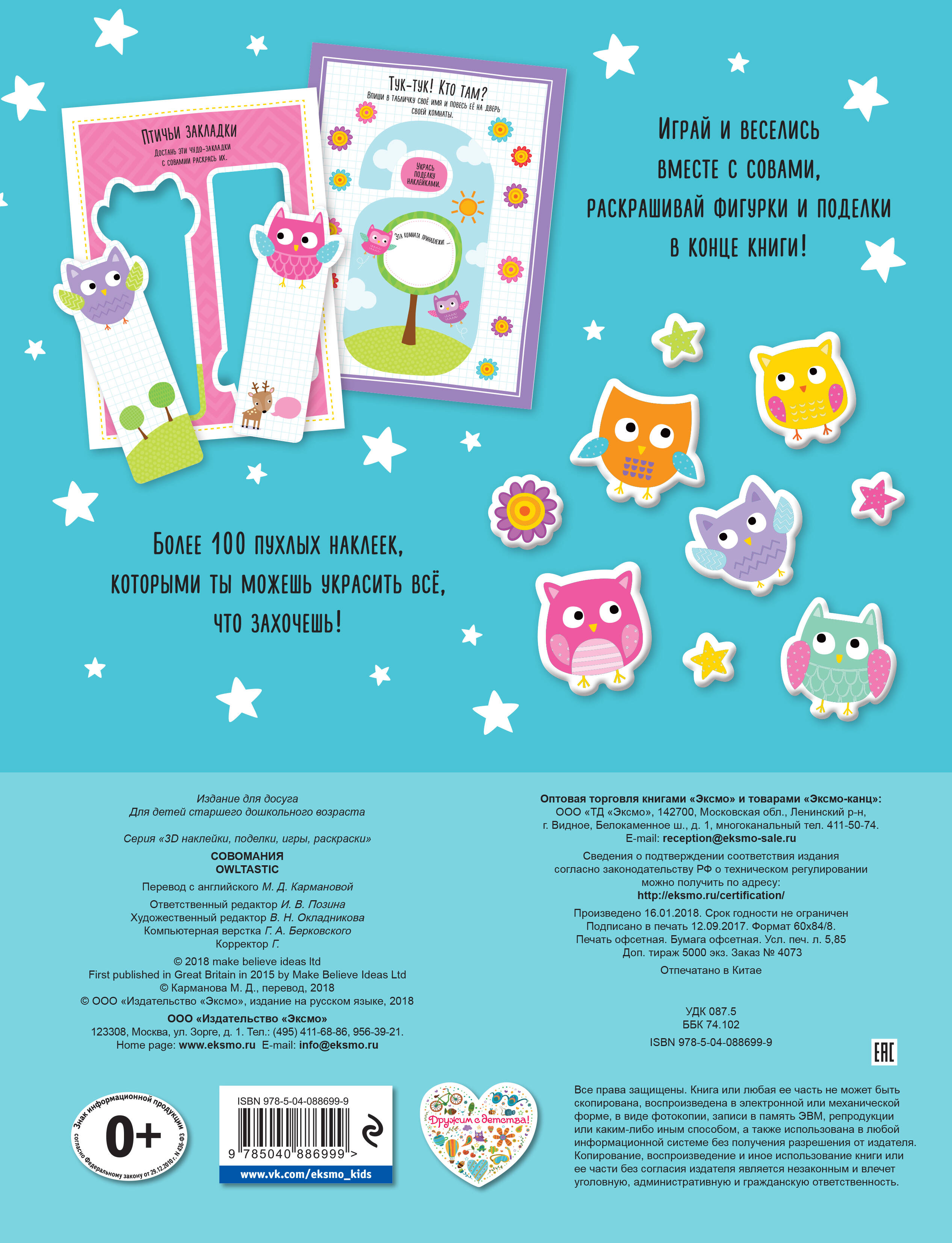 Фишки серии - более 100 многоразовых объемных наклеек; - 20 картонных страниц с поделками, не требующих вырезания; - в серии представлен большой выбор тем, чтобы каждый ребенок мог подобрать подходящую ему книгу; - красочные и запоминающиеся развороты; - разнообразные задания, нацеленные на всестороннее развитие ребенка; - благодаря огромному количеству игр и поделок, родители могут веселиться вместе со своими детьми; - из обложки книги можно сделать рамку для своей фотографии или любимой картинки.| Издательство | ООО "Издательство "Эксмо" |