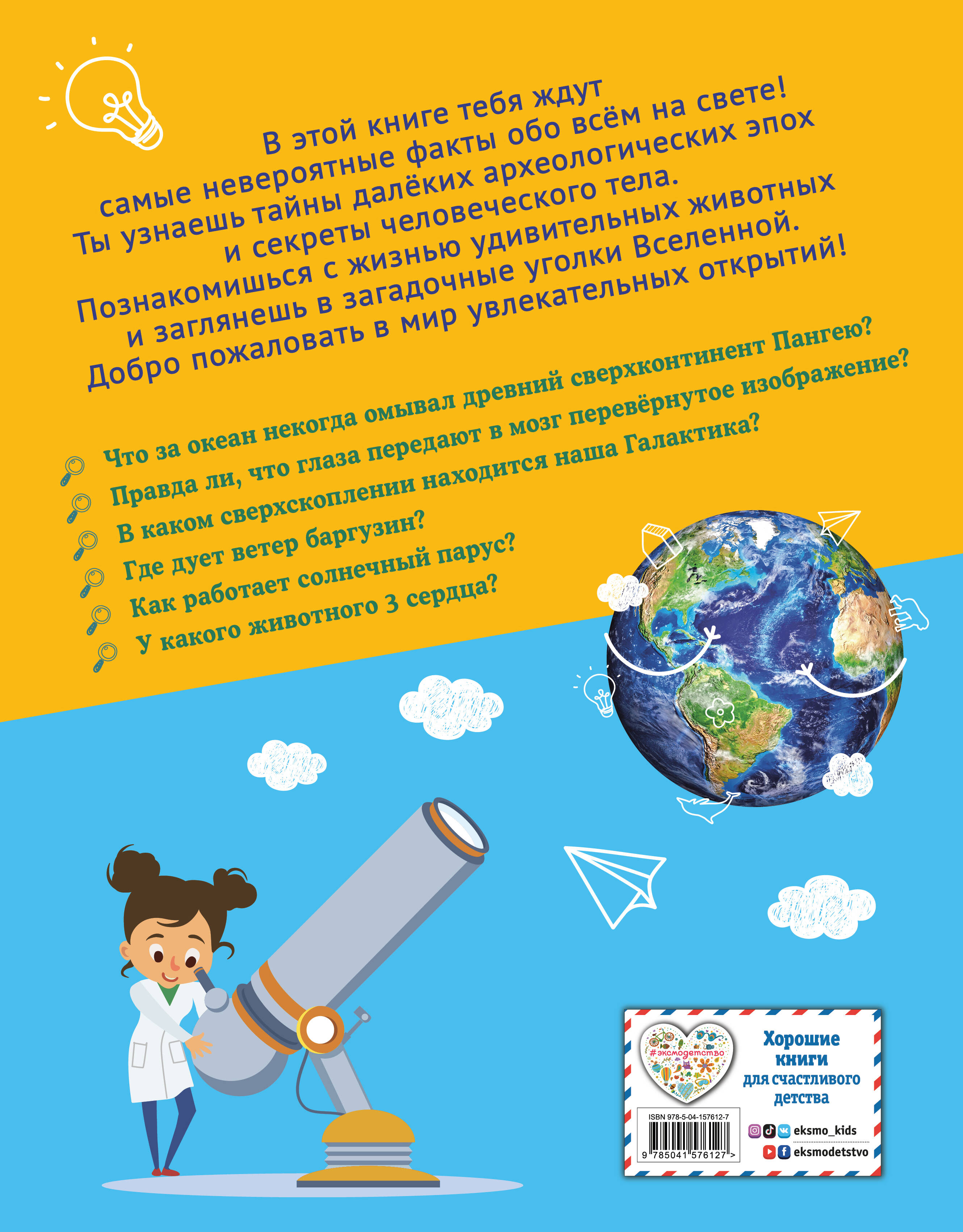 Тебе интересно узнавать любопытные факты обо всём на свете? Считаешь себя настоящим эрудитом? Тогда пройди мини-тест: выбери из этих утверждений только правильные: • Чёрные дыры состоят из тёмной материи. • Крупнейшее массовое вымирание в истории Земли произошло 65 000 000 лет назад. • Самое быстрое животное - это гепард. • Основной объём в составе человеческой крови занимают красные кровяные тельца. Ну как, получилось отыскать верные тезисы или сомневаешься в получившемся результате? На самом деле ошибочны абсолютно все эти утверждения! Хочешь узнать, из чего же на самом деле состоят чёрные дыры, какое животное на нашей планете самое быстрое, а также открыть множество других удивительных тайн? Тогда эта книга - именно то, что тебе нужно! Ведь в ней собраны самые главные секреты космоса, Земли, животных и даже человеческого организма.| Издательство | Эксмо |