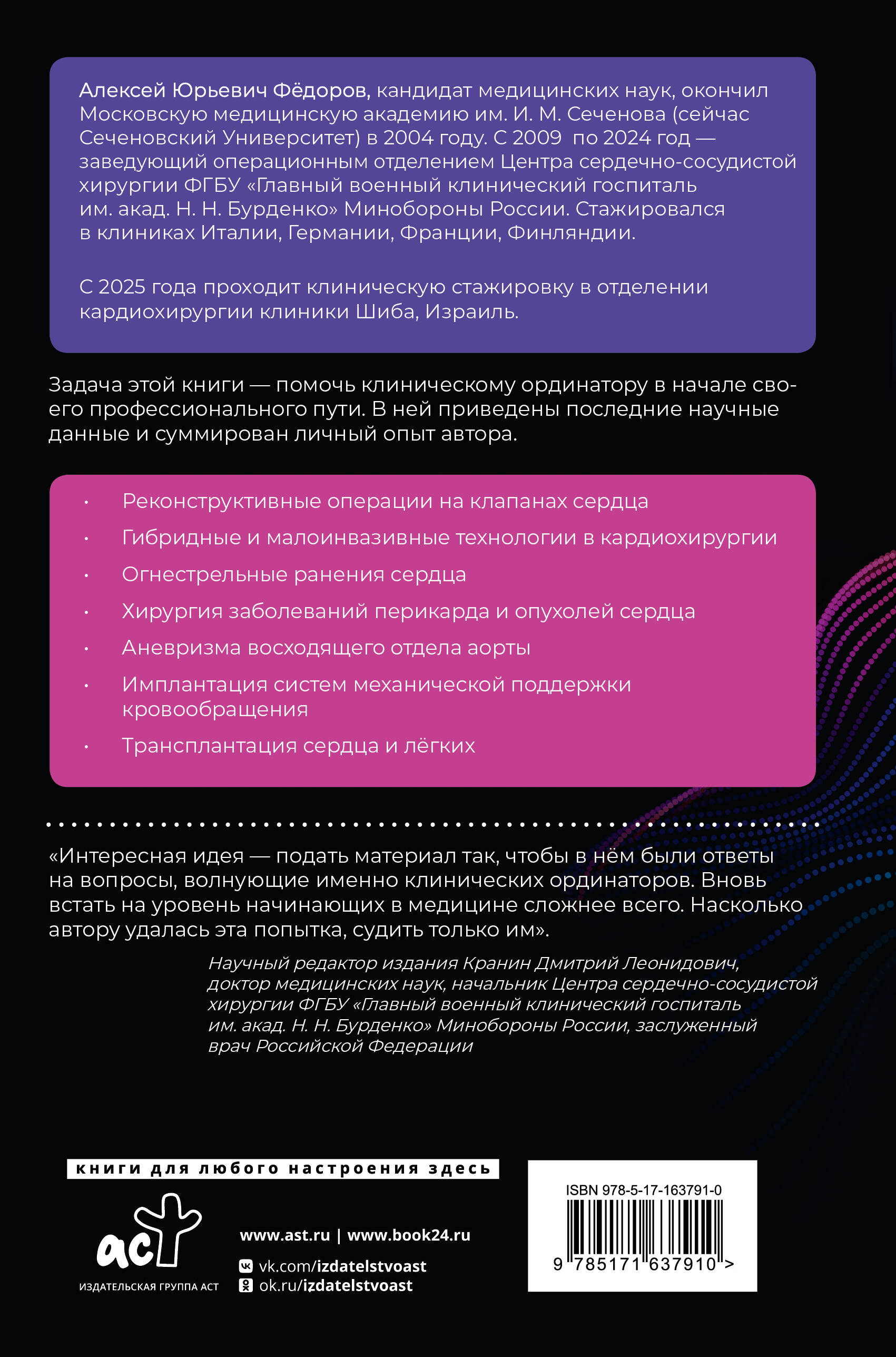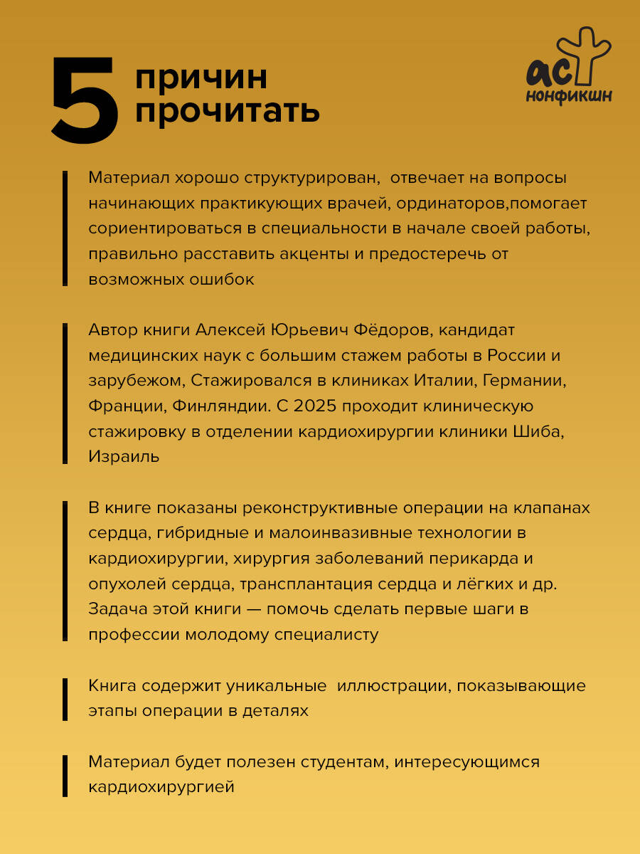 Задача этой книги - помочь сделать первые шаги в профессии молодому специалисту. В ней заложена попытка автора посмотреть на этап клинической ординатуры глазами хирурга, обладающего опытом и знаниями, правильно расставить акценты и предостеречь от возможных ошибок, цена которых в кардиохирургии традиционно высока. Материал будет полезен студентам, интересующимся кардиохирургией, участникам студенческих научных кружков, клиническим ординаторам, аспирантам и врачам - сердечно-сосудистым хирургам в первые годы самостоятельной работы.| Издательство | Издательство "АСТ" |