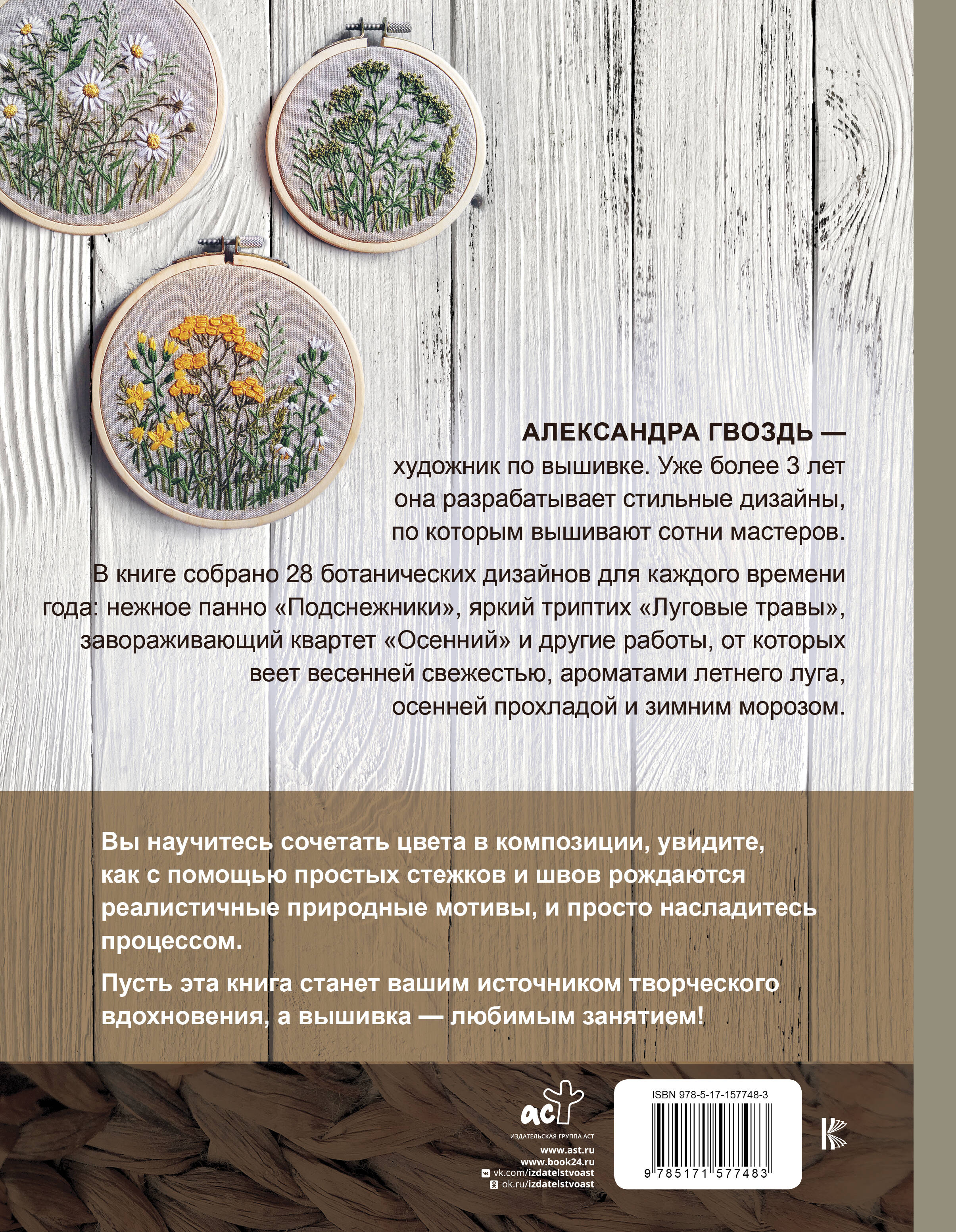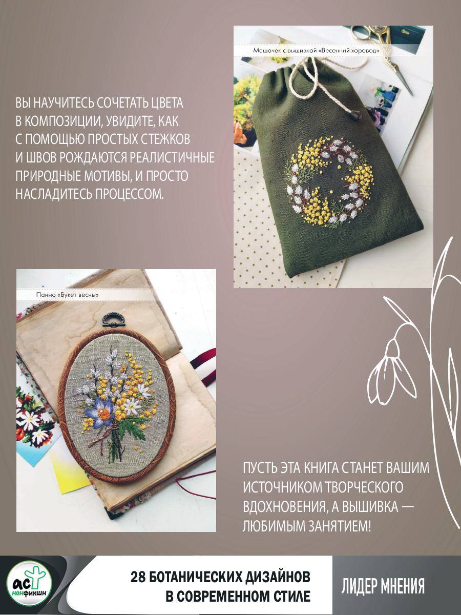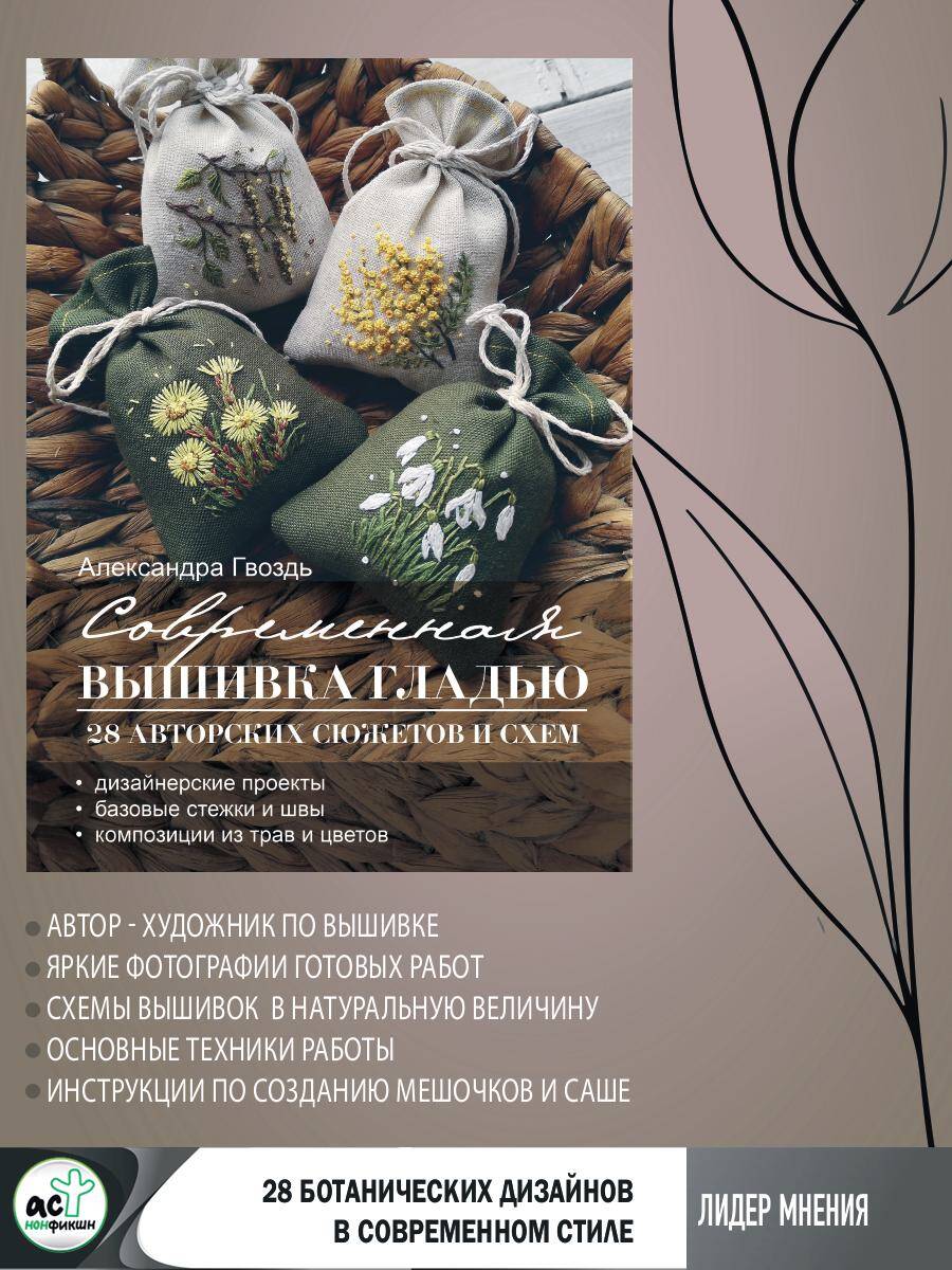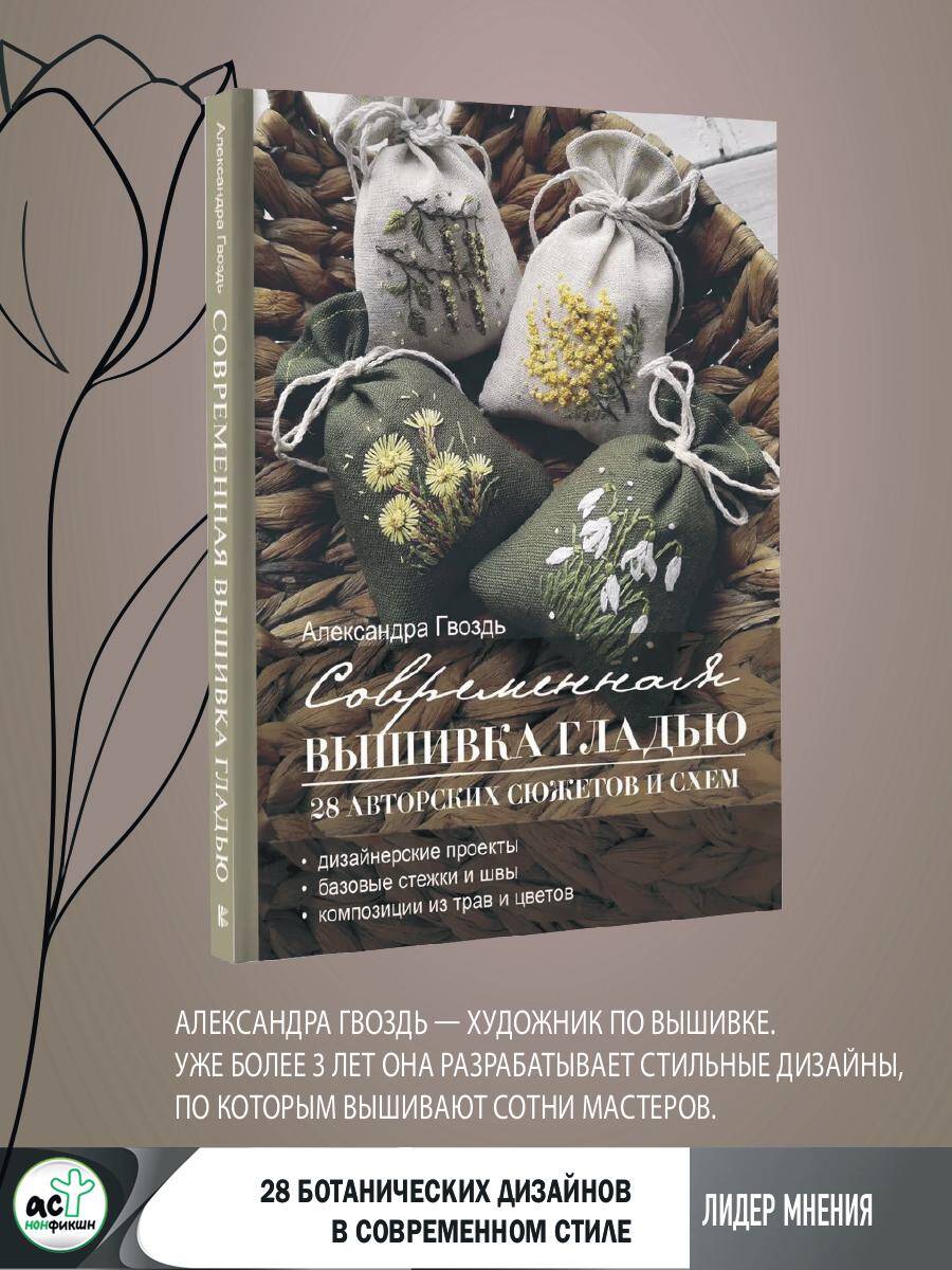 Александра Гвоздь - художник по вышивке. Уже более 3 лет она разрабатывает стильные дизайны, по которым вышивают сотни мастеров. В книге собрано 28 ботанических дизайнов для каждого времени года: нежное панно "Подснежники", яркий триптих "Луговые травы", завораживающий квартет "Осенний" и другие работы, от которых веет весенней свежестью, ароматами летнего луга, осенней прохладой и зимним морозом. Вы научитесь сочетать цвета в композиции, увидите, как с помощью простых стежков и швов рождаются реалистичные природные мотивы, и просто насладитесь процессом. Пусть эта книга станет вашим источником творческого вдохновения, а вышивка - любимым занятием!| Издательство | ИЗДАТЕЛЬСТВО "АСТ" |