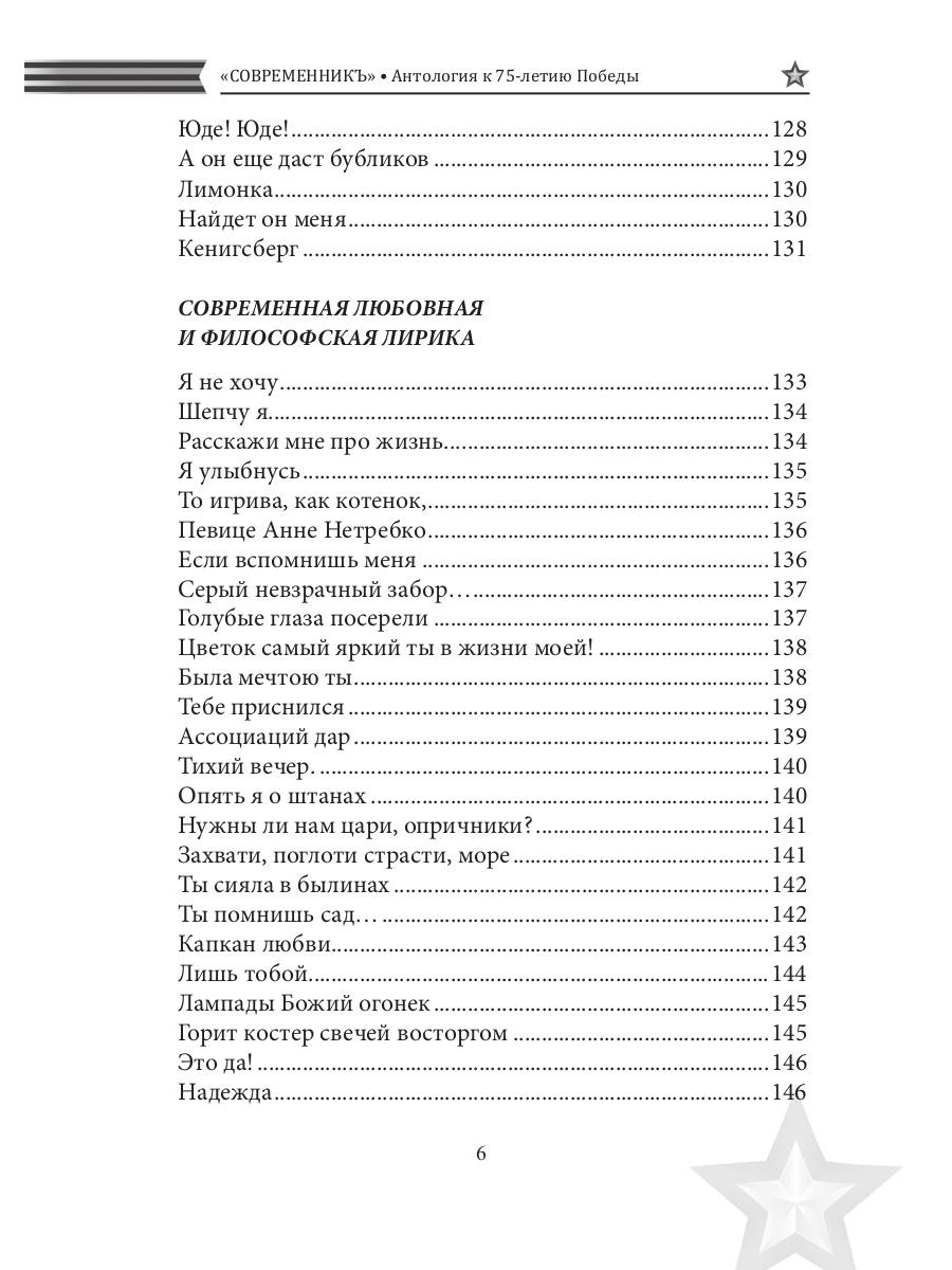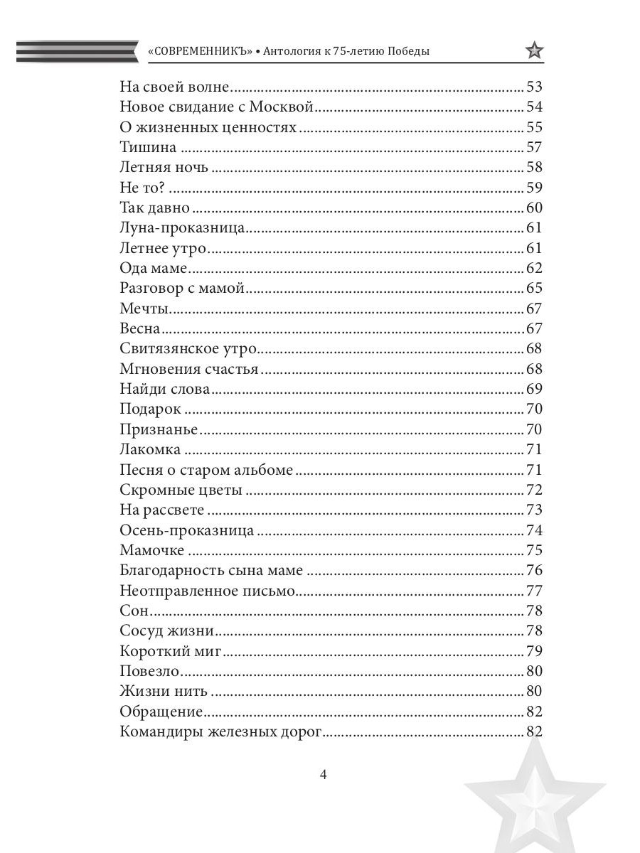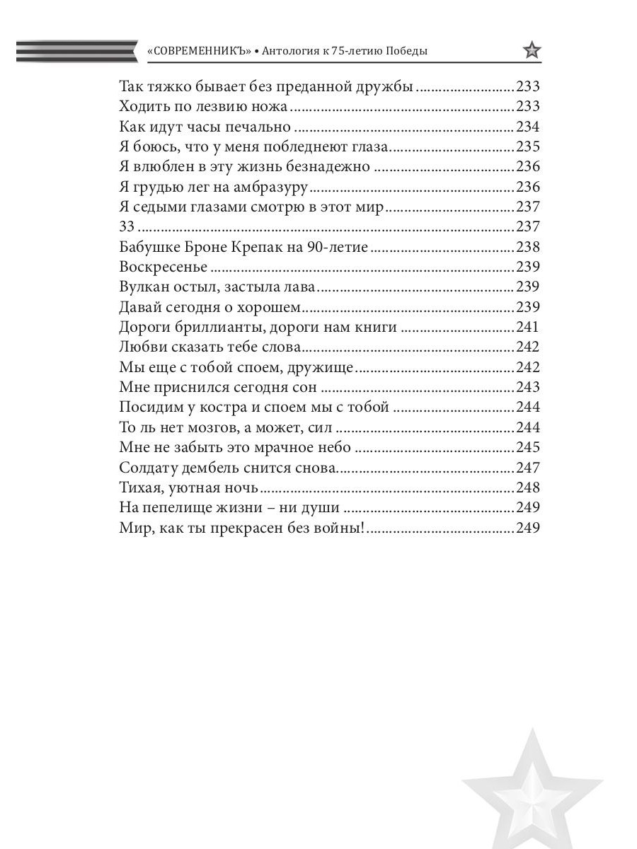 Однако военной тематикой далеко не исчерпывается многообразие произведений, включенных в эту антологию. Немало стихов, объединенных в этом издании, посвящено любви, человеческой мудрости, красоте мира. Мира, который ценой жизни сберегли для нас герои.