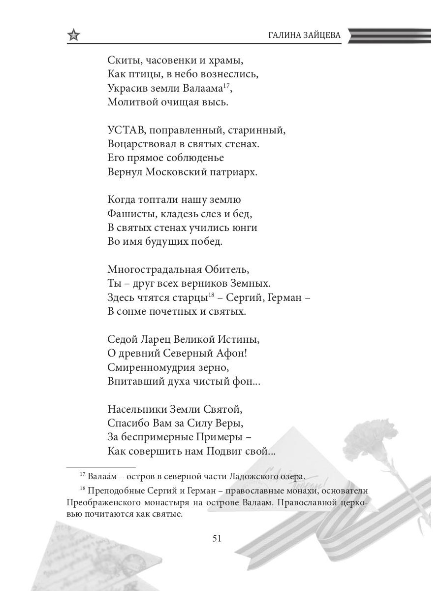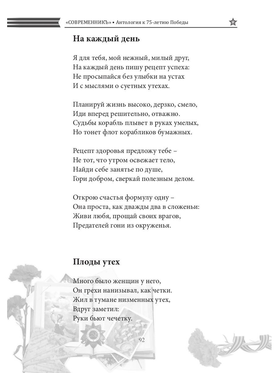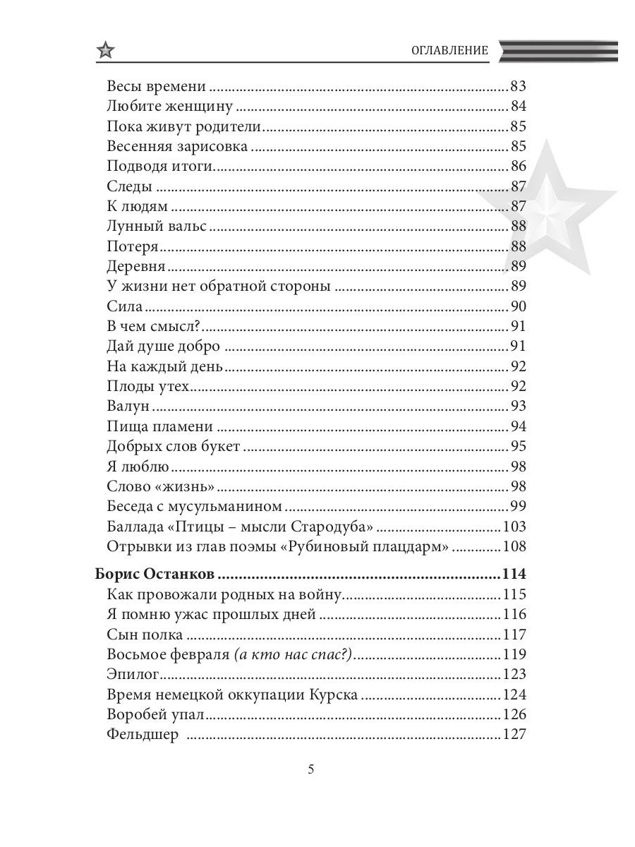 Однако военной тематикой далеко не исчерпывается многообразие произведений, включенных в эту антологию. Немало стихов, объединенных в этом издании, посвящено любви, человеческой мудрости, красоте мира. Мира, который ценой жизни сберегли для нас герои.