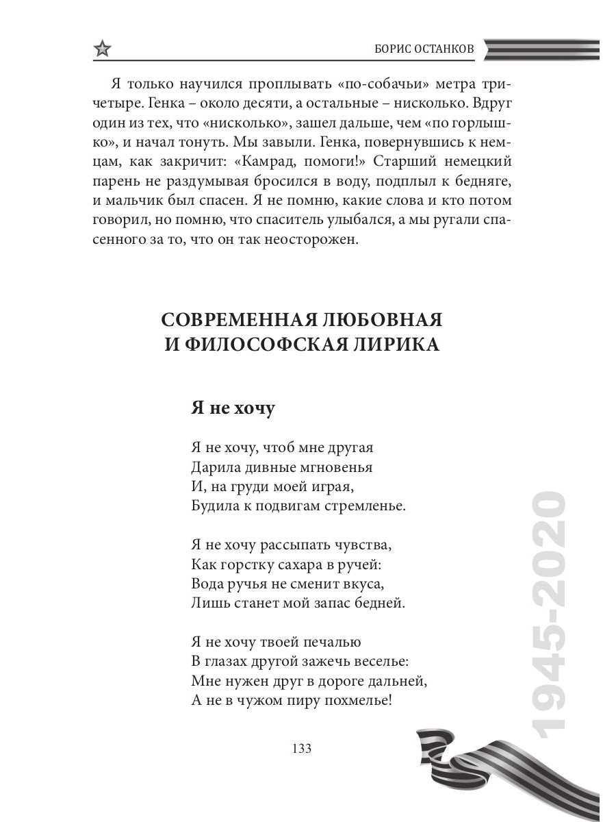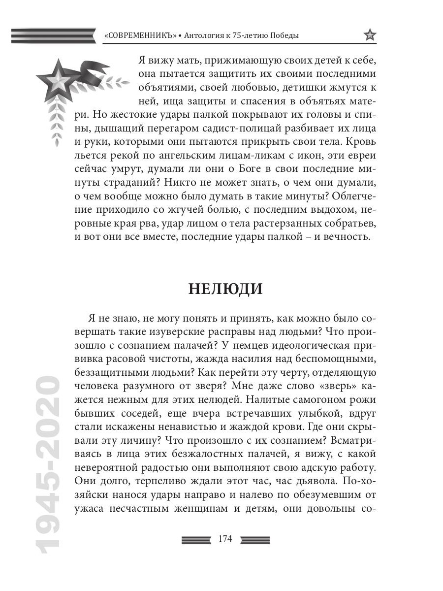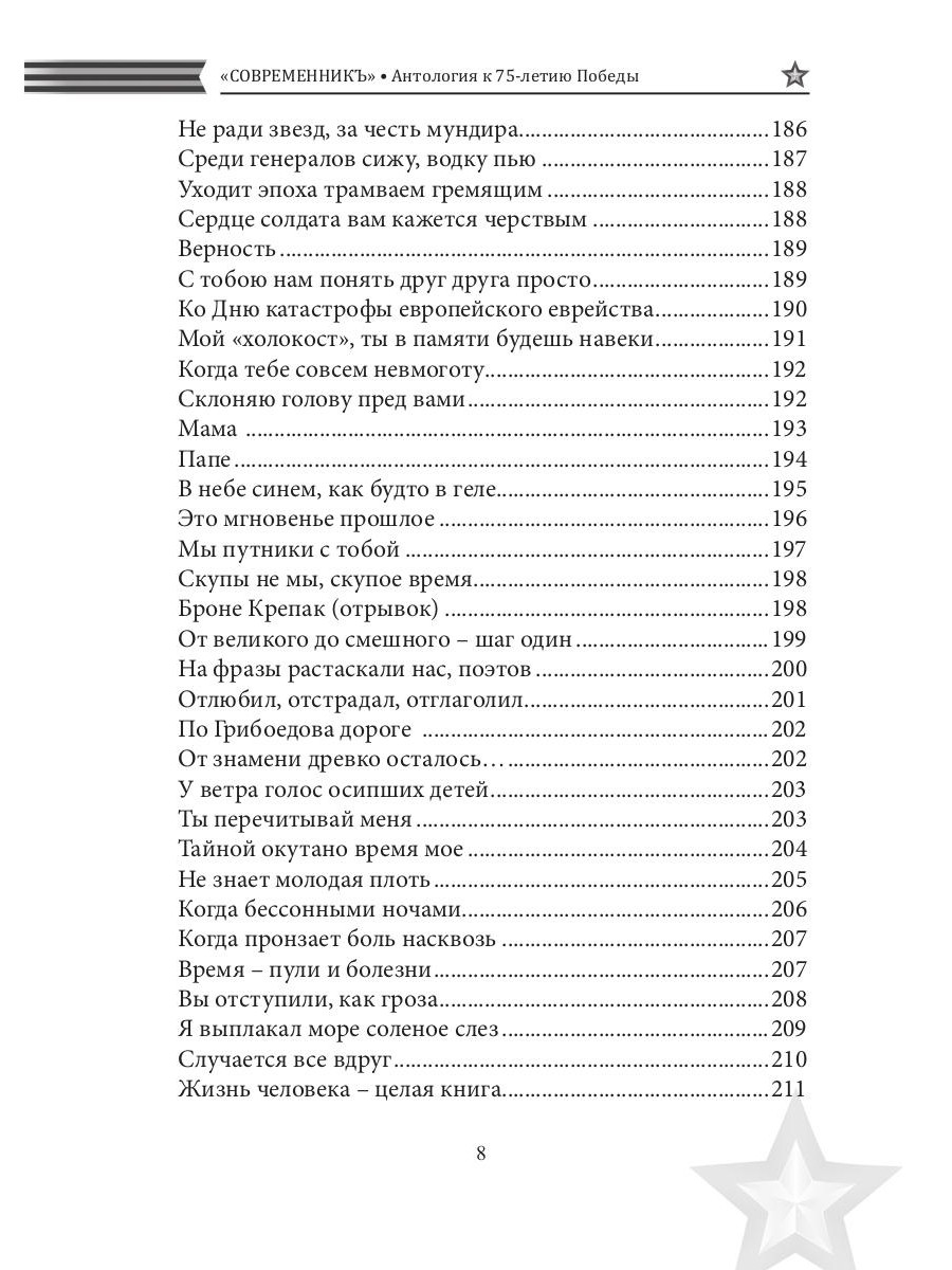 Во второй том антологии «СовременникЪ. 75 лет Победы» вошли поэзия и проза Галины Зайцевой, Бориса Останкова, Александра-Ошера Штейнберга. Конечно же, центральное место в книге занимают произведения, обращенные в прошлое, в том числе документальные рассказы и очерки о войне, о тех, кому выпала доля пережить это страшное время.
