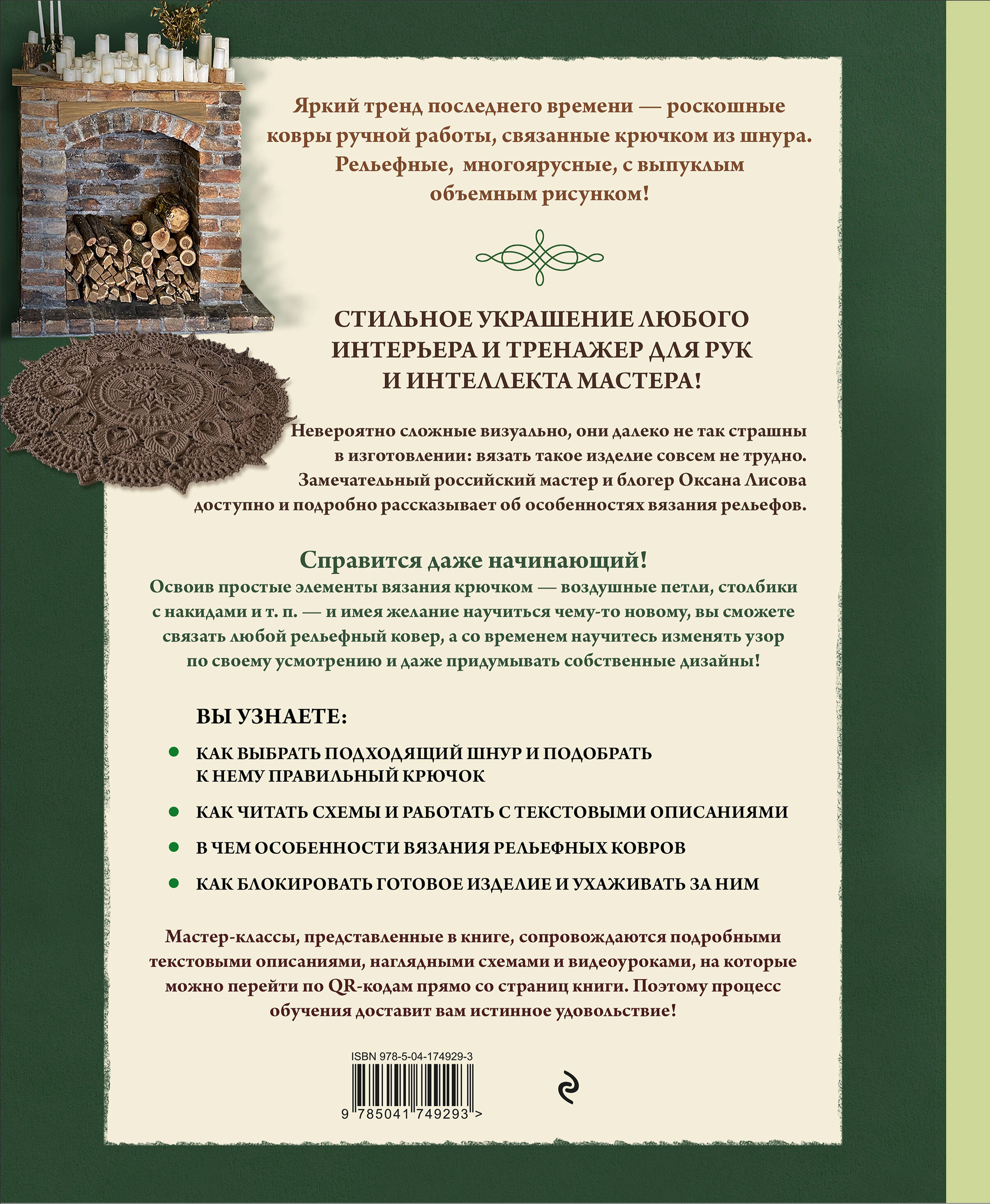Желание создать своими руками нечто эксклюзивное и прекрасное толкает мастериц в интересное «приключение» - вязание ковра. И не простого, а рельефного, связанного крючком из обыкновенного шнура! Стильное украшение любого интерьера и тренажер для рук и интеллекта мастера! Невероятно сложные визуально, рельефные ковры далеко не так страшны в изготовлении: вязать такое изделие совсем не трудно. Справится даже начинающий! Освоив простые элементы вязания крючком - воздушные петли, столбики с накидами и т. п. и имея желание научиться чему-то новому, вы сможете связать любой рельефный ковер, а со временем научитесь изменять узор по своему усмотрению и даже придумывать собственные дизайны! Сделайте ваш интерьер неповторимым с коврами ручной работы, которые вы свяжете самостоятельно!| Издательство | ООО "Издательство "Эксмо" |