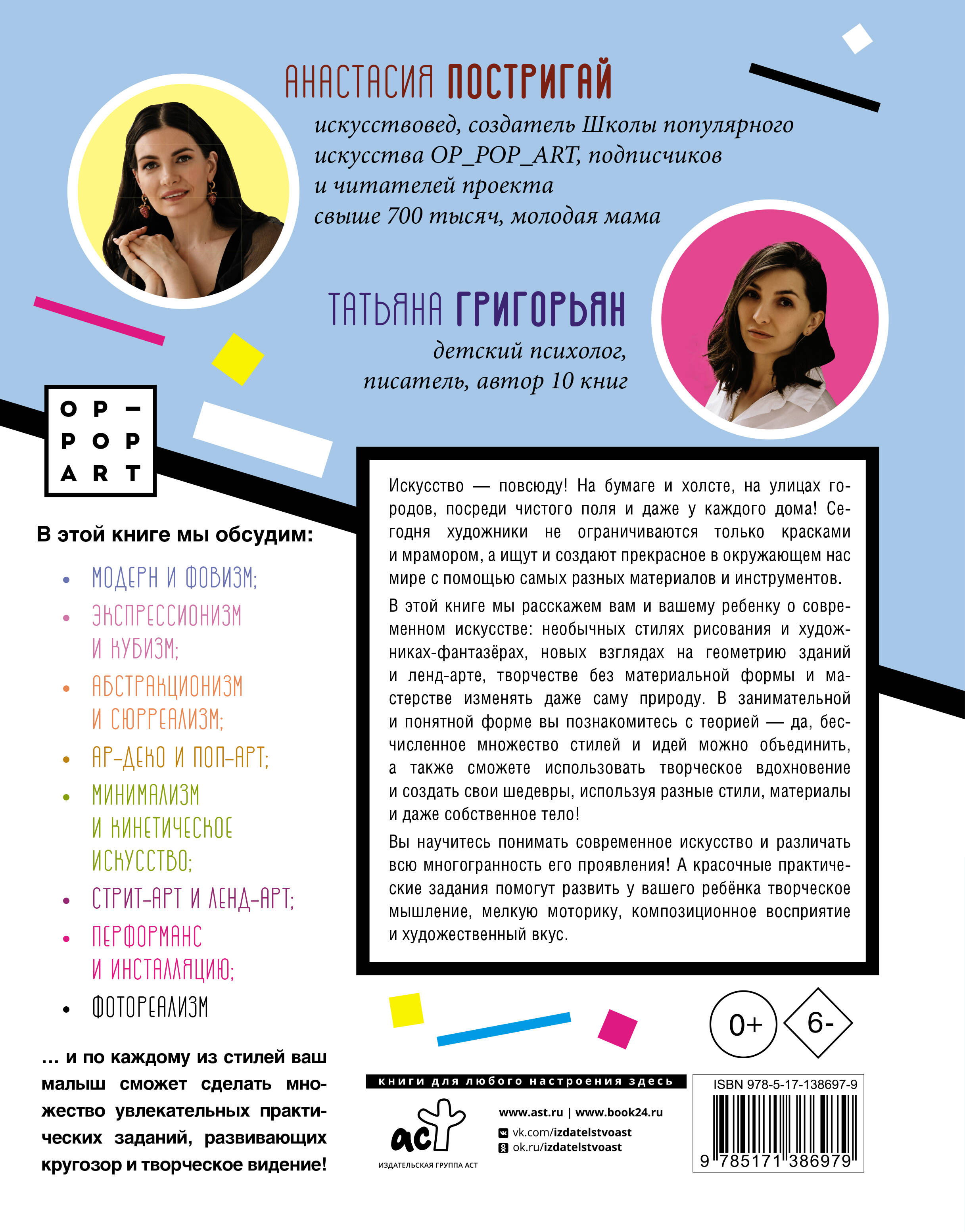 Как приобщить ребенка к искусству? Перед вами книга, которая сделает это легко! Она проведет вас и вашего малыша по основным направлениям и стилям современного искусства: от прекрасного модерна до дерзкого стрит-арта. Внутри вы найдете множество идей для семейного досуга. Яркие иллюстрации, веселые задания и игры 3-х уровней сложности помогут развить кругозор и эмоциональный интеллект, мелкую моторику, воображение и творческие способности ребенка. А вопросы в конце каждой главы станут поводом для оживленной дискуссии! Ваш малыш сможет заглянуть в прошлое, прогуляться по улицам самых красивых городов мира, побывать в мастерских великих художников и даже создать свой маленький шедевр. Отправляйтесь в большое арт-путешествие прямо сейчас!| Издательство | АСТ |