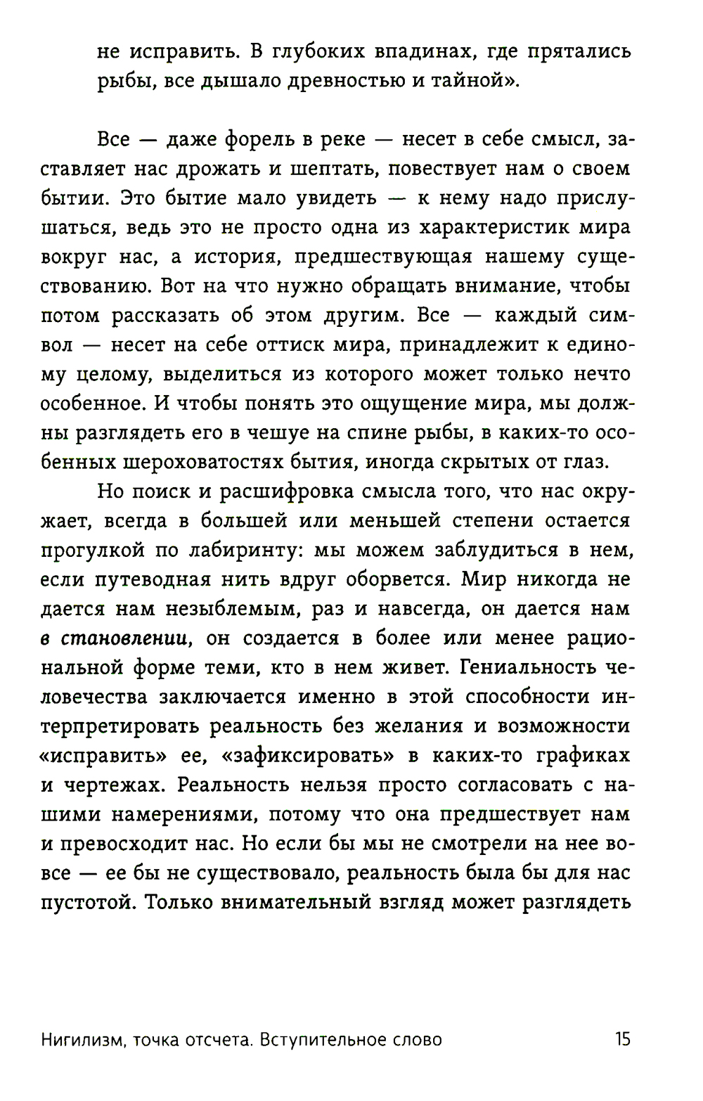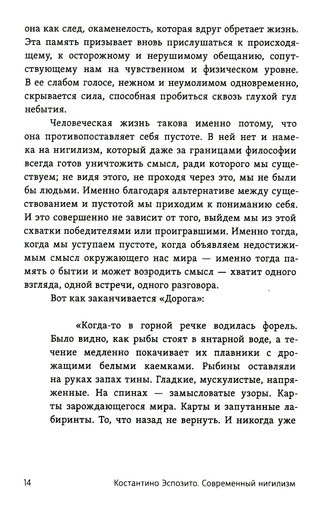Современный нигилизм - это и открытый вопрос, и новая повседневность, и продукт общества потребления. Как форма мышления, в прошлом революционная и смелая, привела нас к молчаливой константе «нет ценностей и нет идеалов»? Отрицать и ничего не искать - сейчас, в сложнейших реалиях, - тупик или освобождение? Костантино Эспозито, итальянский академик и преподаватель философии в Университете Бари, ведет хронику этого явления и показывает, как нигилизм высвечивается в элементах современной культуры. Это и разговоры со студентами, и размышления над текстами Уоллеса, Маккарти, Уэльбека, Рота, Хайдеггера и Ницше, картинами Альберта Бурри и Лучо Фонтана, даже сериалом «Настоящий детектив» и мультфильмом «Головоломка». Автор подарил читателям в это тревожное время терапевтический и воодушевляющий текст, который мерцает во тьме.