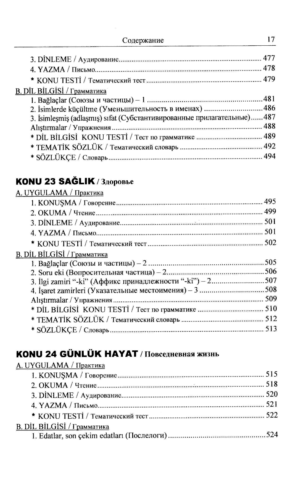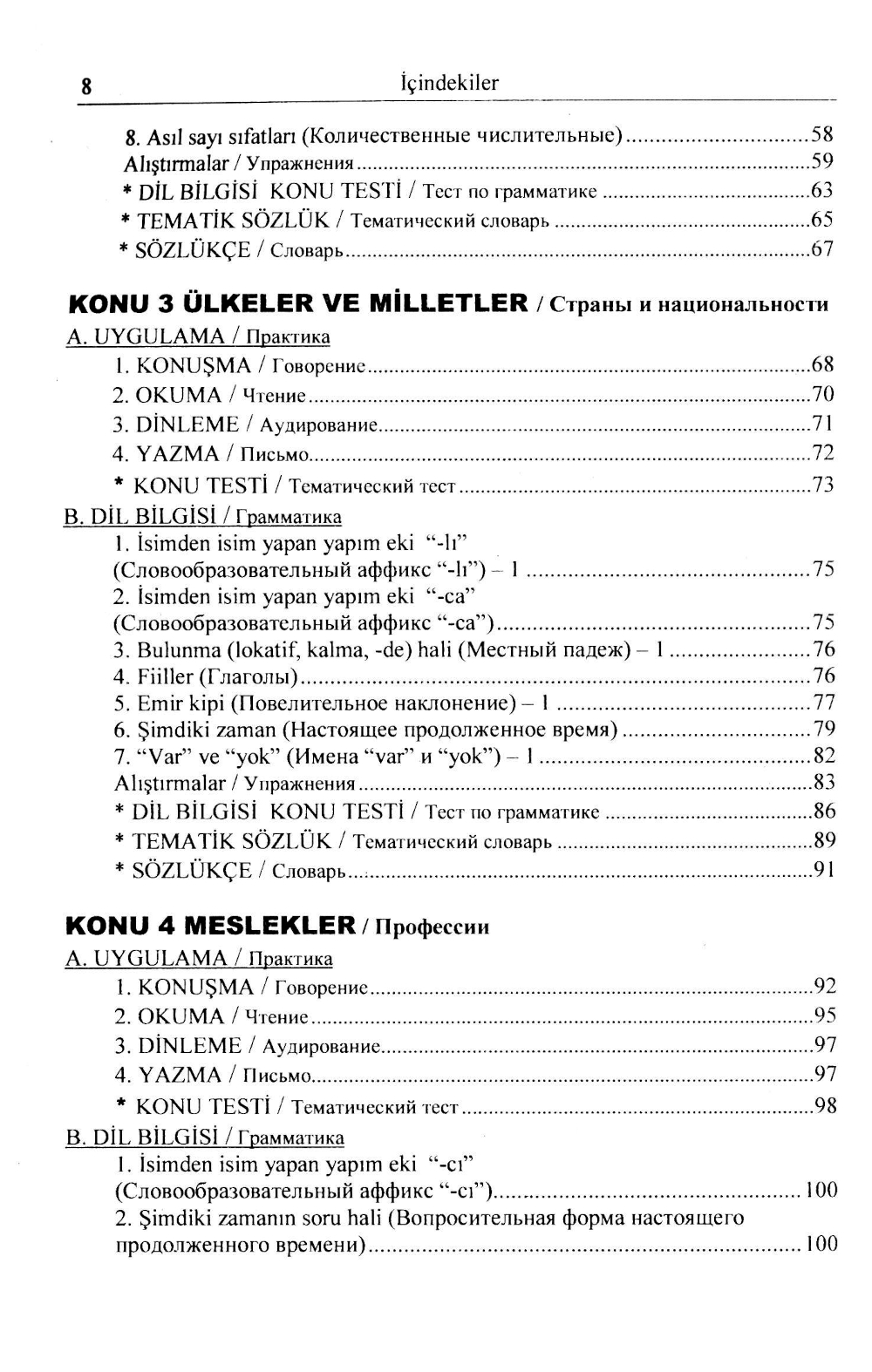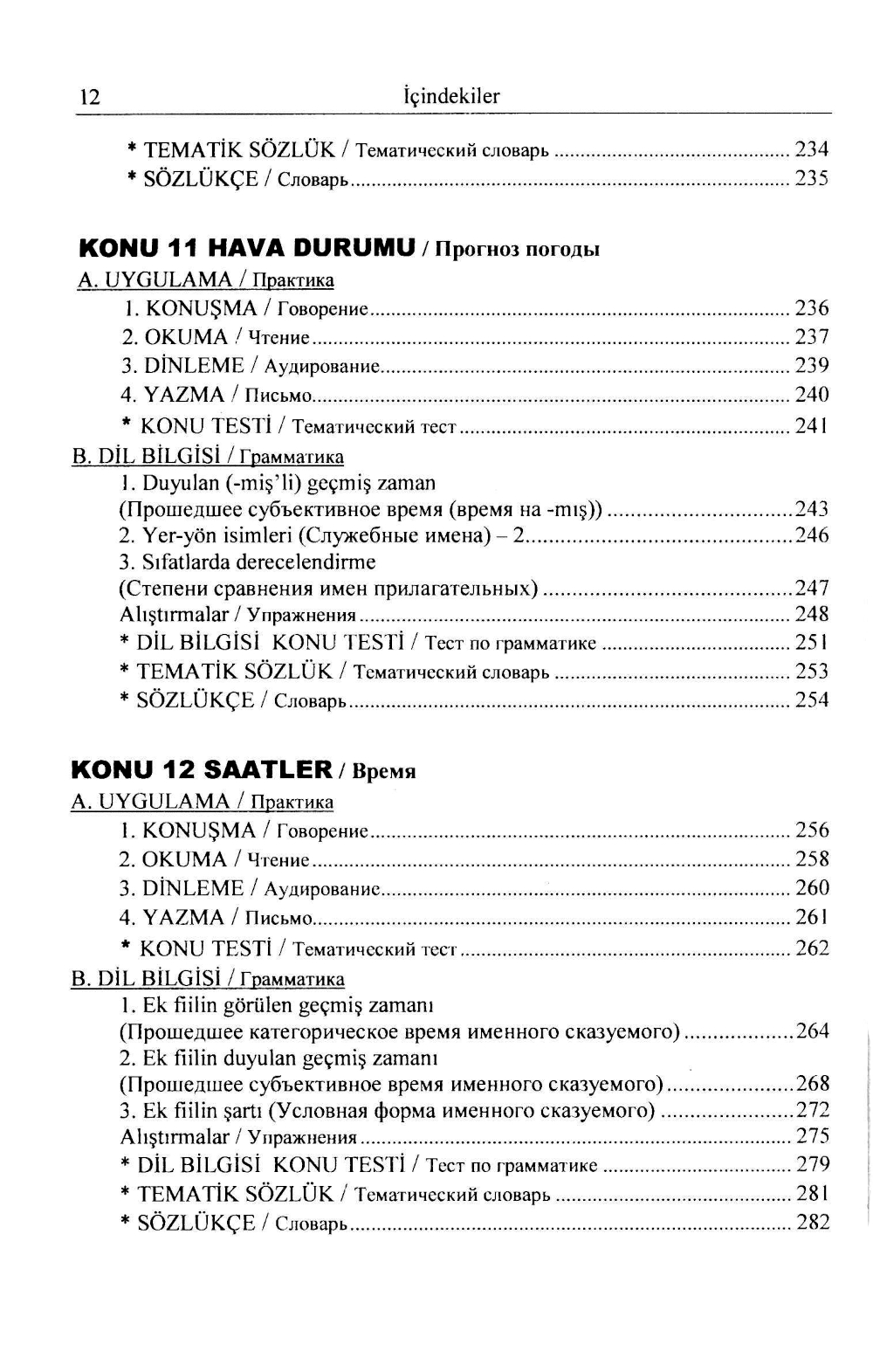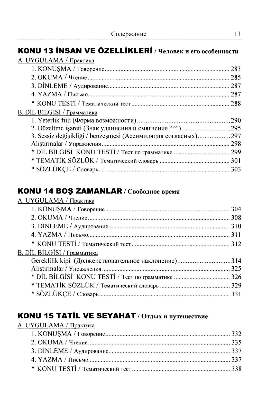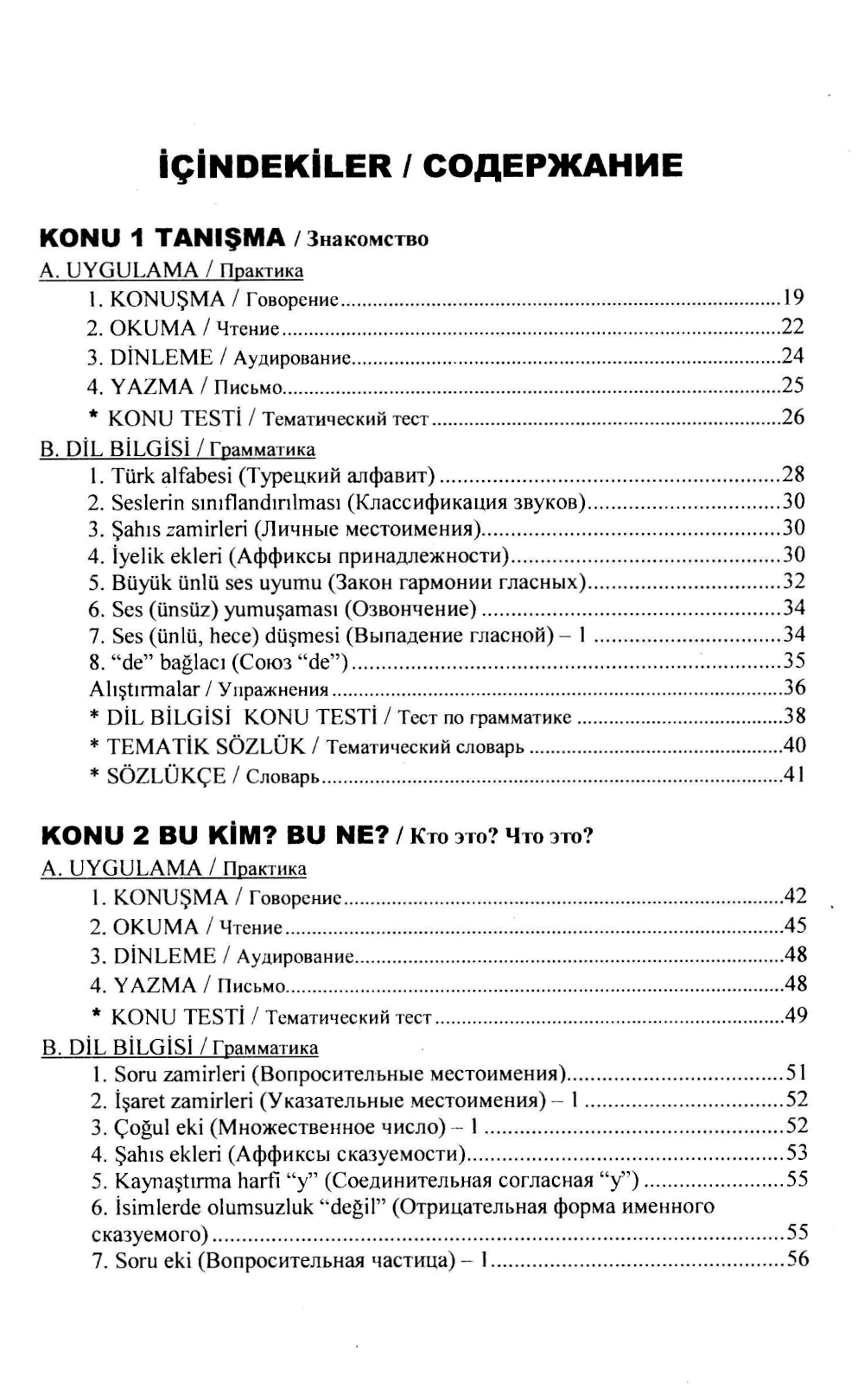 Уникальность данного учебника состоит в том, что он является первым учебным пособием, разработанным турецкими специалистами-преподавателями специально для русскоязычной аудитории. Учебник составлен согласно стандартам Европейского языкового портфеля. Настоящий учебник задуман в виде трехтомного комплекса, каждый том рассчитан на уровни А, В, С1 соответственно. Издание, которое вы держите в руках, предназначено для начального уровня (уровень А). Оно состоит из 24 уроков, предназначенных для изучения в течение одного года при восьми академических часах занятий в неделю. Каждый урок состоит из практической части и грамматического материала; практическая часть включает в себя упражнения на развитие навыков разговорной и письменной речи, чтения и аудирования. Все упражнения, тесты и задания снабжены ключами для более эффективного процесса обучения. Учебник адресован студентам вузов, учащимся языковых курсов, а также широкому кругу лиц, желающих изучать турецкий язык с помощью преподавателя или самостоятельно.| Издательство | ЛЕНАНД |