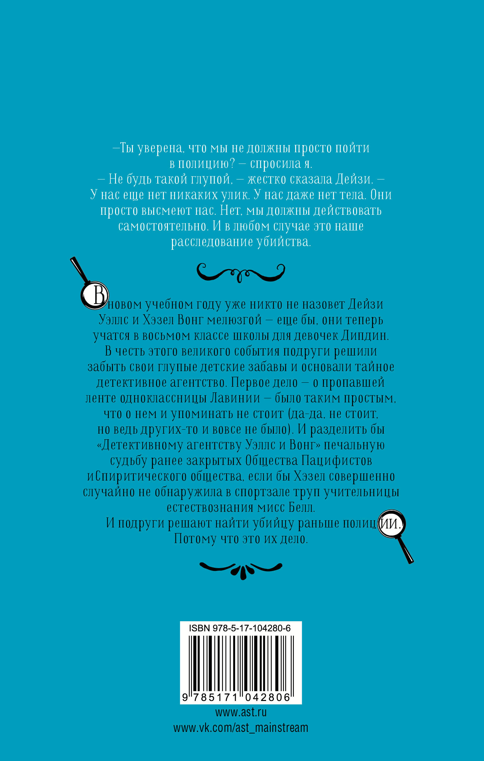В новом учебном году уже никто не назовет Дейзи Уэллс и Хэзел Вонг мелюзгой - еще бы, они теперь учатся в восьмом классе школы для девочек Дипдин. В честь этого великого события подруги решили забыть свои глупые детские забавы и основали тайное детективное агентство. Первое дело - о пропавшей ленте одноклассницы Лавинии - было таким простым, что о нем и упоминать не стоит (да-да, не стоит, но ведь других-то и вовсе не было). И разделить бы "Детективному агентству Уэллс и Вонг" печальную судьбу ранее закрытых Общества Пацифистов и Спиритического общества, если бы Хэзел совершенно случайно не обнаружила в спортзале труп учительницы естествознания мисс Белл. И подруги решают найти убийцу раньше полиции. Потому что это их дело.| Издательство | ИЗДАТЕЛЬСТВО "АСТ" |