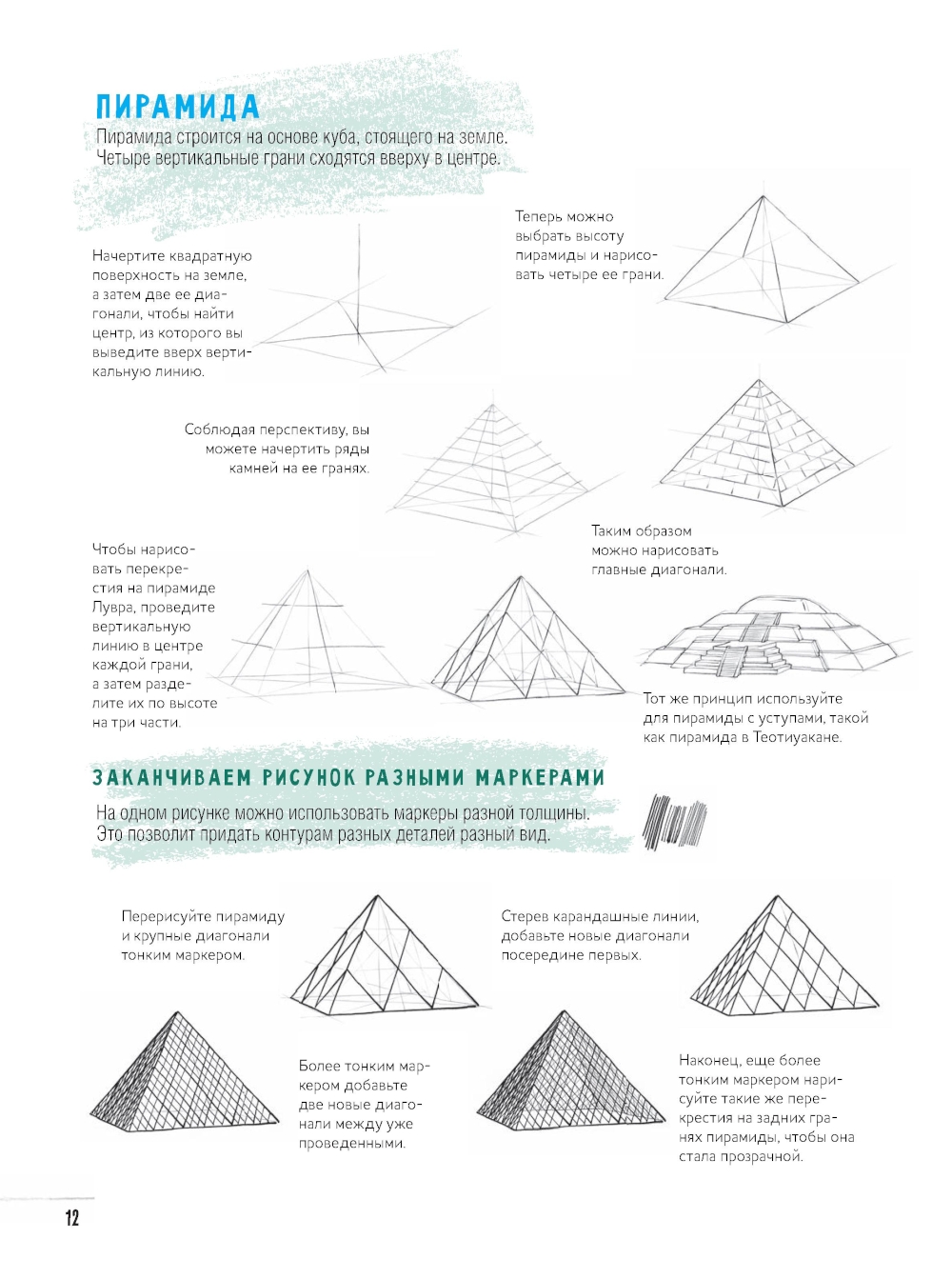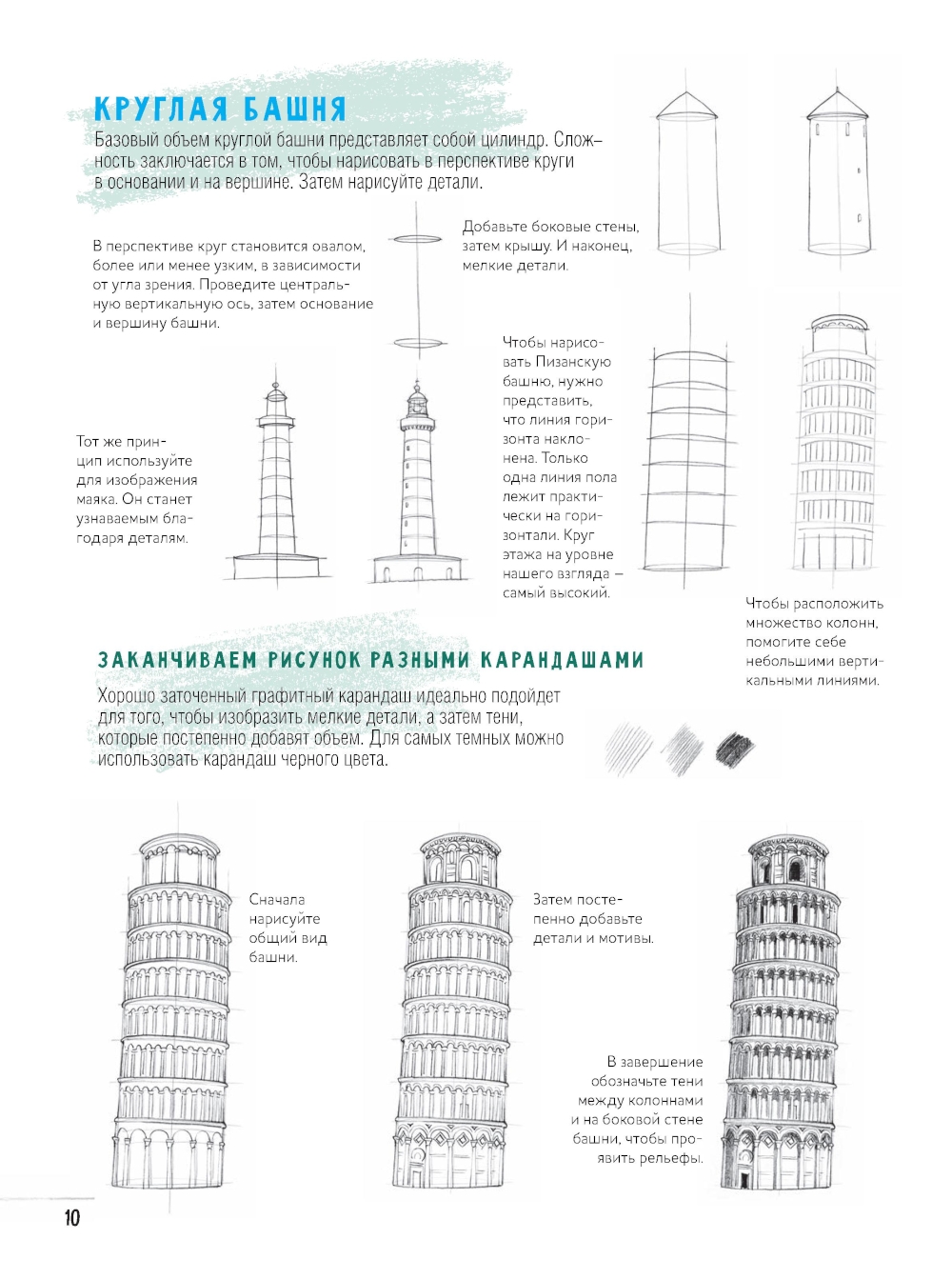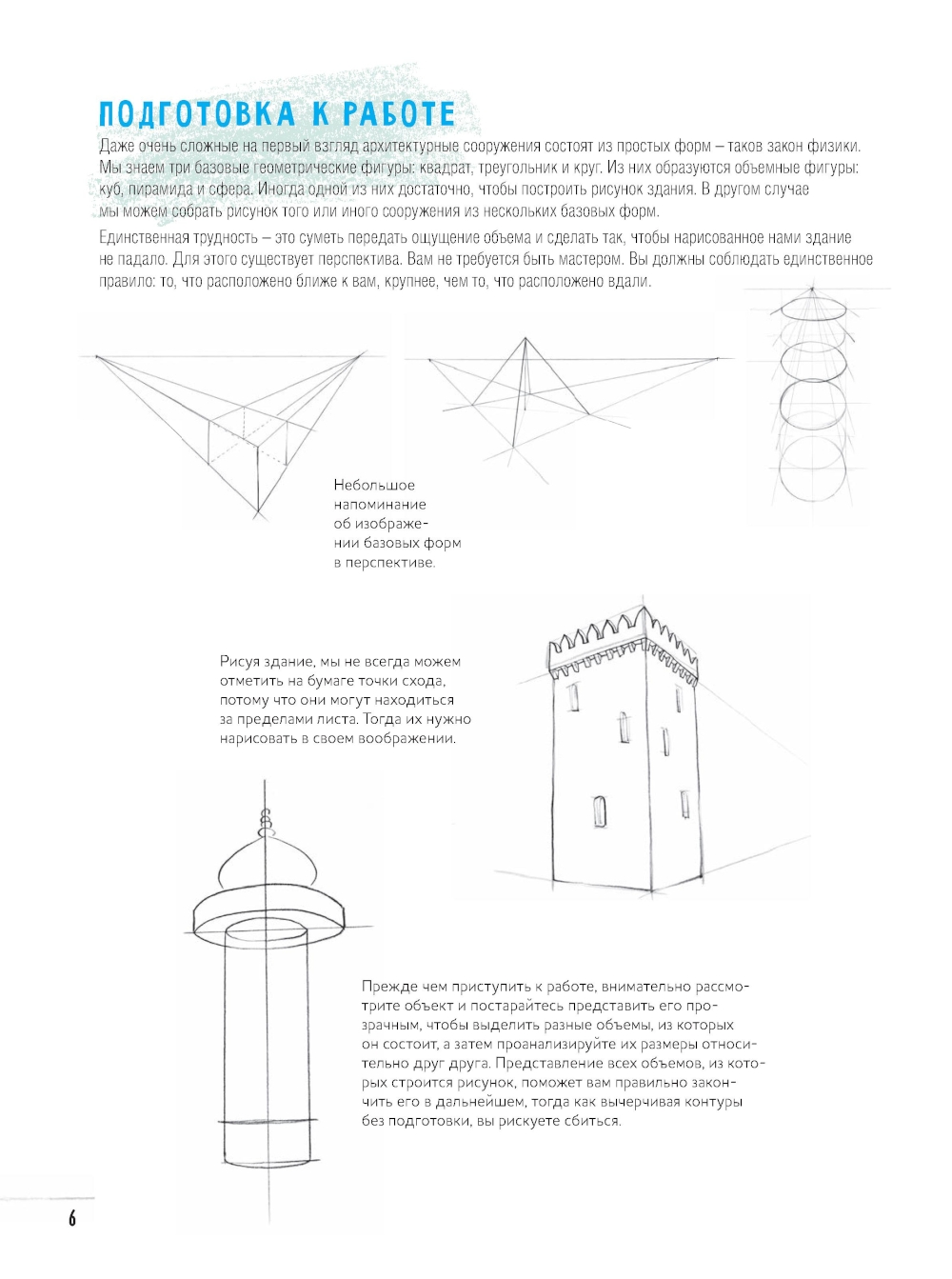 Серия «Скетчбук начинающего художника» от известного иллюстратора Лиз Эрзог воплотила в себе все достоинства современных учебников по рисованию: простоту, наглядность, возможность начать практиковаться прямо на страницах пособия, а также, что немаловажно, компактность и бюджетность. В каждом из этих скетчбуков вас ждет по 50 мастер-классов, выполненных и показанных пошагово и очень подробно. Вы можете повторить каждый рисунок за автором прямо на соседней странице! Остается лишь определиться с выбором рисовальных принадлежностей и... вы готовы приступить к творчеству! В этом скетчбуке вас ждут мастер-классы по рисованию зданий и построек: домов, дворцов, башен, пирамид, замков и т. д. Для простоты и наглядности автор разбивает каждое строение на простые формы и объемы, а затем с помощью различных приемов светотени и перспективы, а также разнообразных принадлежностей, дополняет деталями базовую структуру, превращая на наших глазах несколько объемных геометрических форм, к примеру, в... собор Василия Блаженного! Благодаря тому, что все уроки разбиты на 2-5 простых этапов, вы легко выделите главные моменты. В мастер-классах показаны разные техники завершения рисунка, что позволит придать вашему изображению объем и характер. Просто следуйте указаниям!