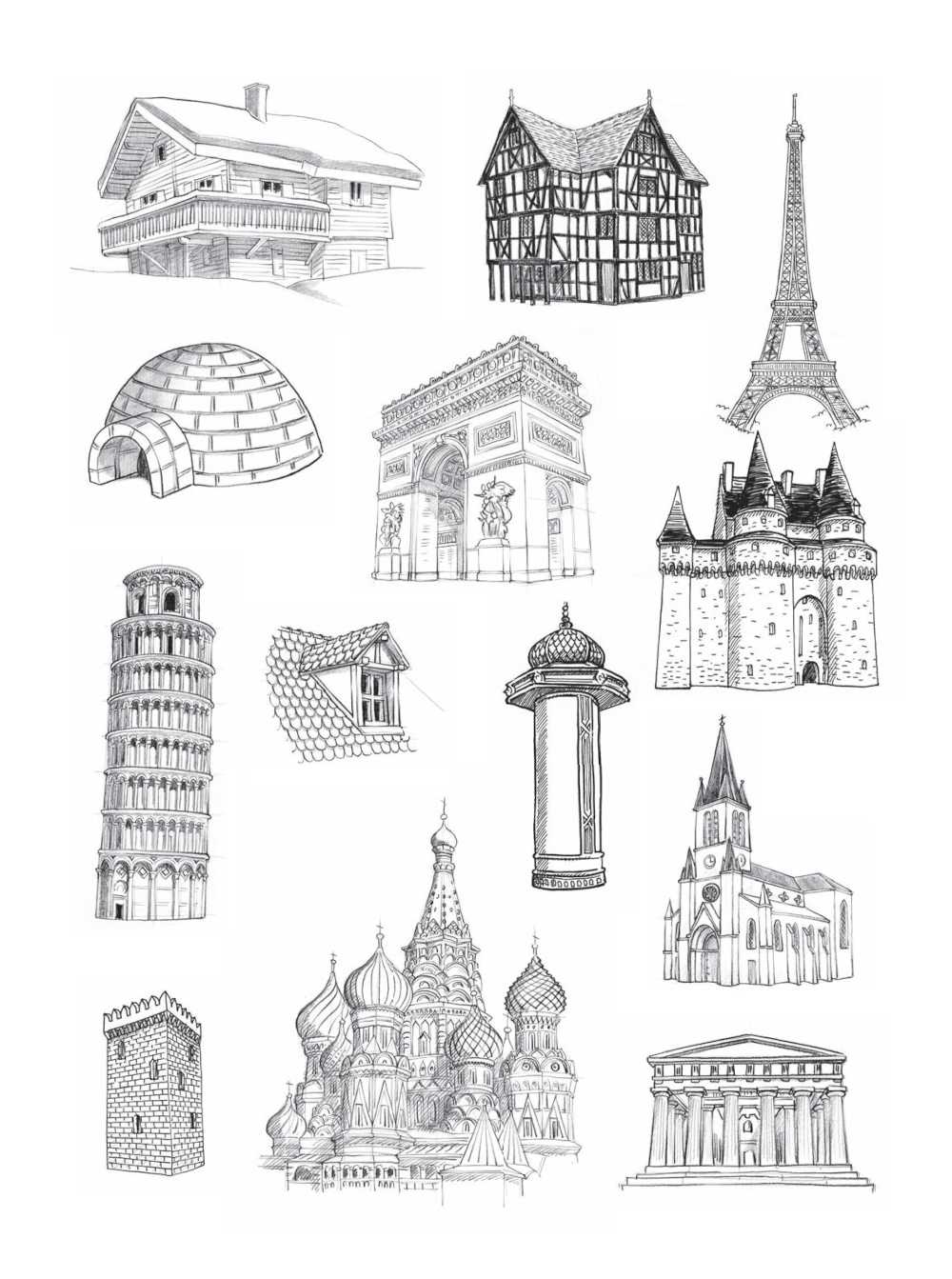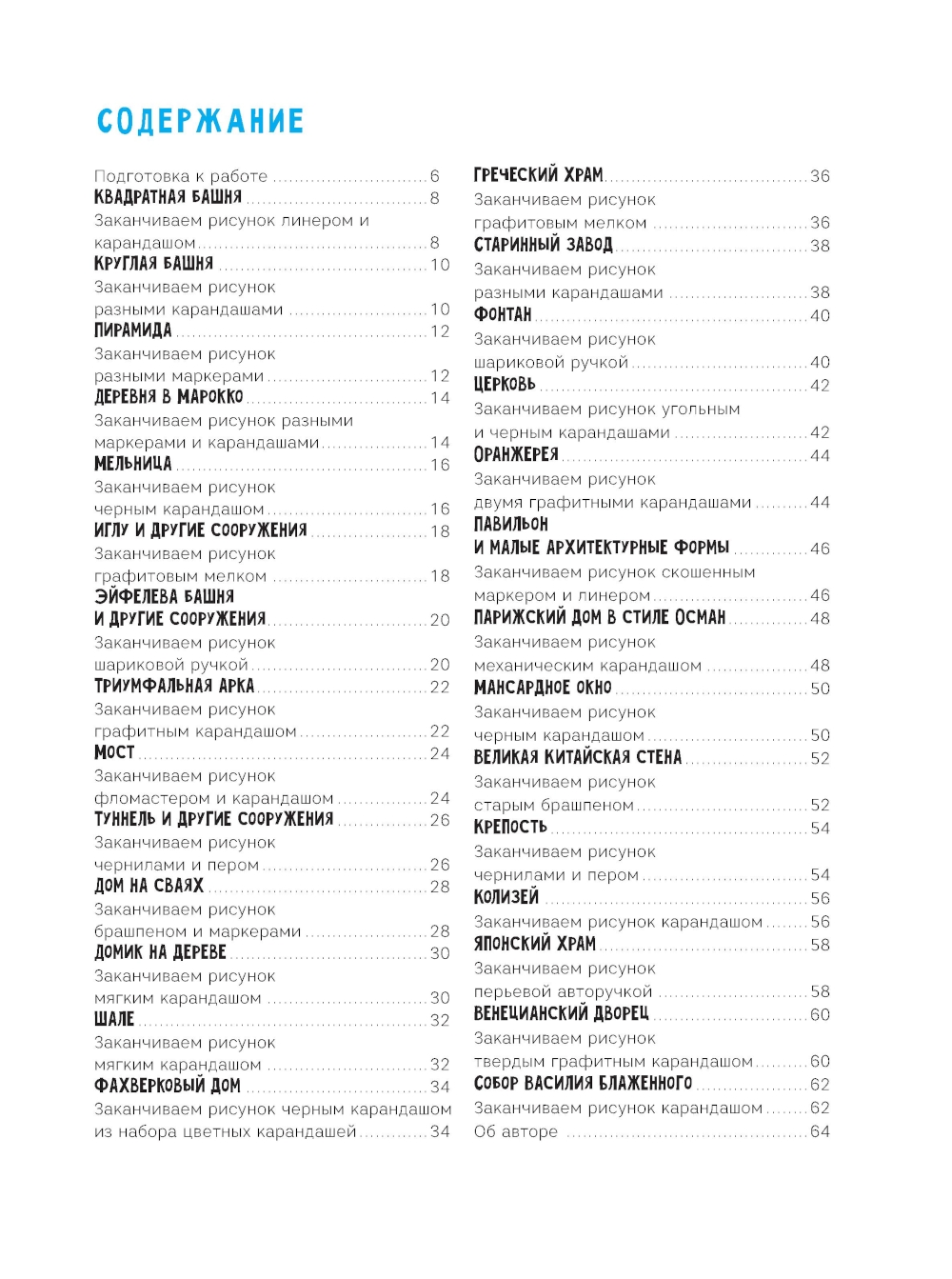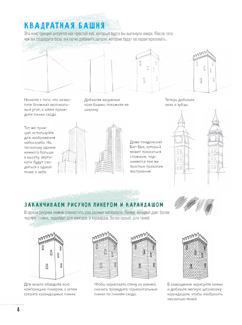 Серия «Скетчбук начинающего художника» от известного иллюстратора Лиз Эрзог воплотила в себе все достоинства современных учебников по рисованию: простоту, наглядность, возможность начать практиковаться прямо на страницах пособия, а также, что немаловажно, компактность и бюджетность. В каждом из этих скетчбуков вас ждет по 50 мастер-классов, выполненных и показанных пошагово и очень подробно. Вы можете повторить каждый рисунок за автором прямо на соседней странице! Остается лишь определиться с выбором рисовальных принадлежностей и... вы готовы приступить к творчеству! В этом скетчбуке вас ждут мастер-классы по рисованию зданий и построек: домов, дворцов, башен, пирамид, замков и т. д. Для простоты и наглядности автор разбивает каждое строение на простые формы и объемы, а затем с помощью различных приемов светотени и перспективы, а также разнообразных принадлежностей, дополняет деталями базовую структуру, превращая на наших глазах несколько объемных геометрических форм, к примеру, в... собор Василия Блаженного! Благодаря тому, что все уроки разбиты на 2-5 простых этапов, вы легко выделите главные моменты. В мастер-классах показаны разные техники завершения рисунка, что позволит придать вашему изображению объем и характер. Просто следуйте указаниям!