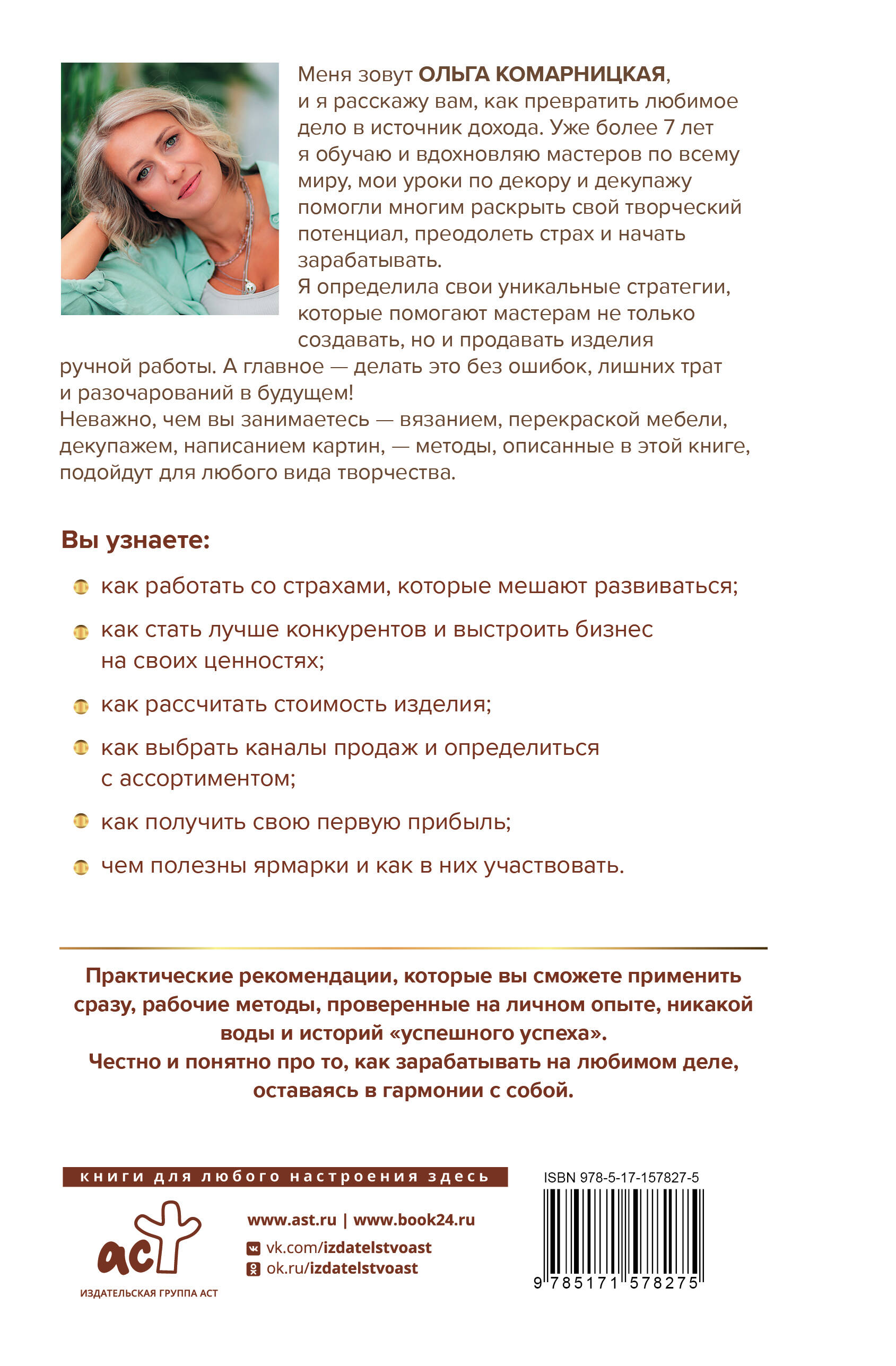 Ольга Комарницкая уже более 7 лет обучает и вдохновляет мастеров по всему миру, ее уроки по декору и декупажу помогли многим раскрыть творческий потенциал, преодолеть страх и начать зарабатывать. Неважно, чем вы занимаетесь: вязанием, перекраской мебели, декупажем, написанием картин - методы, описанные в этой книге, подойдут для любого вида творчества. Вы узнаете, как работать со страхами, которые мешают развиваться и выстроить бизнес на продаже handmade изделий, а также как рассчитать стоимость изделия, выбрать каналы продаж, определиться с ассортиментом и многое другое. Практические рекомендации, которые вы сможете применить сразу, рабочие методы, проверенные на личном опыте, никакой воды и историй "успешного успеха". Только безграничная любовь к своему делу!| Издательство | Издательство "АСТ" |
