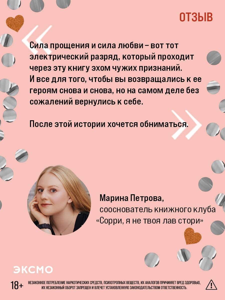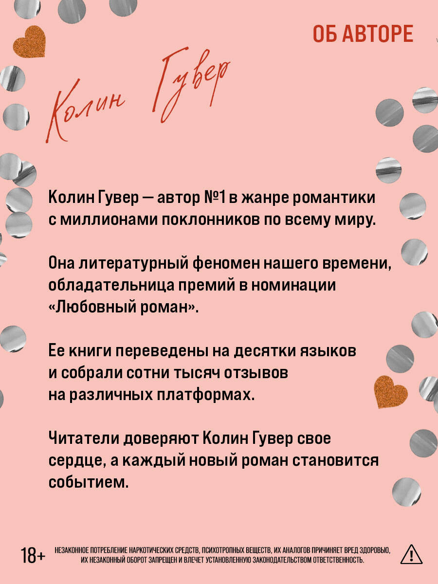 Лимитированное издание мирового бестселлера Колин Гувер, покорившего миллионы читательских сердец. Цветной обрез и сияющая фольга на обложке. ЧИТАЙТЕ КНИГУ - СМОТРИТЕ ФИЛЬМ. В ГЛАВНЫХ РОЛЯХ МАККЕННА ГРЕЙС, ЭЛЛИСОН УИЛЬЯМС, ДЭЙВ ФРАНКО И МЭЙСОН ТЕМЗ. Это трогательная история о семье, первой любви и ошибках, о которых мы так часто сожалеем. Но пока рядом близкие, всегда остается возможность все исправить и начать сначала. Морган и ее шестнадцатилетняя дочь Клара стараются не быть похожими друг на друга. Мать мечтает уберечь дочь от своих ошибок, а дочь не хочет жить по примеру матери, считая ее слишком предсказуемой. Их разногласия мешают найти общий язык, и только Крис - муж Морган и отец Клары - удерживает семью вместе. Но трагическая авария рушит этот хрупкий мир. Пытаясь собрать осколки разрушенной жизни, Морган неожиданно находит утешение в человеке, от которого не ждала поддержки, а Клара обращается к парню, с которым ей запрещено встречаться. И пускай тайны и недопонимание отдаляют мать и дочь, именно этот путь помогает им по-настоящему узнать и понять друг друга. «Я люблю тебя потому, что ничего не могу с собой поделать, и одна мысль об этом приносит мне радость. Я не жалею ни о чем. И не буду жалеть». НЕЗАКОННОЕ ПОТРЕБЛЕНИЕ НАРКОТИЧЕСКИХ СРЕДСТВ, ПСИХОТРОПНЫХ ВЕЩЕСТВ, ИХ АНАЛОГОВ ПРИЧИНЯЕТ ВРЕД ЗДОРОВЬЮ, ИХ НЕЗАКОННЫЙ ОБОРОТ ЗАПРЕЩЕН И ВЛЕЧЕТ УСТАНОВЛЕННУЮ ЗАКОНОДАТЕЛЬСТВОМ ОТВЕТСТВЕННОСТЬ.| Издательство | ООО "Издательство "Эксмо" |