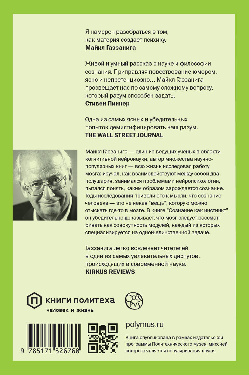 "Отец когнитивной неврологии" Майкл Газзаннига освещает прошлое, настоящее и будущее оппозиции "сознание - мозг". Газзанига начинает с изложения основных теорий сознания. Существуют редукционисты и материалисты, которые считают, что психические состояния и сознание возникают из материальных взаимодействий между нейронами, атомами и молекулами. Затем, следуя Декарту, появились дуалисты. Для дуалистов ментальные состояния, разум и душа отделены от физического тела и мозга. Существует и третья теория, называемая ментализмом. Менталисты, такие как Роджер Сперри и сам Майкл Газзанига, считают, что ментальное состояние и сознание могут влиять на физический мозг и изменять его. Газзанига предлагает новую парадигму, позволяющую освободиться от старых прений между материализмом и дуализмом. Она основана на последних открытиях в области работы мозга, а также на его наблюдениях за тем, как функционируют люди с нарушенной мозговой деятельностью. Вкратце, его идея состоит в том, что мозг - это система модулей, работающих самостоятельно, но сообща. "Сознание как инстинкт" - это захватывающая книга, написанная доступным языком, в которой изложены идеи ученого, работающего на передовой в области неврологии.| Издательство | АСТ |