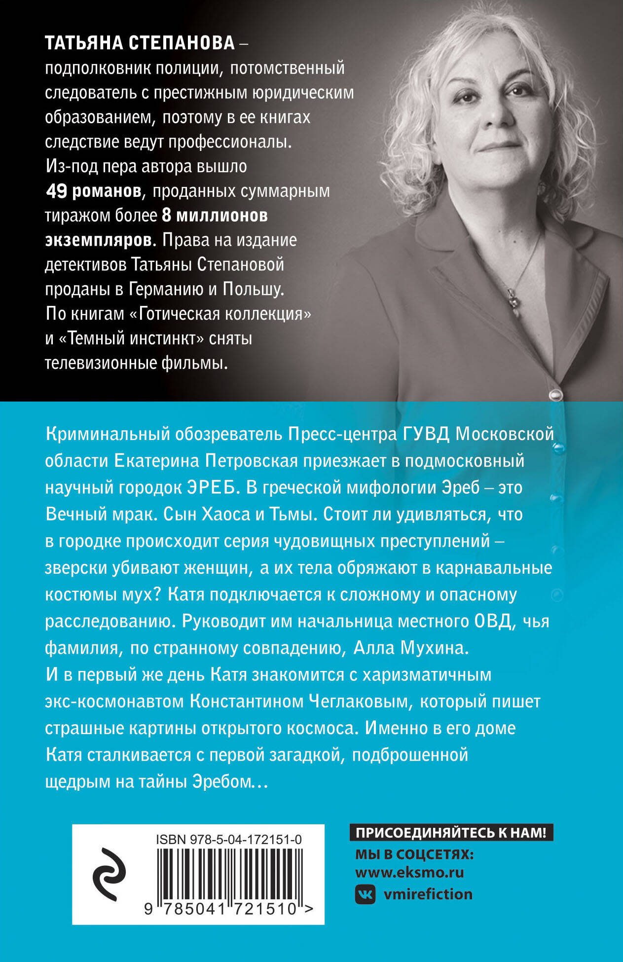 Криминальный обозреватель Пресс-центра ГУВД Московской области Екатерина Петровская приезжает в подмосковный научный городок ЭРЕБ. В греческой мифологии Эреб - это Вечный мрак. Сын Хаоса и Тьмы. Стоит ли удивляться, что в городке происходит серия чудовищных преступлений - зверски убивают женщин, а их тела обряжают в карнавальные костюмы мух? Катя подключается к сложному и опасному расследованию. Руководит им начальница местного ОВД, чья фамилия, по странному совпадению - Алла Мухина. И в первый же день Катя знакомится с харизматичным экс-космонавтом Константином Чеглаковым, который пишет страшные картины открытого космоса. Именно в его доме Катя сталкивается с первой загадкой, подброшенной щедрым на тайны Эребом… Романы потомственного следователя Татьяны Степановой позволяют читателю побывать в литературной «комнате страха». Таинственные убийства, почти осязаемая атмосфера преступления, томительное и тревожное ожидание чего-то неведомого, пугающего... Все это Татьяне Степановой удается воспроизвести просто блестяще. Случайные встречи, повседневные дела, незначительные детали изображаются в ее детективах в каком-то особом, драматическом свете, словно безобидный весенний луг перед стремительно надвигающейся грозой.| Издательство | ООО "Издательство "Эксмо" |