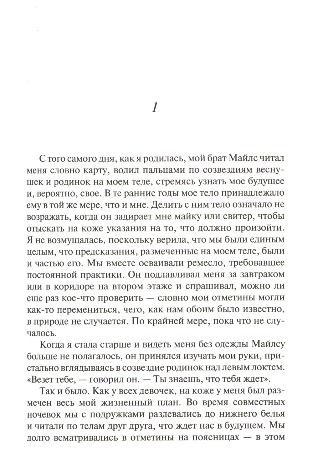 Селесте Мортон очень хочется повзрослеть. Как и все девочки, она родилась со множеством родинок, веснушек и родимых пятен, способных определить будущее: ее и близких ей людей, - а с наступлением зрелости появятся новые предсказания и укрепят пророчество. Но вместе с ожиданием приходит и страх - в период «превращения» девочки становятся неотразимы для мужчин. Брат Селесты, Майлс, - талантливый чтец будущего, что несвойственно мужчинам, - собирается тренироваться на сестре, чтобы прочитать свою судьбу. Когда Селеста меняется, раскрывается секрет, способный разрушить Майлса, разрушить семью, разрушить все... На что они пойдут, чтобы создать по-настоящему свое будущее?| Издательство | Эксмо |
