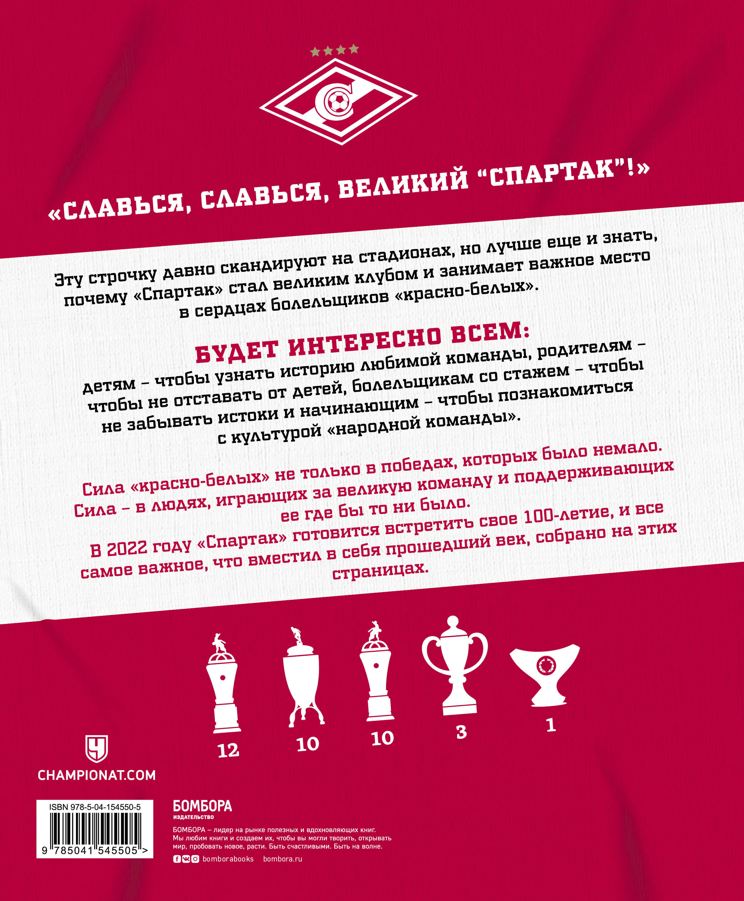 К 100-летию великого клуба «Спартак»! Книга-энциклопедия по истории клуба для всей семьи. Для детей, которые хотят узнать больше о любимой «народной команде», и для родителей, чтобы не отставать от детей. Будь то новичок или болельщик со стажем, каждый найдёт для себя интересные факты и события, о которых не слышал ранее. Время познакомиться с культурой «красно-белых». «Наш «Спартак» - великий клуб, это знают все вокруг!»| Издательство | ООО "Издательство "Эксмо" |
