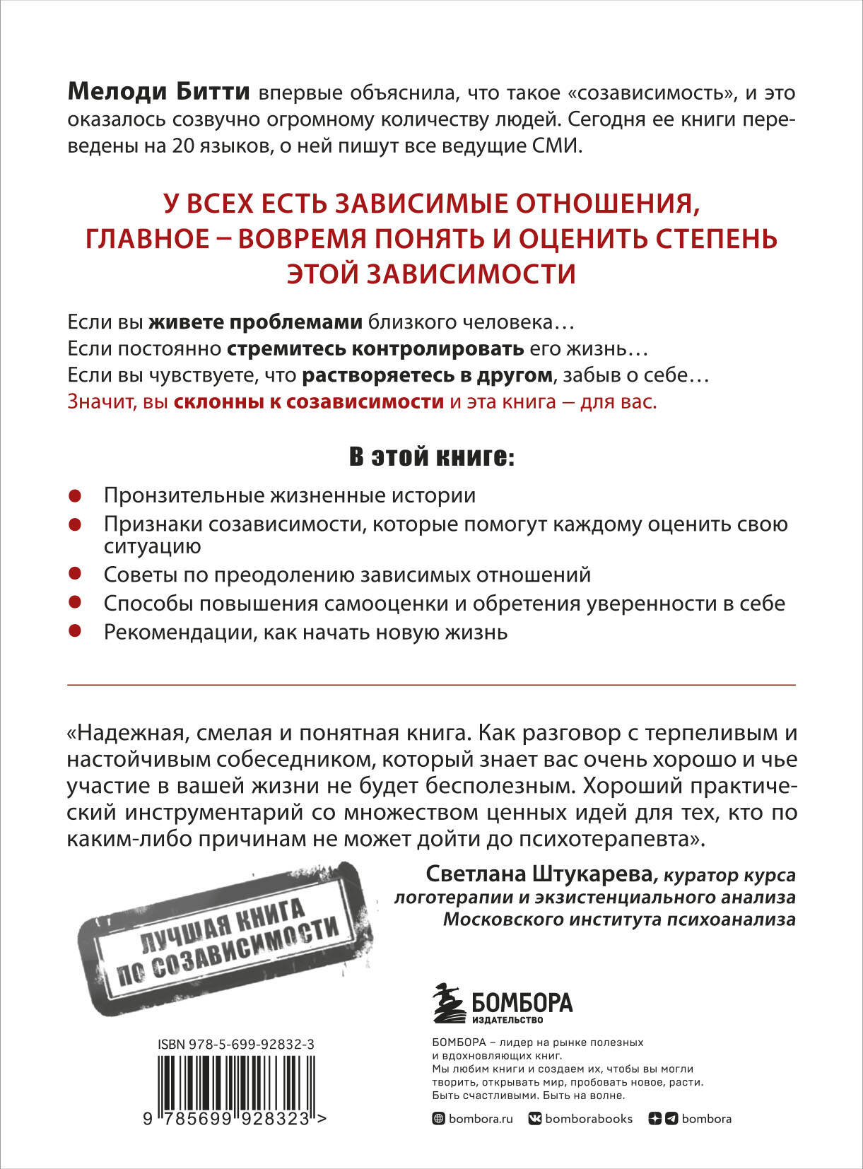 Если вы живете проблемами близкого человека, если постоянно стремитесь контролировать его жизнь, если чувствуете, что растворяетесь в другом, забыв о себе - значит, вы склонны к созависимости. И эта книга, ставшая международным бестселлером - для вас. Мелоди Битти впервые популярно объяснила, что такое созависимость, и это оказалось созвучно огромному количеству людей. В книге вы найдете: пронзительные жизненные истории; признаки созависимости, которые помогут каждому оценить свою ситуацию; советы по преодолению зависимых отношений; рекомендации, как начать новую жизнь.