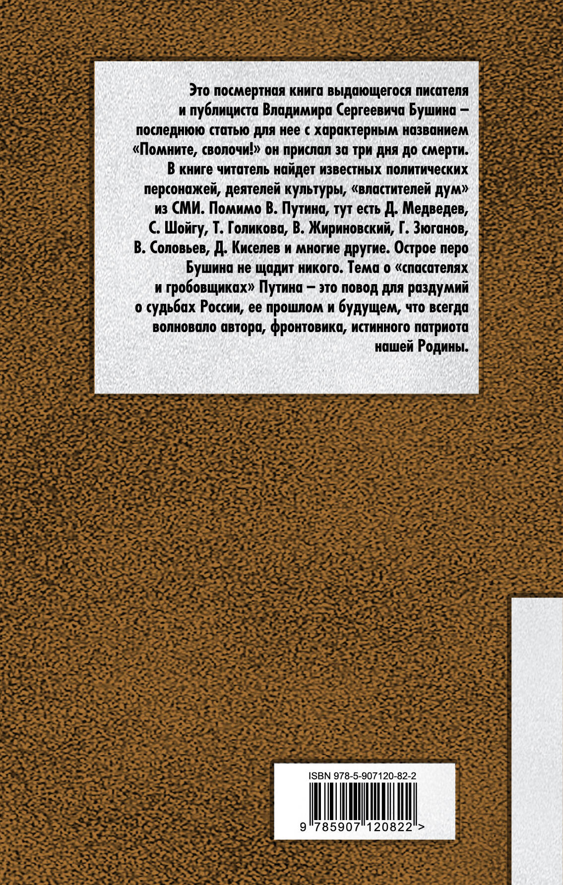 Это посмертная книга выдающегося писателя и публициста Владимира Сергеевича Бушина - последнюю статью для нее с характерным названием «Помните, сволочи!» он прислал за три дня до смерти. В книге читатель найдет известных политических персонажей, деятелей культуры, «властителей дум» из СМИ. Помимо В. Путина, тут есть Д.. Медведев, С. Шойгу, Т. Голикова, В. Жириновский, Г. Зюганов, В. Соловьев, Д. Киселев и многие другие. Острое перо Бушина не щадит никого - тема о «спасателях и гробовщиках» Путина это повод для раздумий о судьбах России, ее прошлом и будущем, что всегда волновало автора, фронтовика, истинного патриота нашей Родины.
