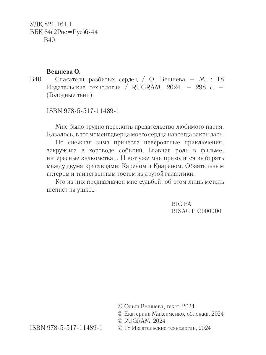 Мне было трудно пережить предательство любимого парня. Казалось, в тот момент дверца моего сердца навсегда закрылась. Но снежная зима принесла невероятные приключения, закружила в хороводе событий. Главная роль в фильме, интересные знакомства... И вот уже мне приходится выбирать между двумя красавцами: Кареном и Киареном. Обаятельным актером и таинственным гостем из другой галактики. Кто из них предназначен мне судьбой, об этом лишь метель шепнет на ушко…| Издательство | Т8 RUGRAM |