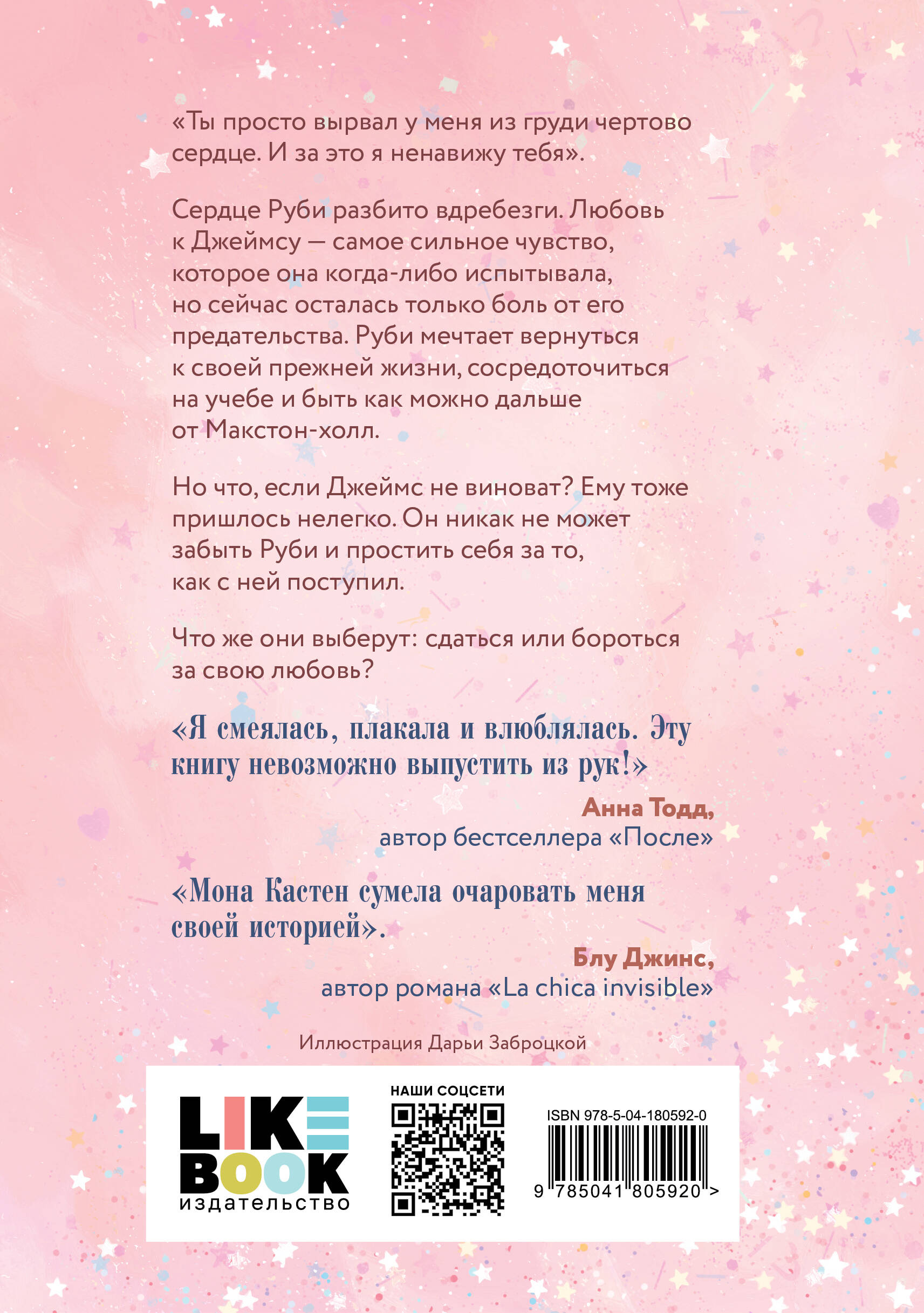 Лимитированное издание самой популярной романтической трилогии Моны Кастен. Невероятной красоты оформление: шикарная иллюстрация от Дарьи Заброцкой, закрашенный обрез с блестками. Абсолютный бестселлер! Тираж книг Моны Кастен уже перевалил отметку в 460 000 экземпляров в России и 2 млн экземпляров в Германии! Сердце Руби разбито вдребезги. Любовь к Джеймсу - самое сильное чувство, которое она когда-либо испытывала, но сейчас осталась только боль от его предательства. Руби мечтает вернуться к своей прежней жизни, сосредоточиться на учебе и быть как можно дальше от Макстон-холл. Но что, если Джеймс не виноват? Ему тоже пришлось нелегко. Он никак не может забыть Руби и простить себя за то, как с ней поступил. Что же они выберут: сдаться или бороться за свою любовь? «Я смеялась, плакала и влюблялась. Эту книгу невозможно выпустить из рук!» - Анна Тодд, автор бестселлера «После» «Мона Кастен сумела очаровать меня своей историей». - Блу Джинс, автор романа «La chica invisible»| Издательство | ООО "Издательство "Эксмо" |