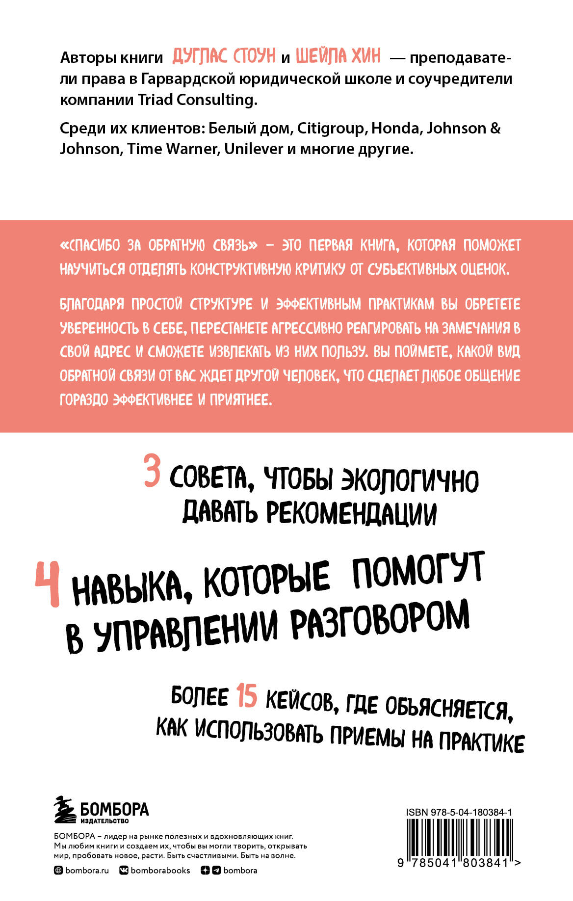 Мы получаем обратную связь каждый день. От друзей и семьи, коллег, клиентов и руководителей, учителей и незнакомых людей. Нас оценивают, хвалят и критикуют по поводу работы, характера и внешнего вида. Но часто даже нейтральные слова оставляют неприятный осадок. А предложения коллеги или друга переделать что-то в себе или в работе воспринимаем как личную обиду и надолго уходим в свою раковину. Почему? Потому что не знаем, как реагировать. Да, мы хотим учиться и расти, но в то же время требуем, чтобы нас принимали такими, какие мы есть. Спасибо за обратную связь - первая книга, которая поможет научиться отделять конструктивную критику от субъективных оценок. Благодаря простой структуре и эффективным практикам вы обретете уверенность в себе, перестанете агрессивно реагировать на замечания в свой адрес и сможете извлекать из них пользу. Вы поймете, какой вид обратной связи от вас ждет другой человек, что сделает любое общение гораздо эффективнее и приятнее. Узнаете, как стать лучше с помощью негативной обратной связи, почему люди видят недостатки, которых не видим мы, и какие 4 навыка сделают вас мастером общения. Авторы книги Дуглас Стоун и Шейла Хин - преподаватели права в Гарвардской юридической школе и соучредители компании Triad Consulting. Среди их клиентов: Белый дом, Citigroup, Honda, Johnson & Johnson, Time Warner, Unilever и многие другие. Они расскажут вам: - Как стать лучше с помощью негативной обратной связи. - Почему люди видят недостатки, которых не видим мы. - Какие четыре навыка помогут в управлении разговором. - Как подготовить себя к переменам в жизни. - Как вывести личные отношения на новый уровень. ОТЗЫВ «Как преподаватель ВШЭ и бизнес-тренер для многих компаний, я регулярно сталкиваюсь с проблемой чрезмерной эмоциональной реакции слушателей на мои замечания. Благодаря этой книге я понял ошибки своих учеников, когда они слышали от меня наставления. Осознал свои недочеты, а главное - получил конкретную инструкцию, как давать обратную связь. Чтобы меня воспринимали как выдающегося наставника, а мои воспитанники стали успешными с помощью моих рекомендаций». - Алексей Макаров, топ-менеджер с 30-летним стажем| Издательство | ООО "Издательство "Эксмо" |