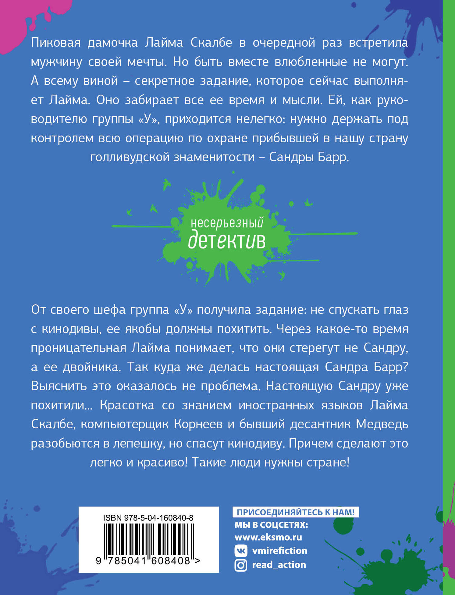 Галина Куликова входит в ТОП-15 самых читаемых отечественных авторов! В изящных детективах Галины Куликовой вас ждет стремительный вихрь приключений, остроумная комедия обстоятельств, невероятные трюки и очарование всепобеждающей женской логики! Пиковая дамочка Лайма Скалбе в очередной раз встретила мужчину своей мечты. Но быть вместе влюбленные не могут. А всему виной - секретное задание, которое сейчас выполняет Лайма. Оно забирает все ее время и мысли. Ей как руководителю группы «У» приходится нелегко - нужно держать под контролем всю операцию по охране прибывшей в нашу страну голливудской знаменитости - Сандры Барр. От своего шефа группа «У» получила задание: не спускать глаз с кинодивы, ее якобы должны похитить. Через какое-то время проницательная Лайма понимает, что они стерегут не Сандру, а ее двойника. Так куда же делась настоящая Сандра Барр? Выяснить это оказалось не проблема. Настоящую Сандру уже похитили... Красотка со знанием иностранных языков Лайма Скалбе, компьютерщик Корнеев и бывший десантник Медведь разобьются в лепешку, но спасут кинодиву. Причем сделают это легко и красиво! Такие люди нужны стране!| Издательство | ООО "Издательство "Эксмо" |